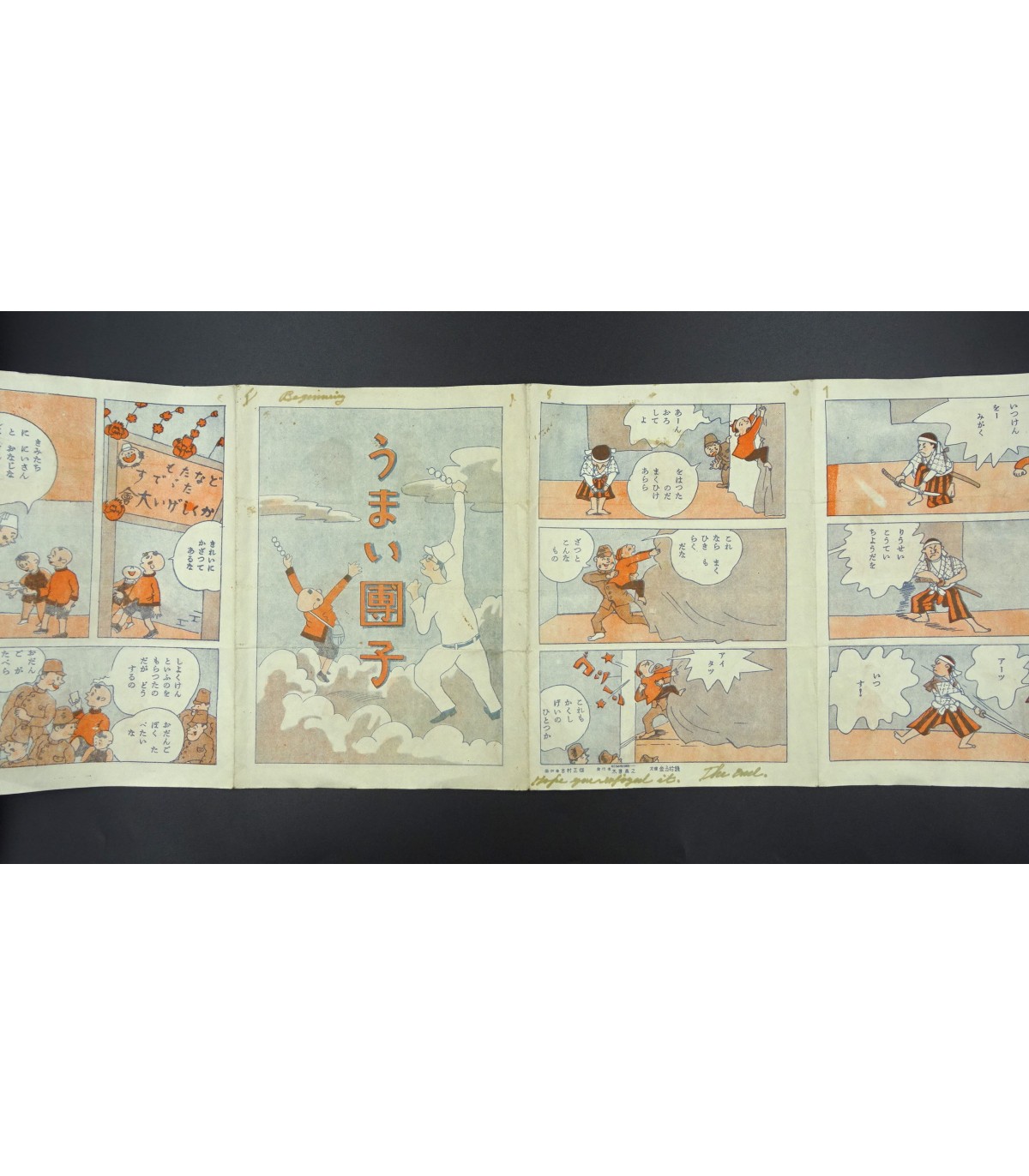 Kinderschwert (ca. 39 cm) und Comic (Samurai und Soldaten), kleiner japanischer Wimpel, 4 handbemalte Seidenbeutel, ein dekoratives Seidentaschentuch, das einen Samurai darstellt. Interessant. SEI.
