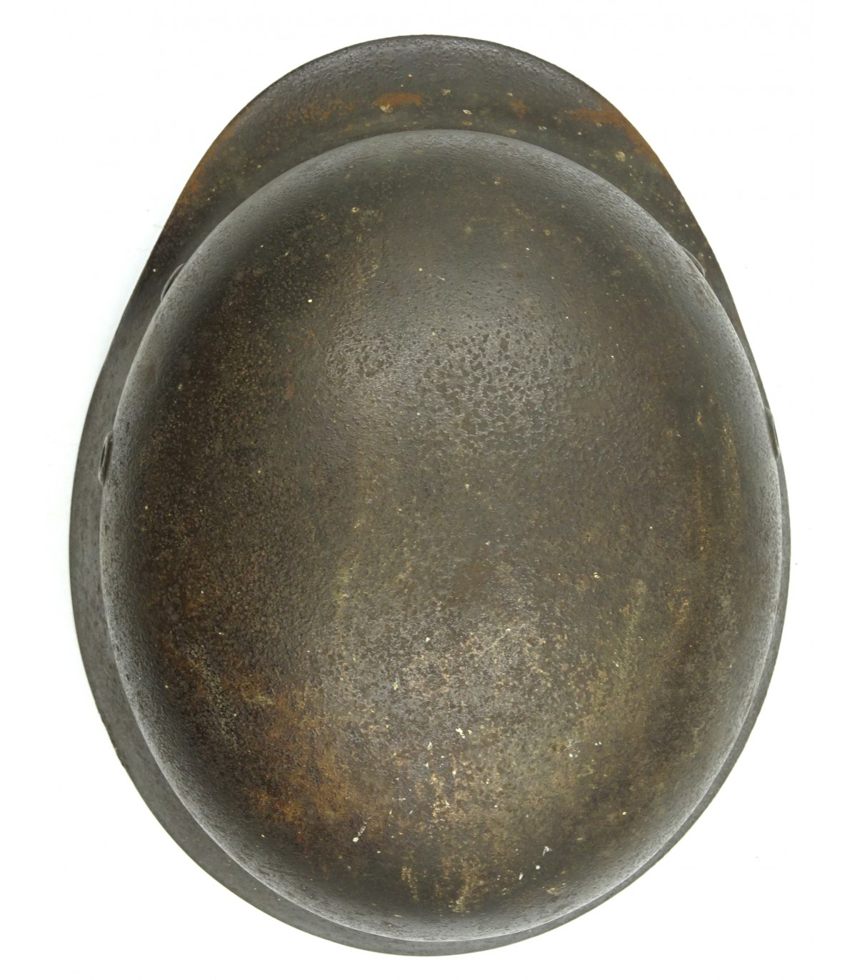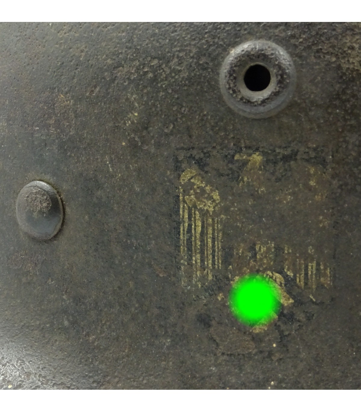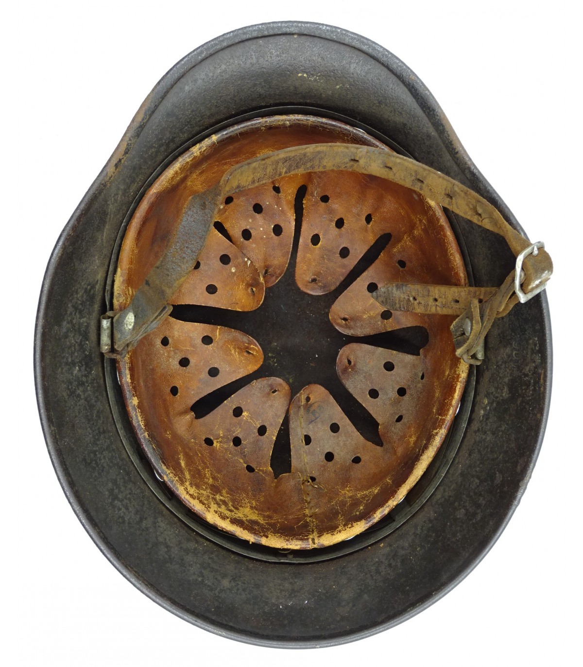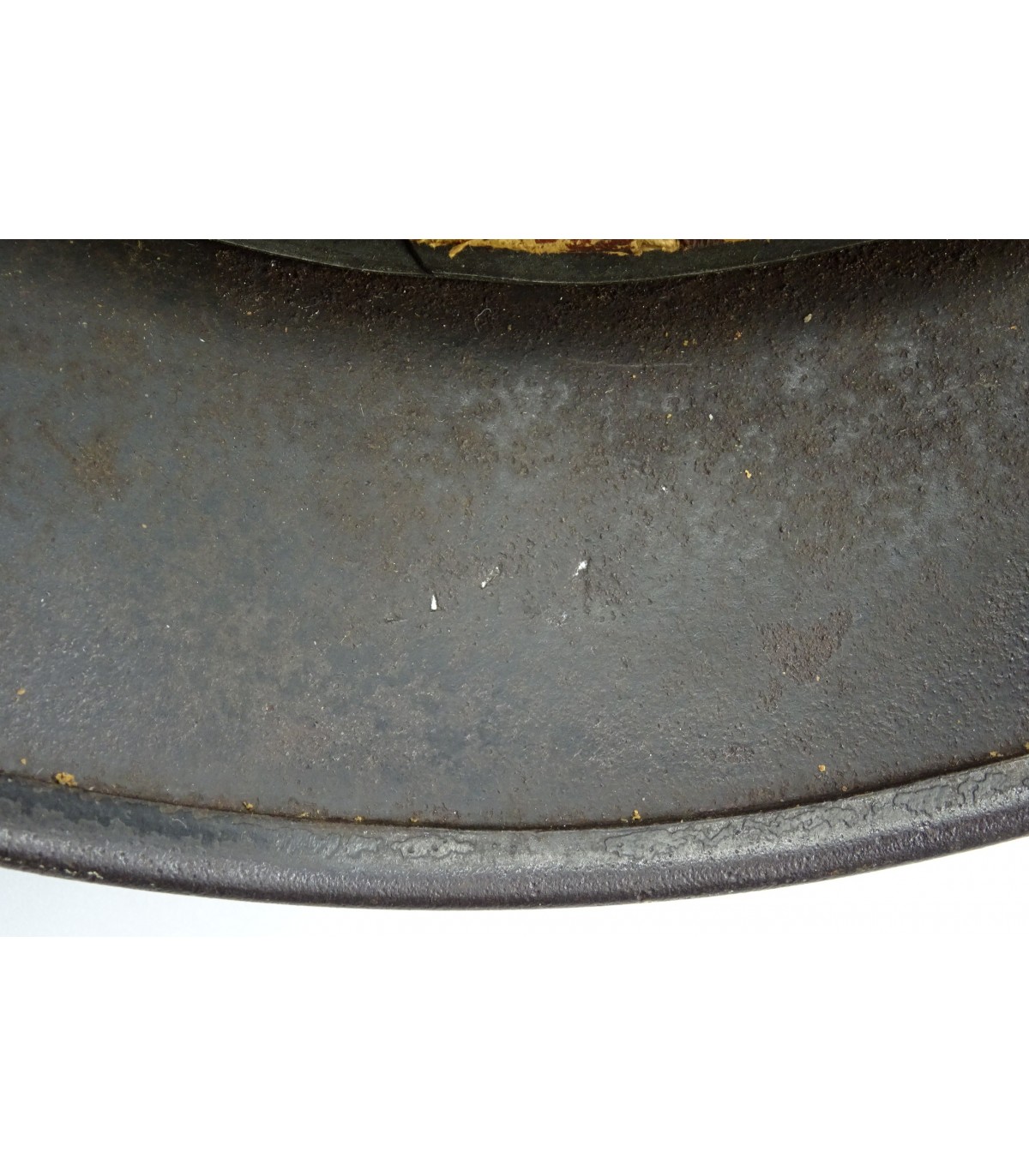 Q64, #schlecht lesbar, vollständig. Größe 56. Feldgraue Lackierung zu 90%. Adler WH zu 50%. Kinnriemen Mle 35 mit Alu-Beschlägen. Guter Kampfhelm. BE-.
