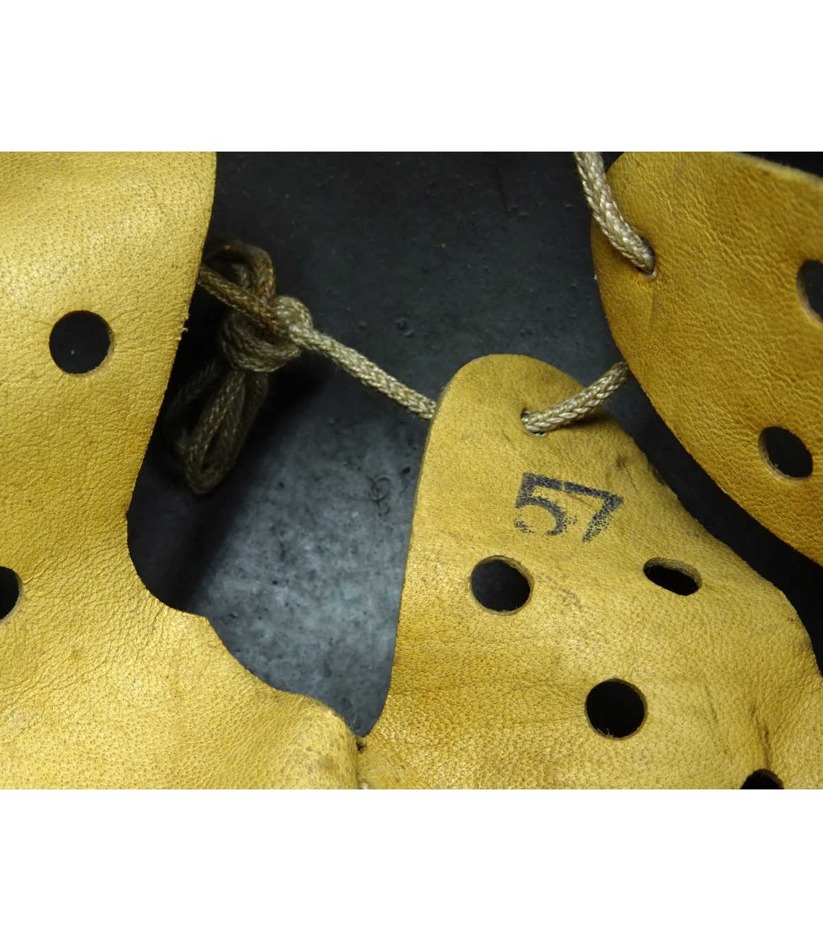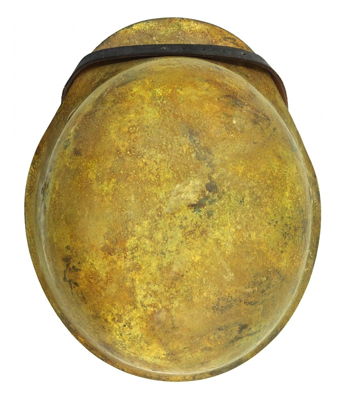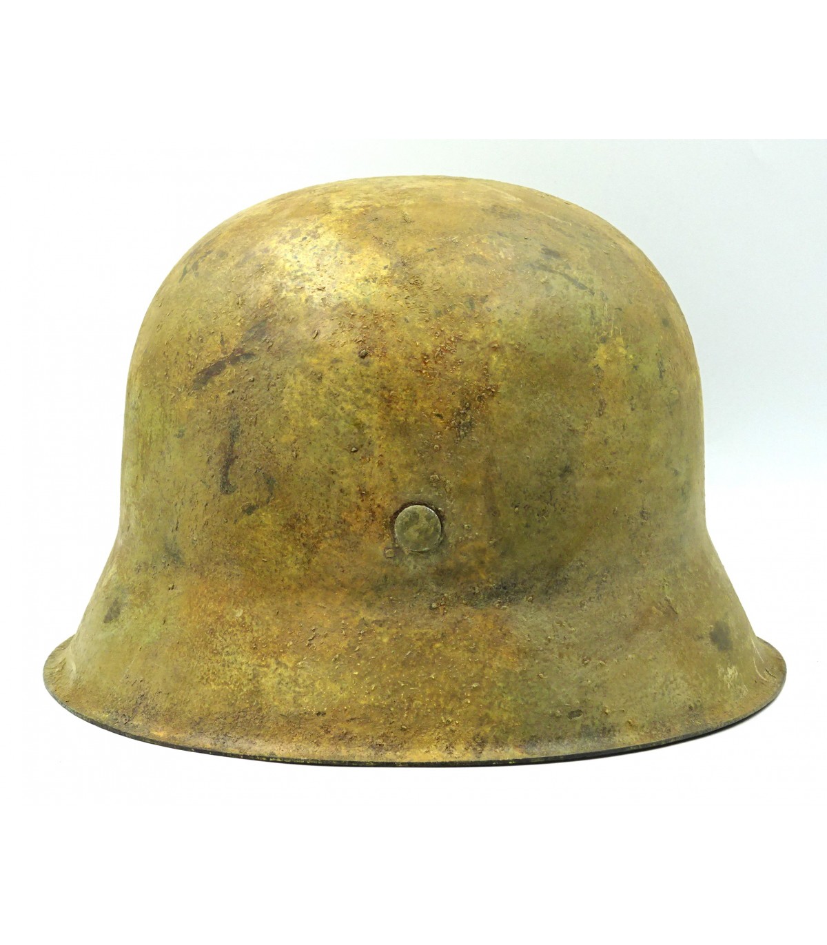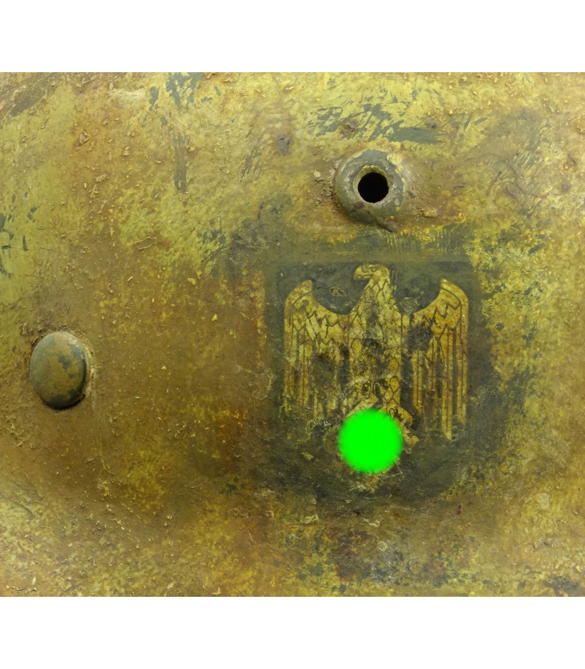 Vollständig. Unleserlicher Herstellercode, Größe 64, Los 5893. Größe 57. Feldgraue Bemalung mit 90-95% sandfarbener rauer Tarnfarbe überzogen, 70% WH-Adler. Helles und weiches Helmleder in außergewöhnlichem Zustand. Weicher Kinnriemen ohne Markierung. Afrika, Italien. TBE.