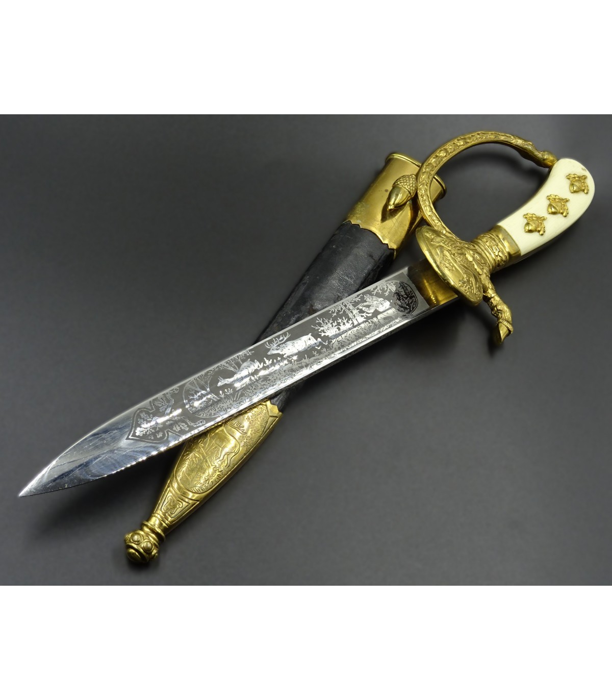 Klinge mit beidseitiger Ätzung. Beschläge aus vergoldeter Bronze. Leder der Scheide ABE, sonst TBE.