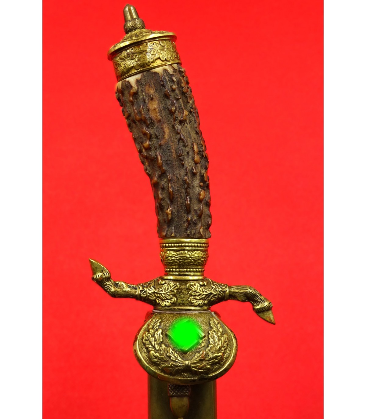 Schöne Klinge mit beidseitig geätzten Jagdmotiven. Bronzebeschläge, Griff aus Horn. Scheide aus Leder. Länge 43 cm. Sehr selten. TBE.