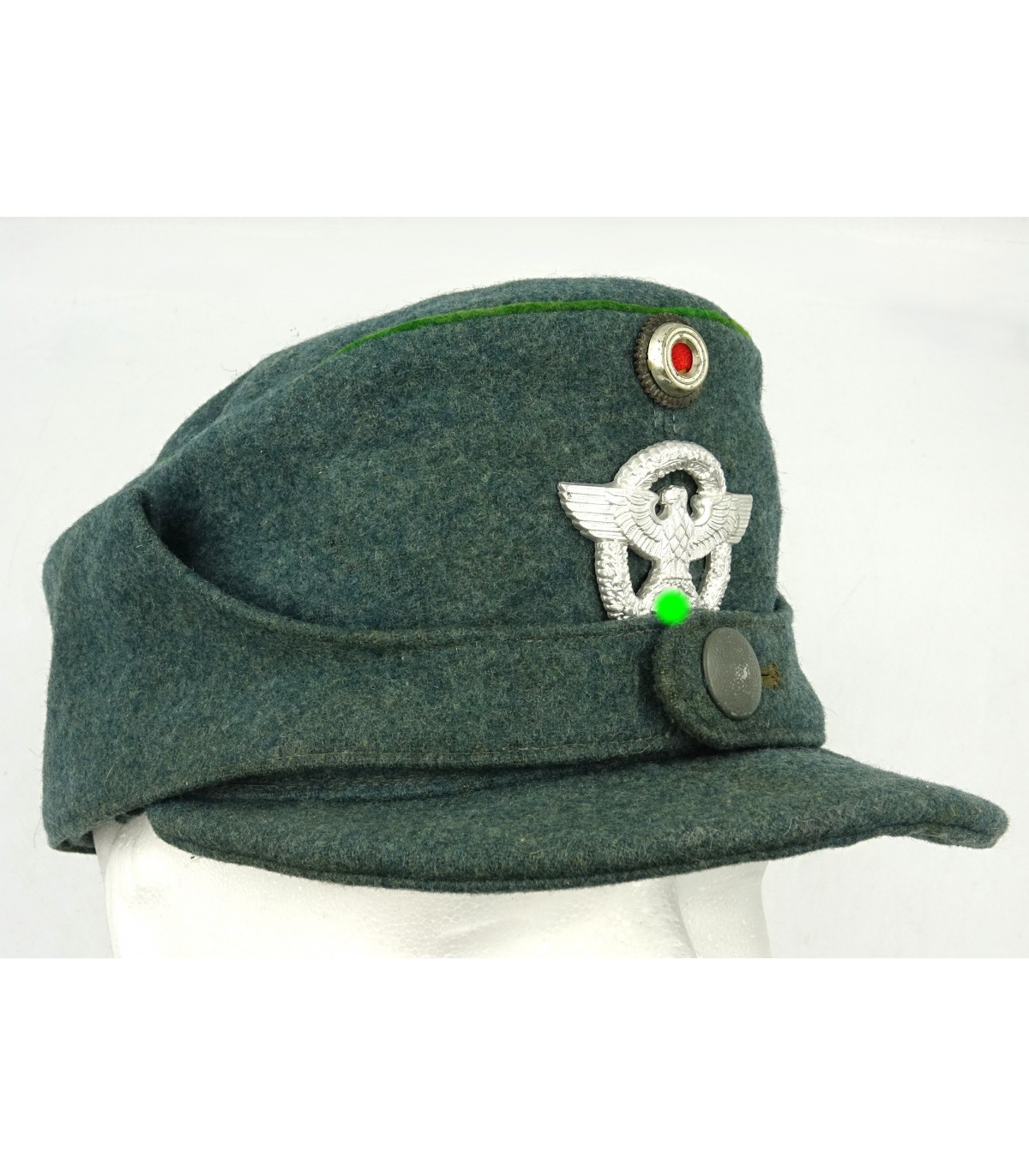 Vollständig. Klappe mit einem Knopf. Abzeichen auf der Vorderseite aus Alu. Edelweiß an der Seite. Paspelierung in polizeigrün. Schweißband aus hellem Leder. Größe 57. Abgenommen im Jahr 1942. TBE.