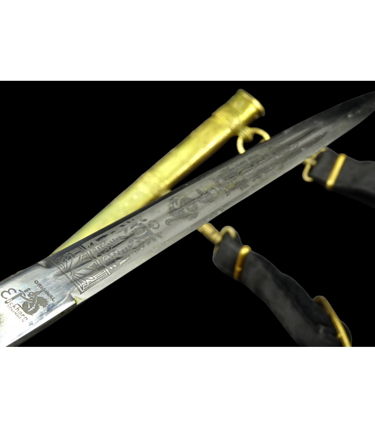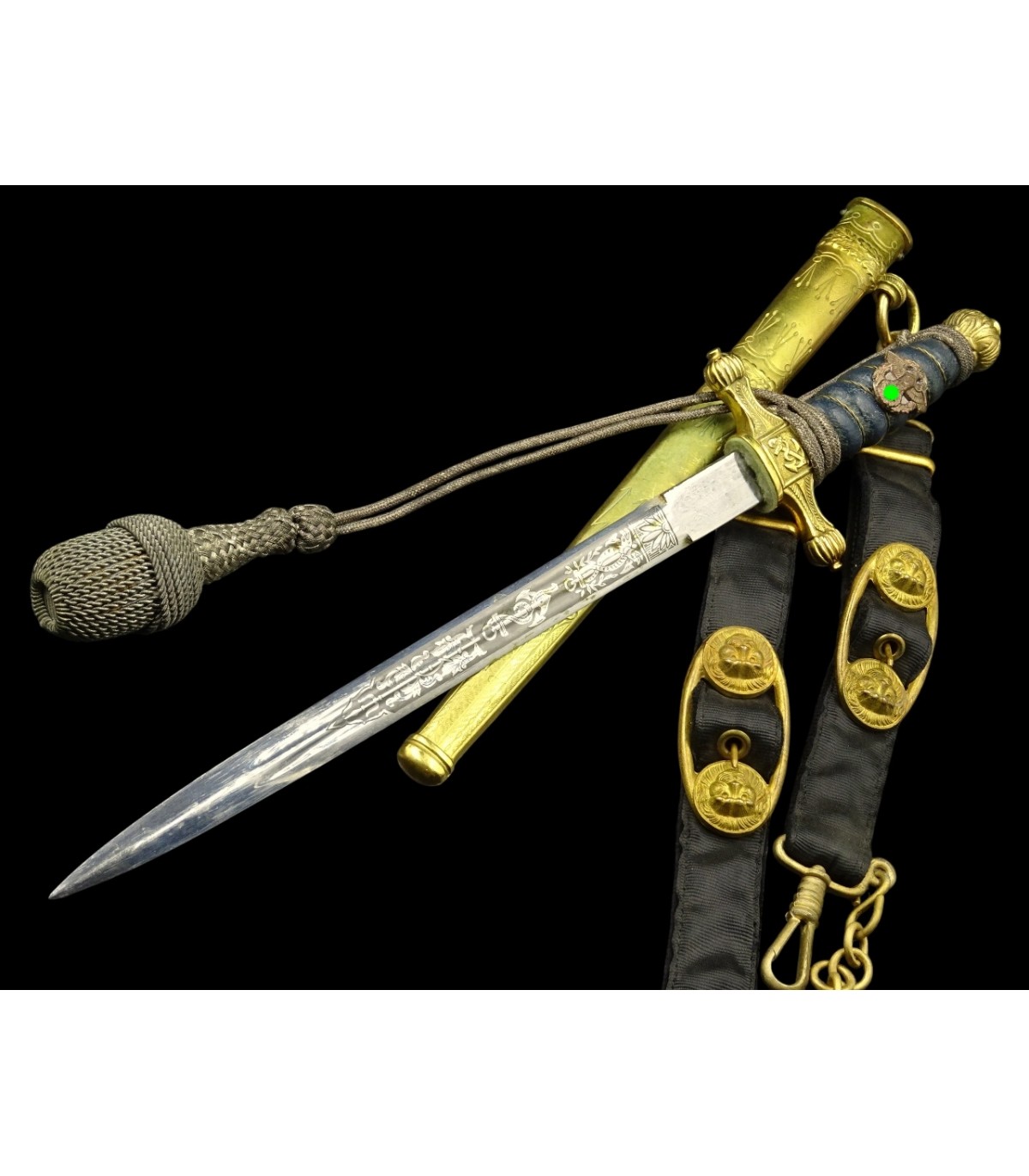 Preciosa daga impecable, de latón dorado, hoja grabada, empuñadura de madera enfundada en cuero azul con águila policial. Con herrajes de aluminio anodizado en oro mate y cordón de alambre plateado. EXCELENTE ESTADO.