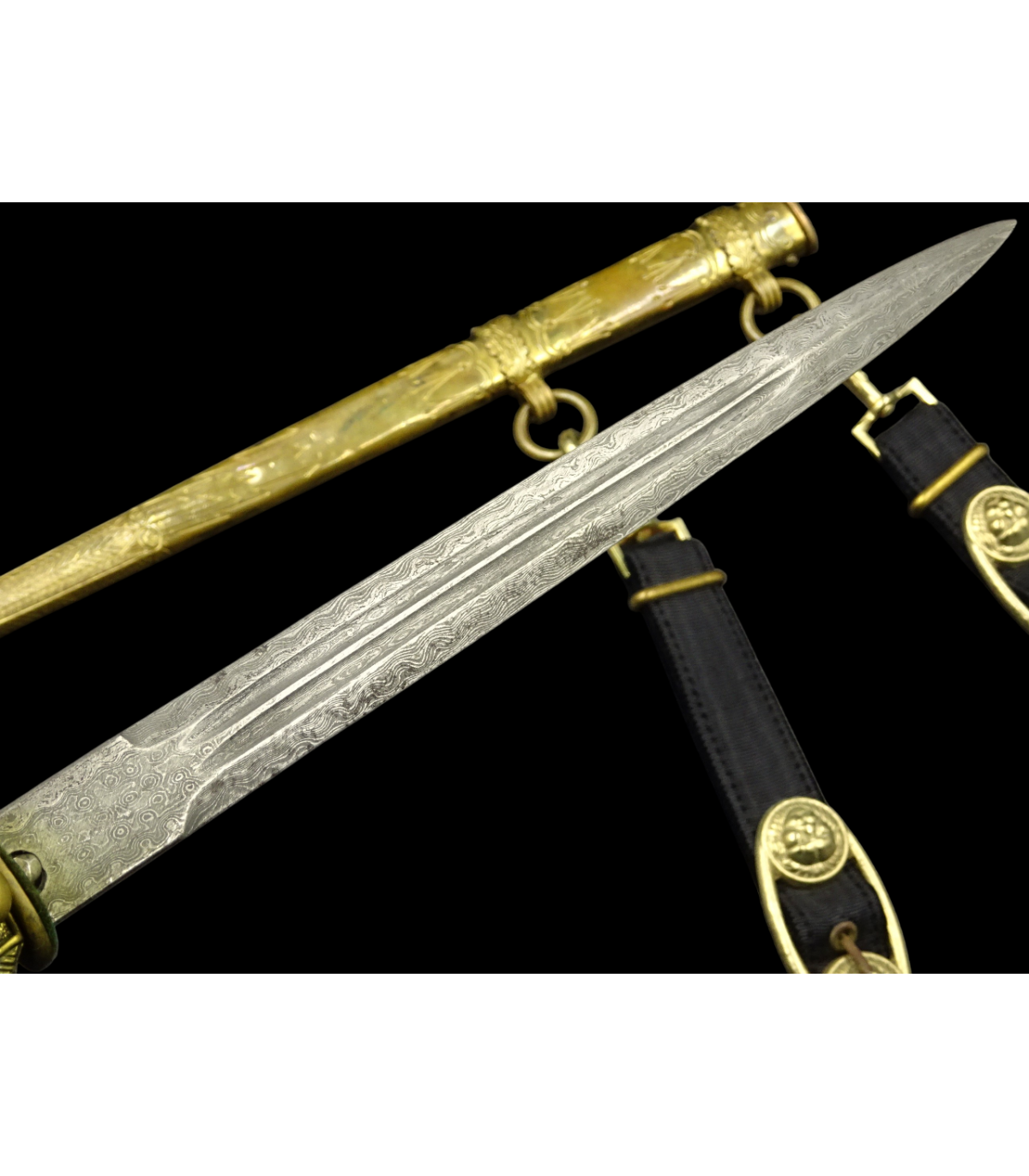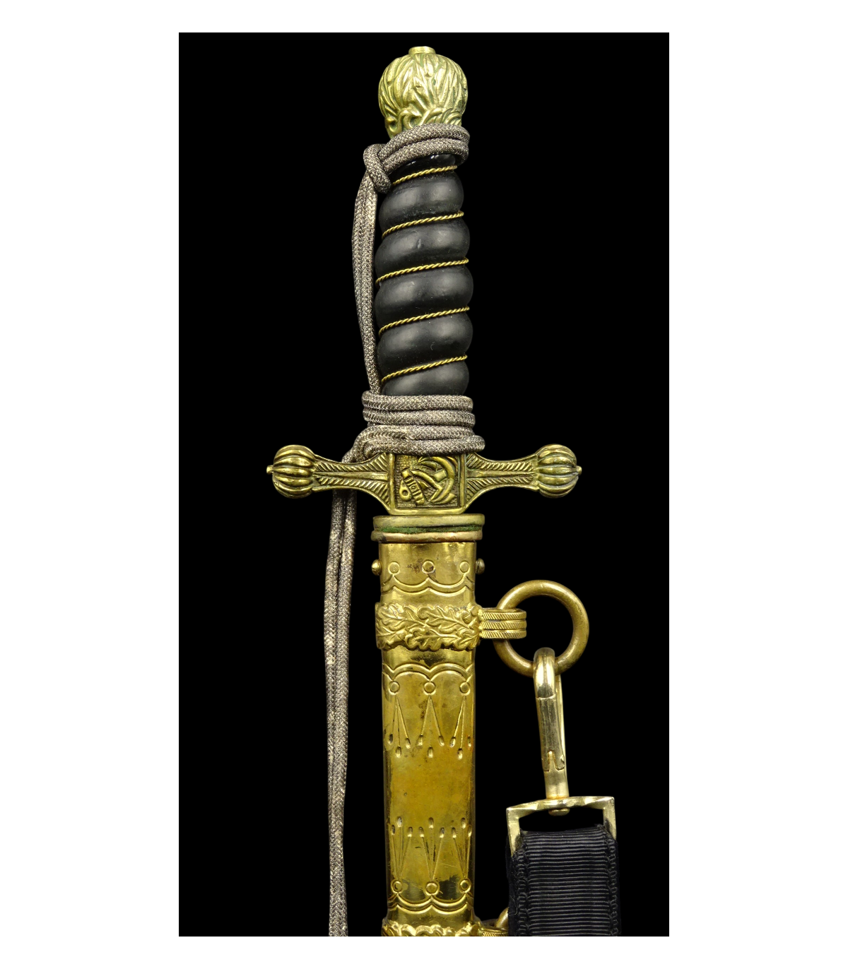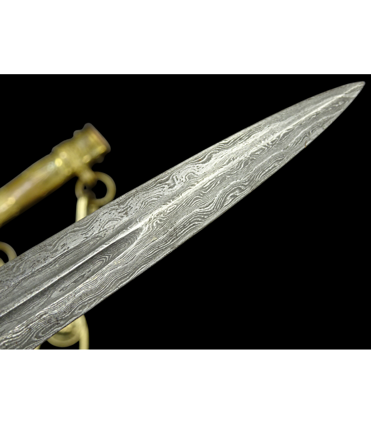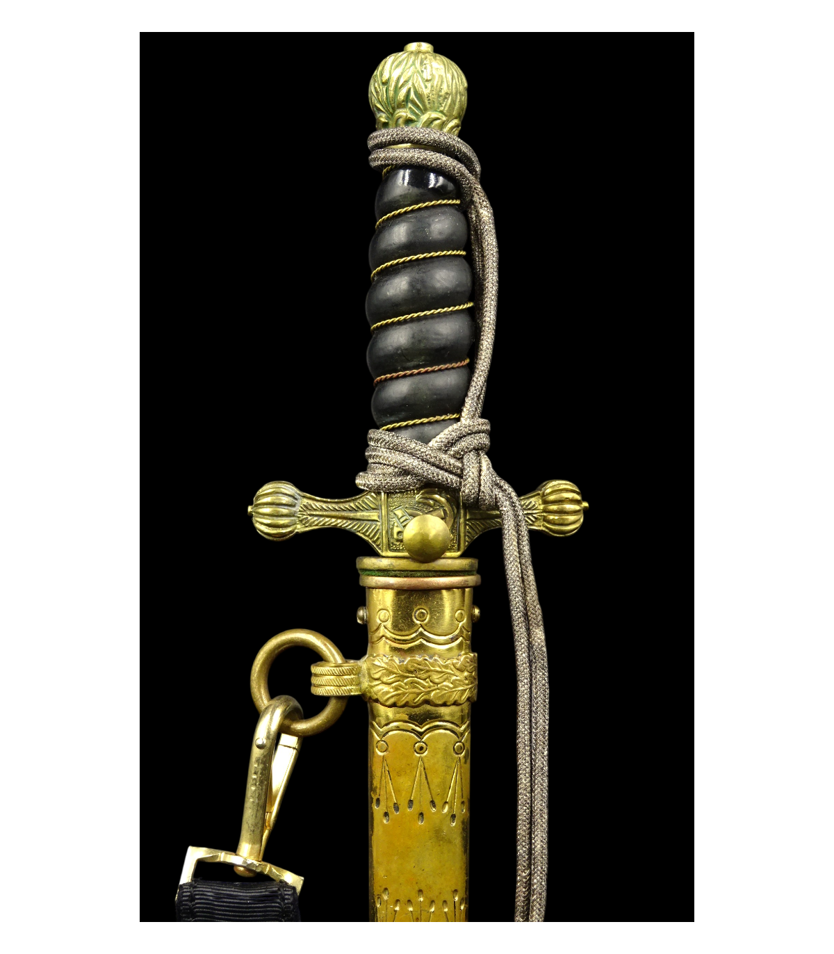 Huso de madera recubierto de celuloide negro. Latón dorado. Hoja de Damasco. Con cierre de alambre de plata y cordón. BE-TBE.