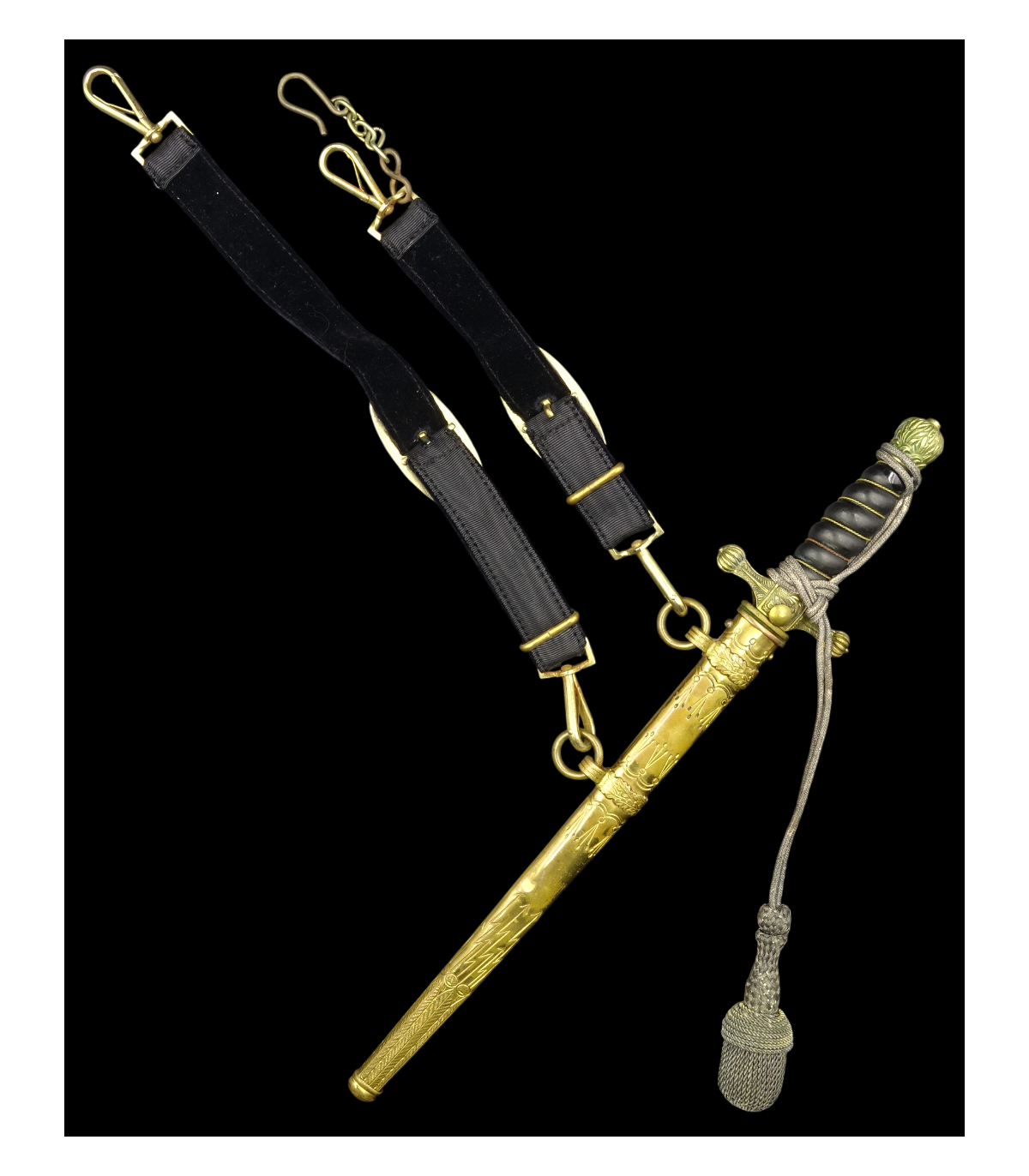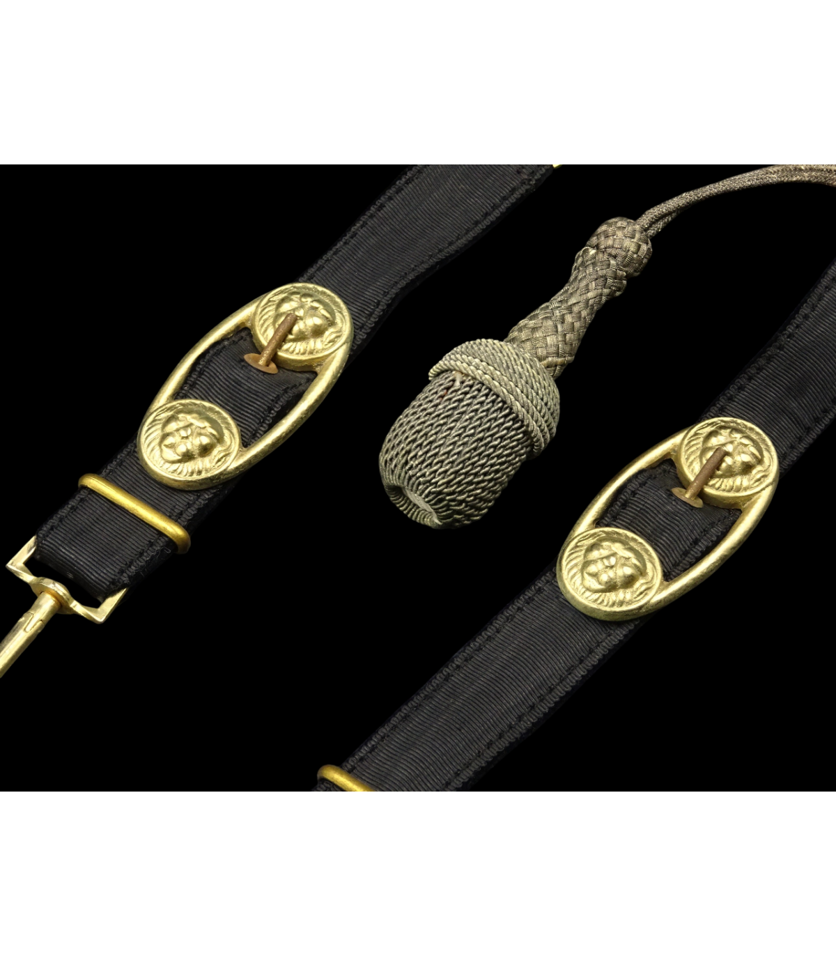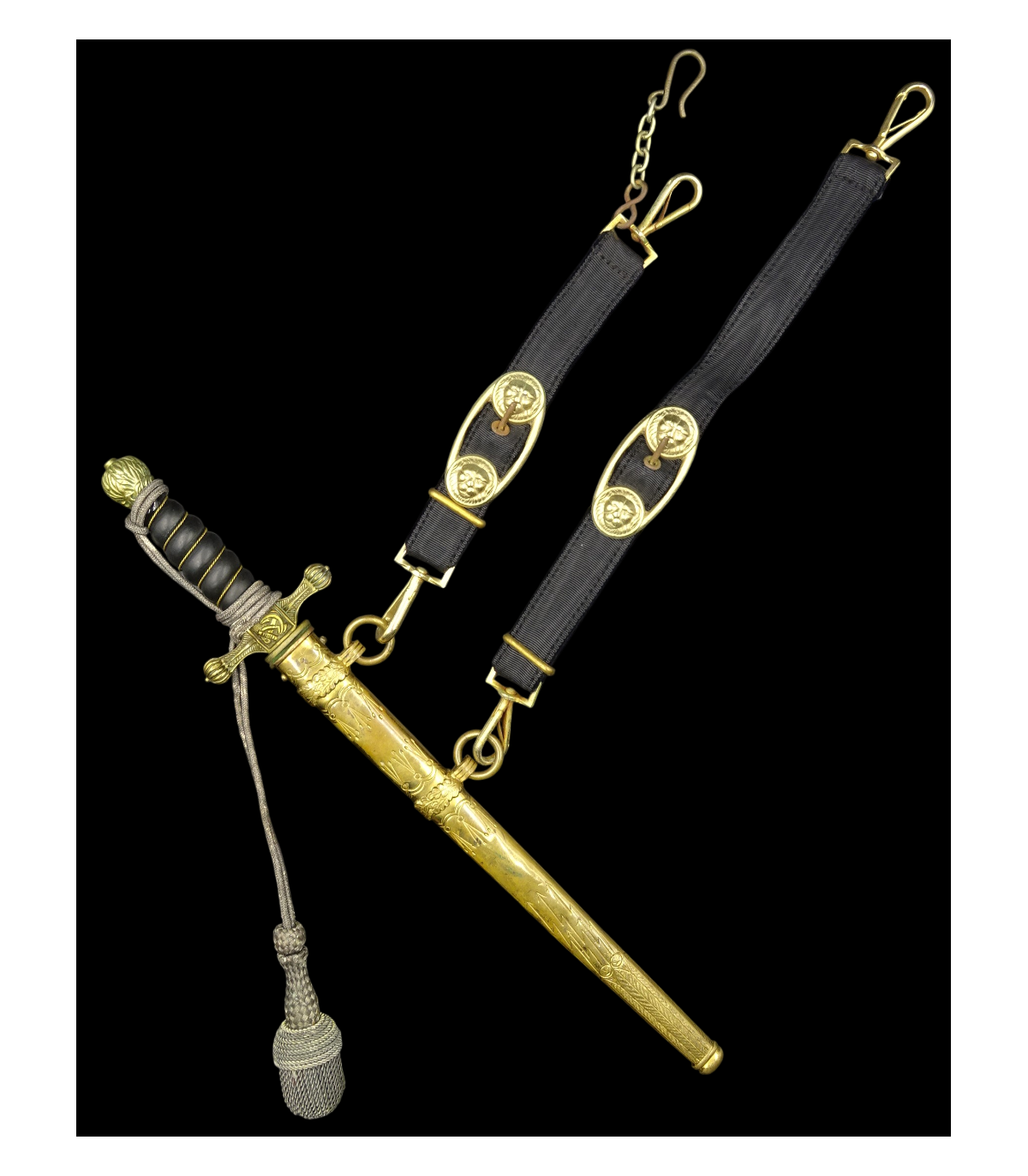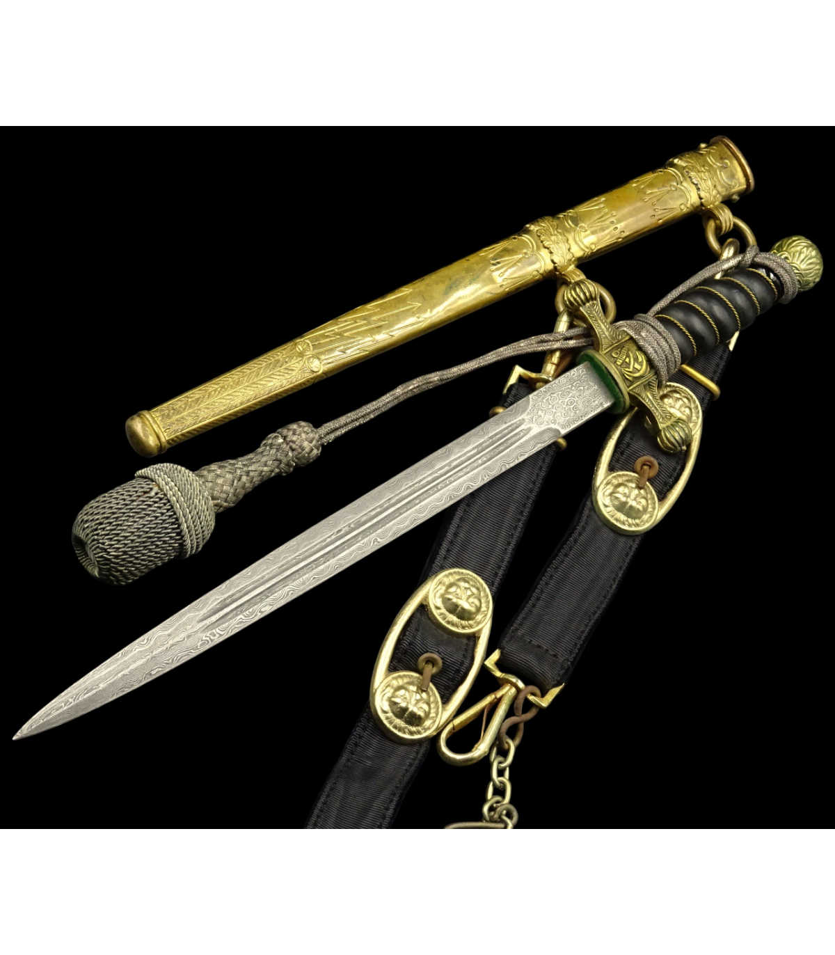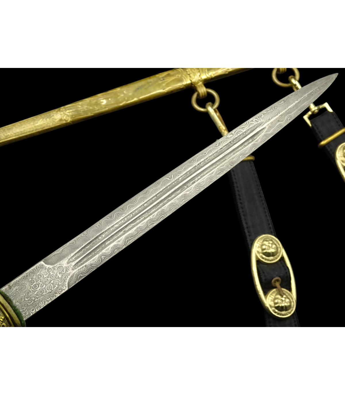 Huso de madera recubierto de celuloide negro. Latón dorado. Hoja de Damasco. Con cierre de alambre de plata y cordón. BE-TBE.