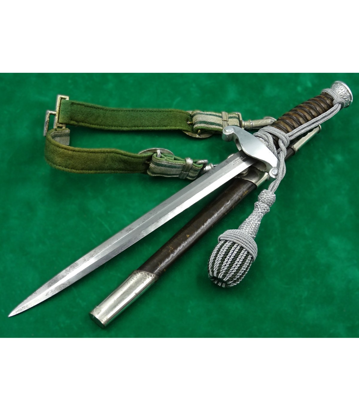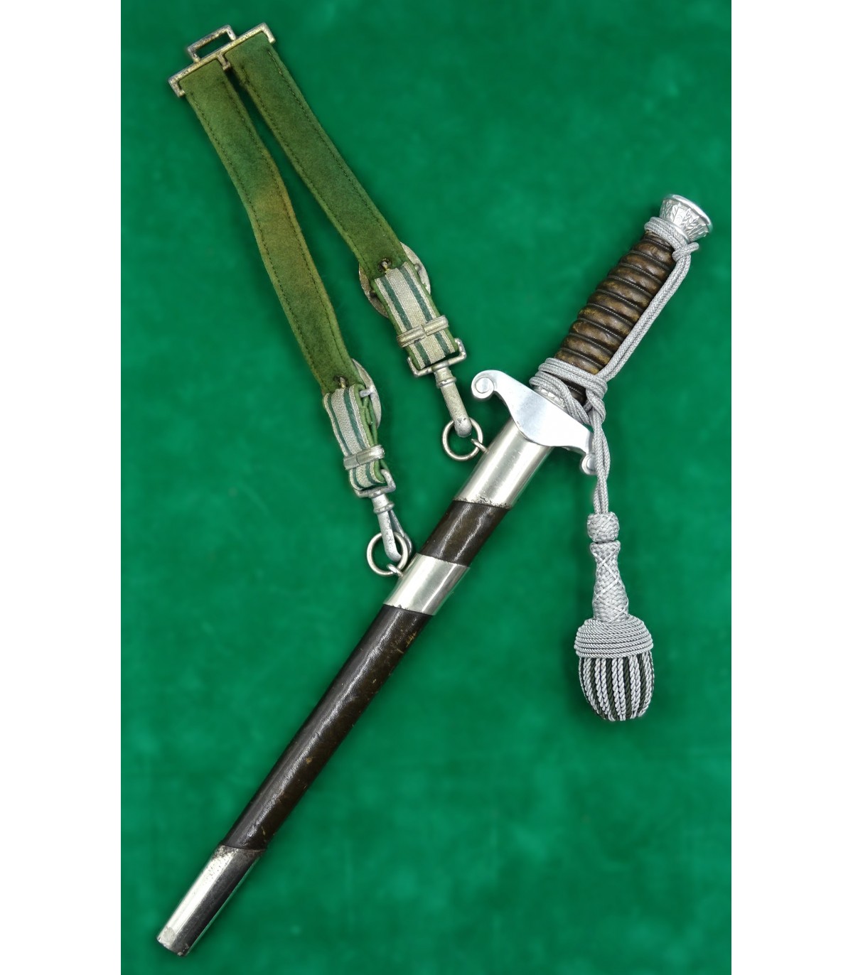 Empuñadura de aluminio. Mecha y vaina enfundadas en cuero verde. Empuñadura verde y plateada. Con su correa específica. BE-TBE.