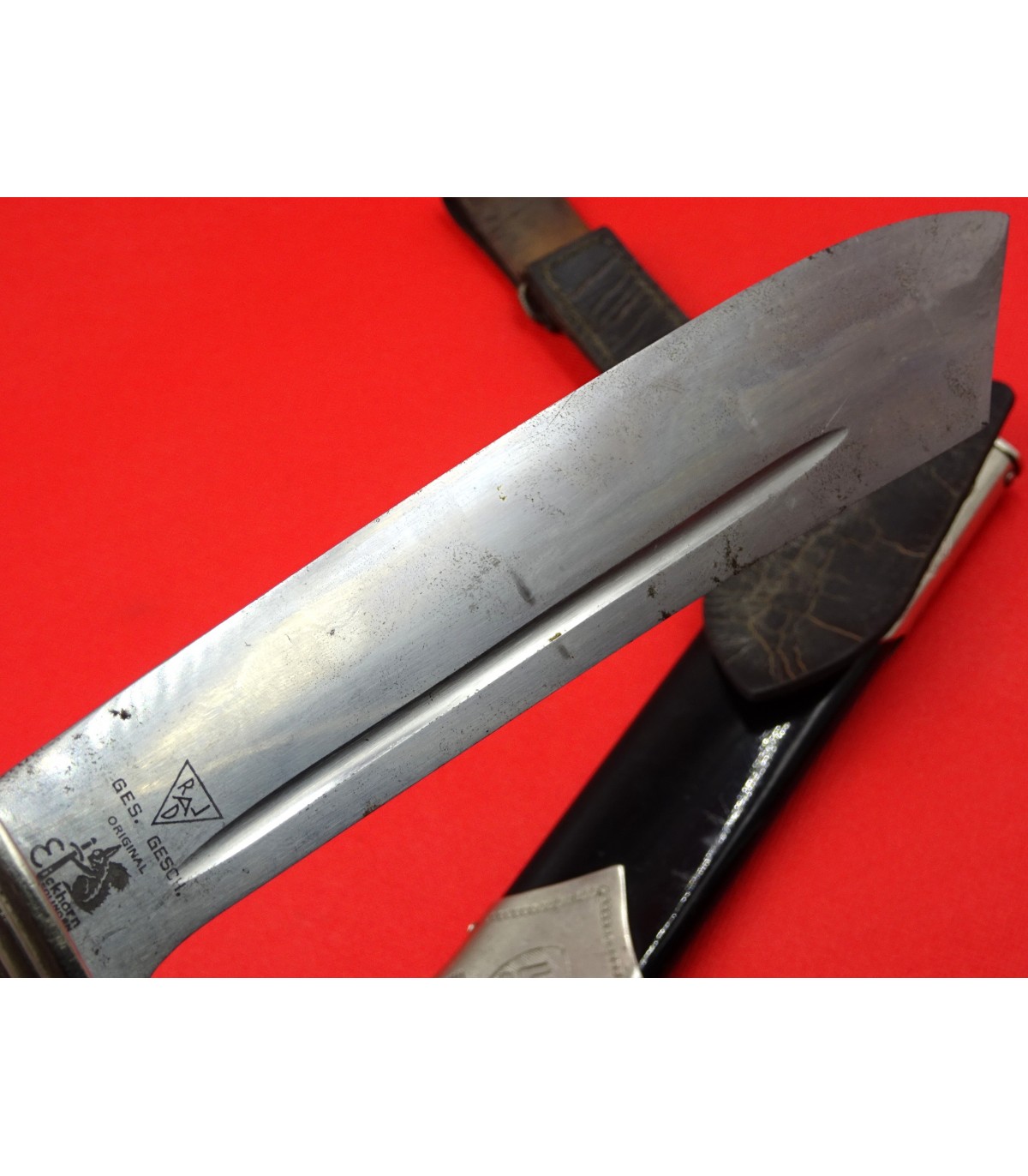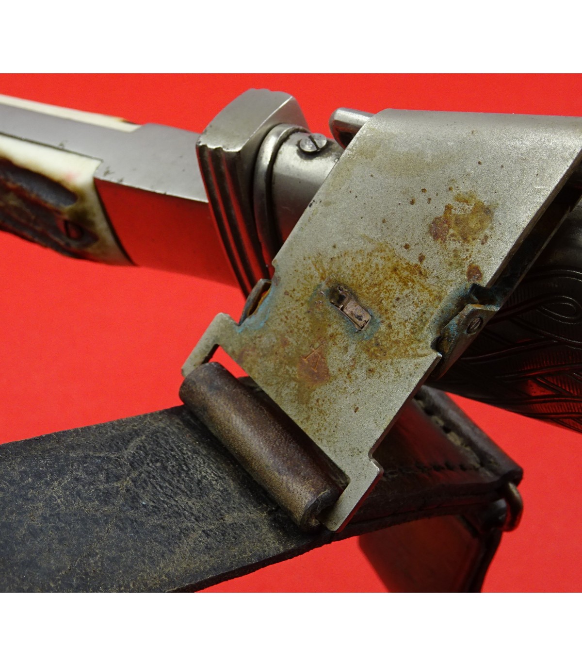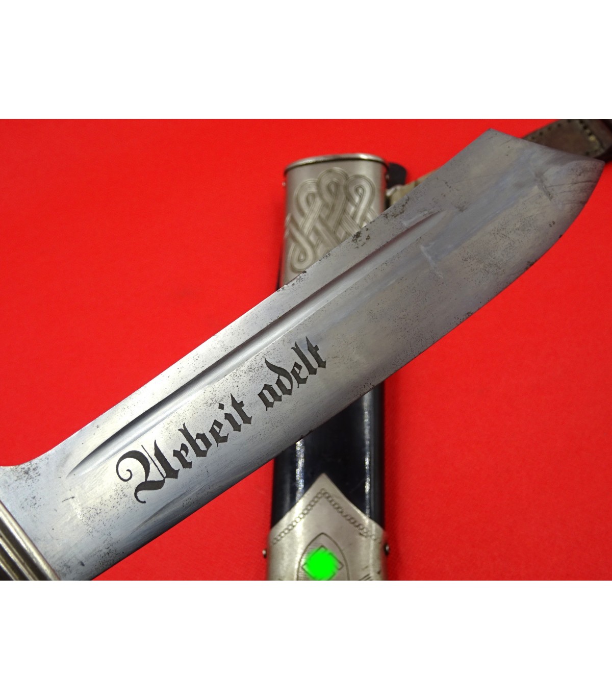 Fabricación temprana en alpaca. Placas de cuerno. Lema 'Arbeit adelt' en hoja fuerte y hermosa. Vaina 100% lacada. Percha de cuero agrietada en ABE, daga TBE.