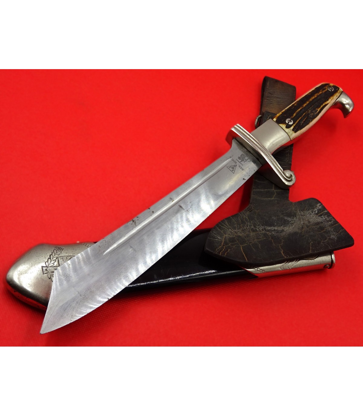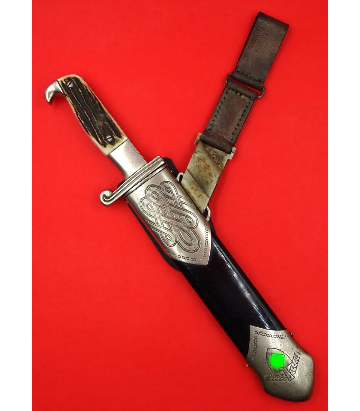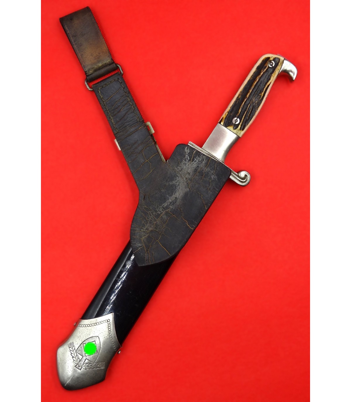 Fabricación temprana en alpaca. Placas de cuerno. Lema 'Arbeit adelt' en hoja fuerte y hermosa. Vaina 100% lacada. Percha de cuero agrietada en ABE, daga TBE.