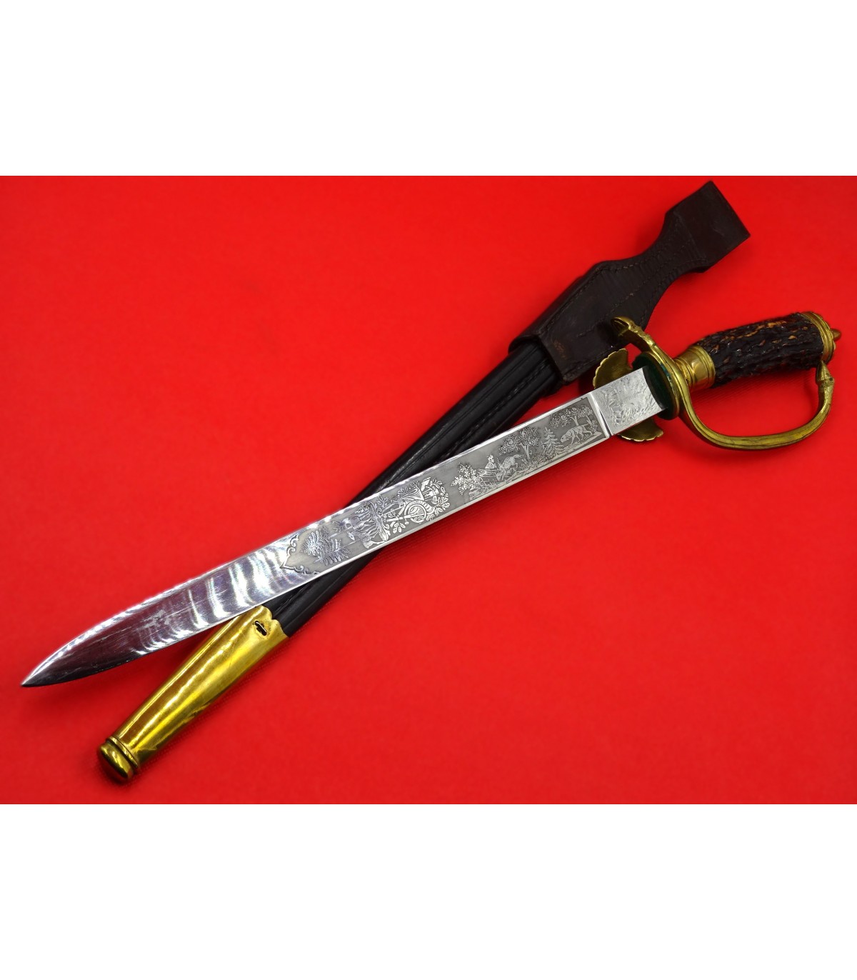 Empuñadura de cuerno con 2 borlas y águila LW. Hermosa hoja grabada con decoraciones de caza en ambos lados. Nombre Samwer grabado en el ricasso. Vaina enfundada en cuero negro. Funda de cuero marrón. Rara y en perfecto estado.