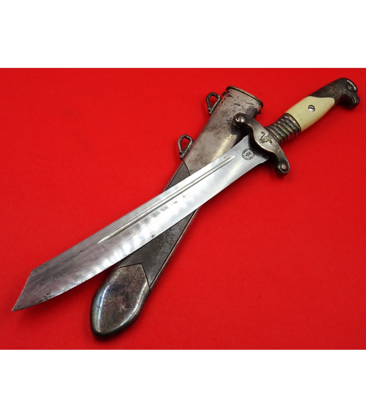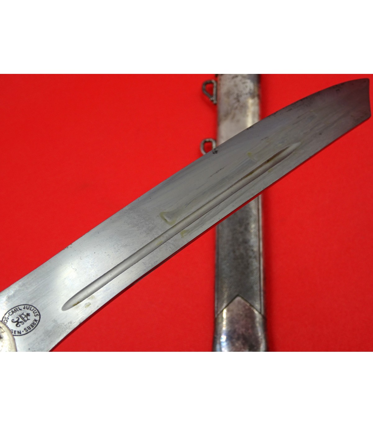 Buena hoja con el lema "Arbeit adelt". Empuñadura de aluminio plateado, placas de marfil blanco. Iniciales del propietario F.W. en el dorso de la empuñadura. Buena vaina sin golpes. BUEN ESTADO.