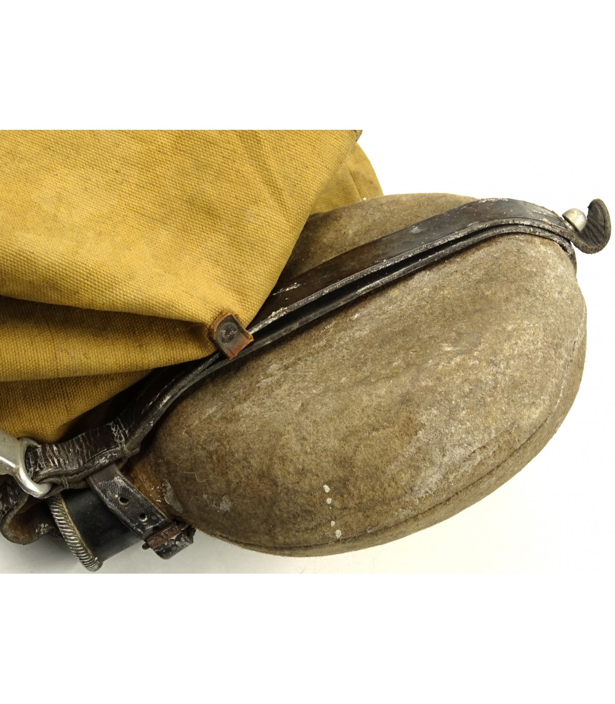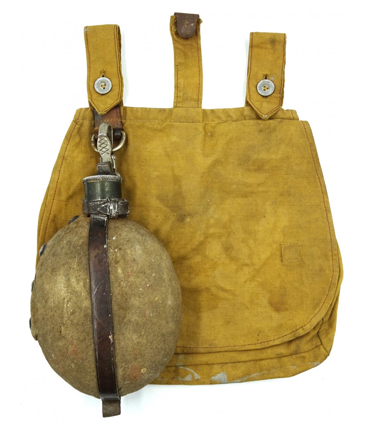 Bolsa de pan en lona cachou, etiqueta RZM. Lata de 1/2 litro en cuarto de galón original, marca SRM 39. ABE.