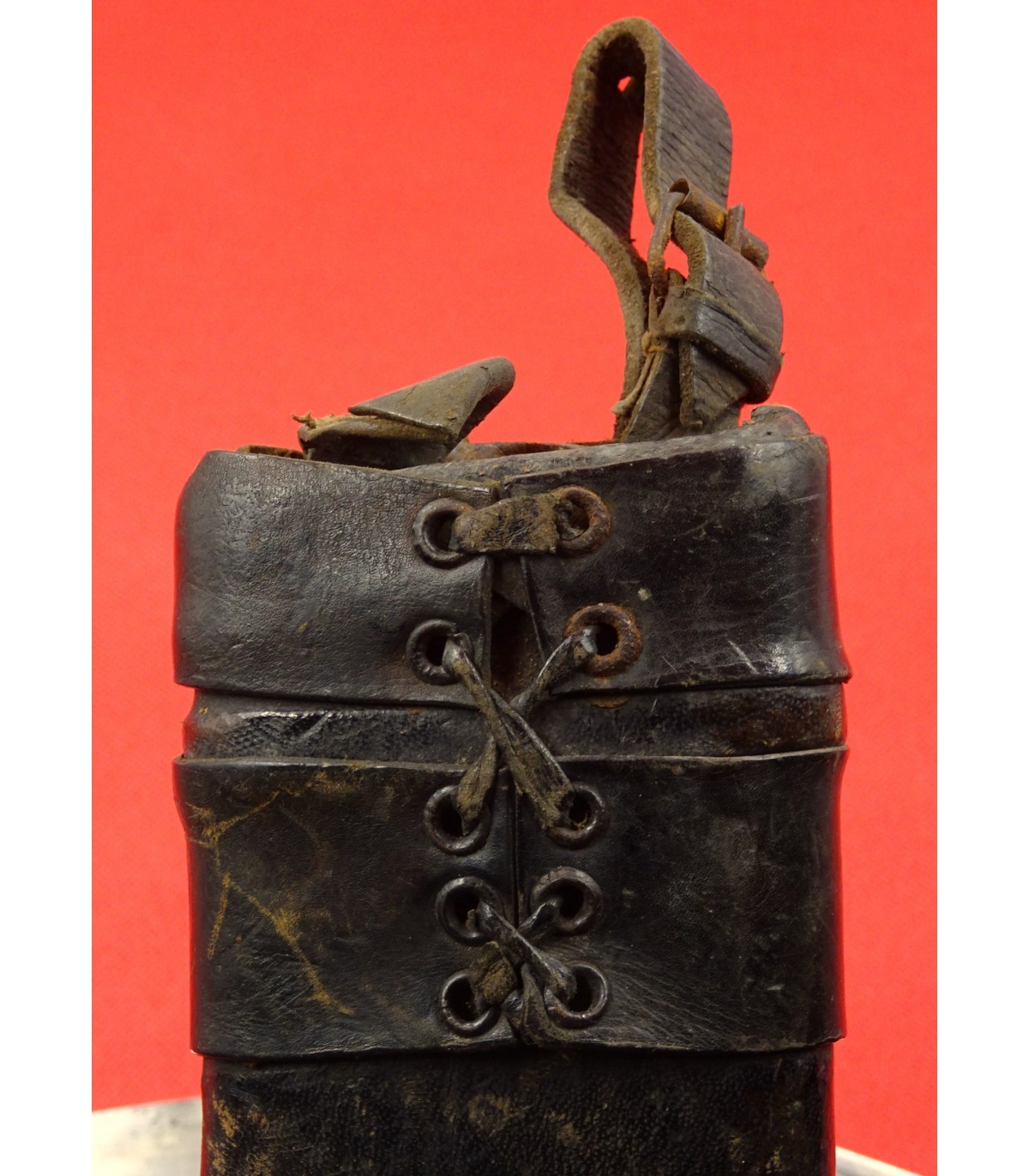 Bonita hoja, marcaje inglés. Mango de cuerno. Funda de cuero. Longitud 44cm. BE-.