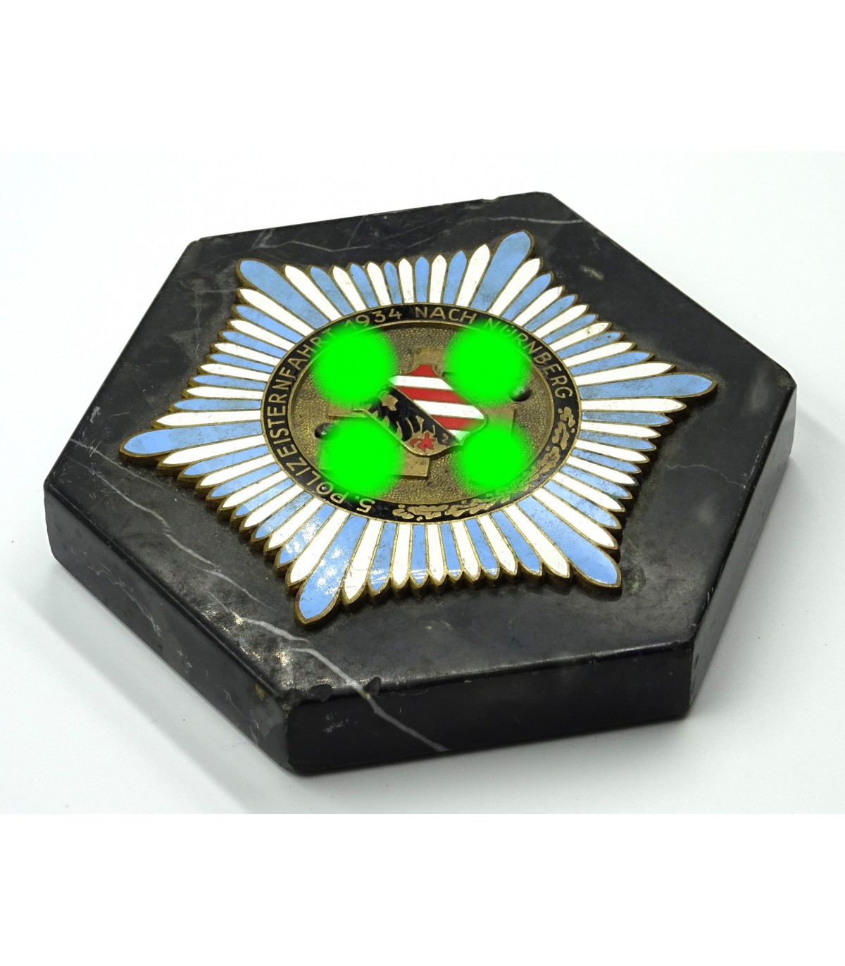 Pisapapeles muy fino de mármol coronado por un medallón esmaltado "Polizeisternfahrt 1934 nach Nürnberg". 105x105x22mm. TBE.