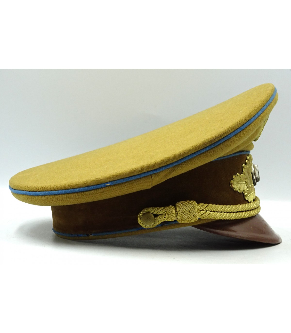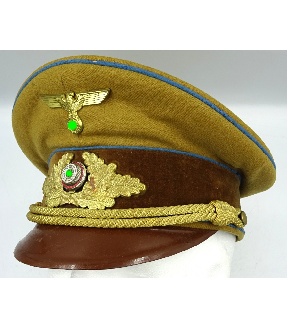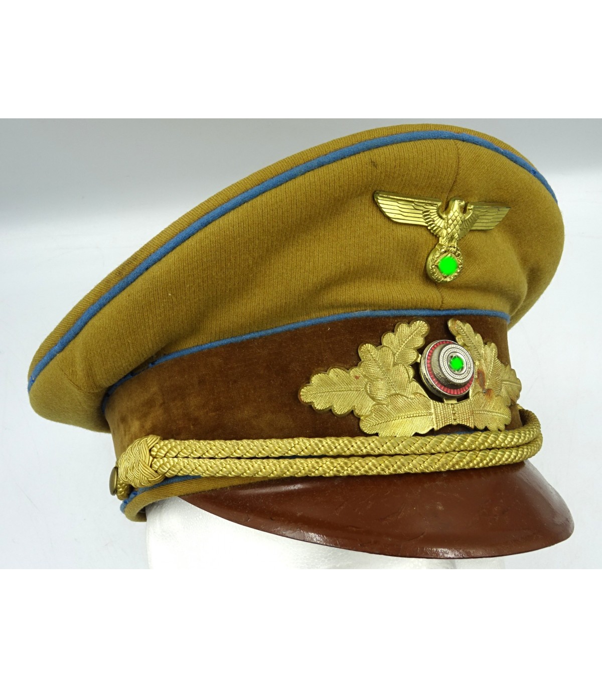 Completa. Preciosa insignia dorada al mercurio. Escarapela esmaltada. Cordón de celón dorado mate. Tocado de tricotina marrón. Cinta de terciopelo marrón. Ribete azul Ortsgruppe (algunos agujeros de polilla). Sin mica. Etiqueta RZM Tuchmütze. BUEN ESTADO.