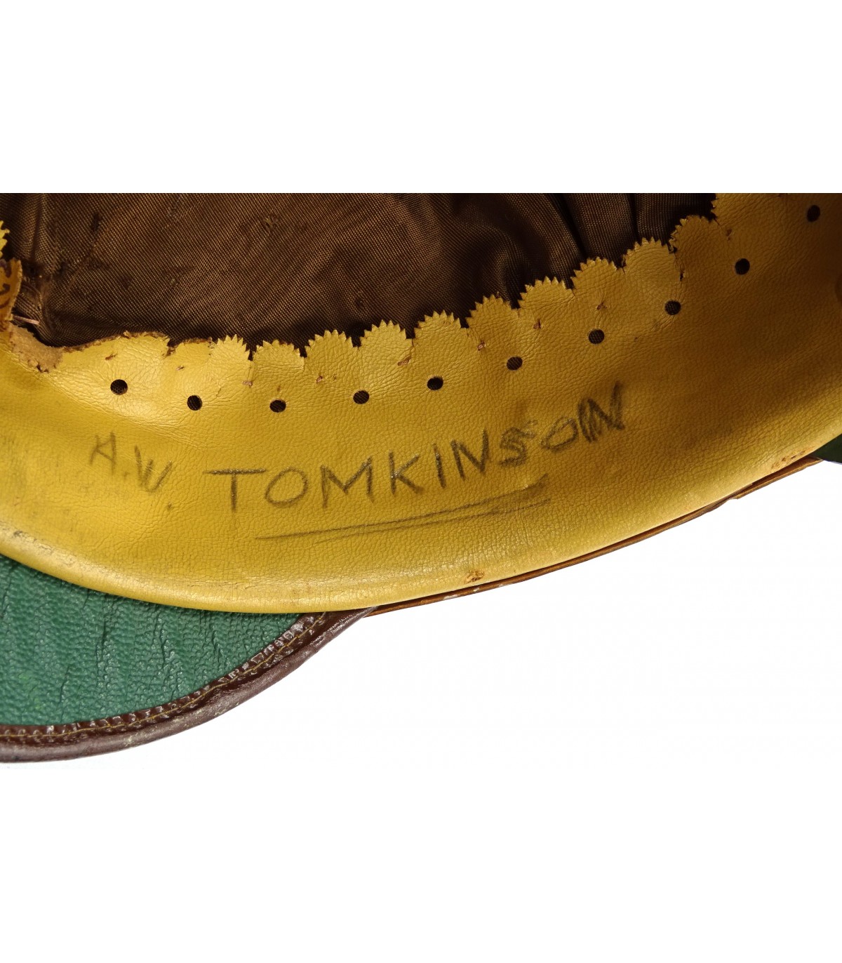 Interior de cuero y seda. Barboquejo de escamas de aluminio. Águila de aluminio con motivo de oficial saliente. Escarapela de oficial de aluminio bordada. 3-4 agujeros de polilla en la tela verde policía, por lo demás muy buen estado. Bastante raro.