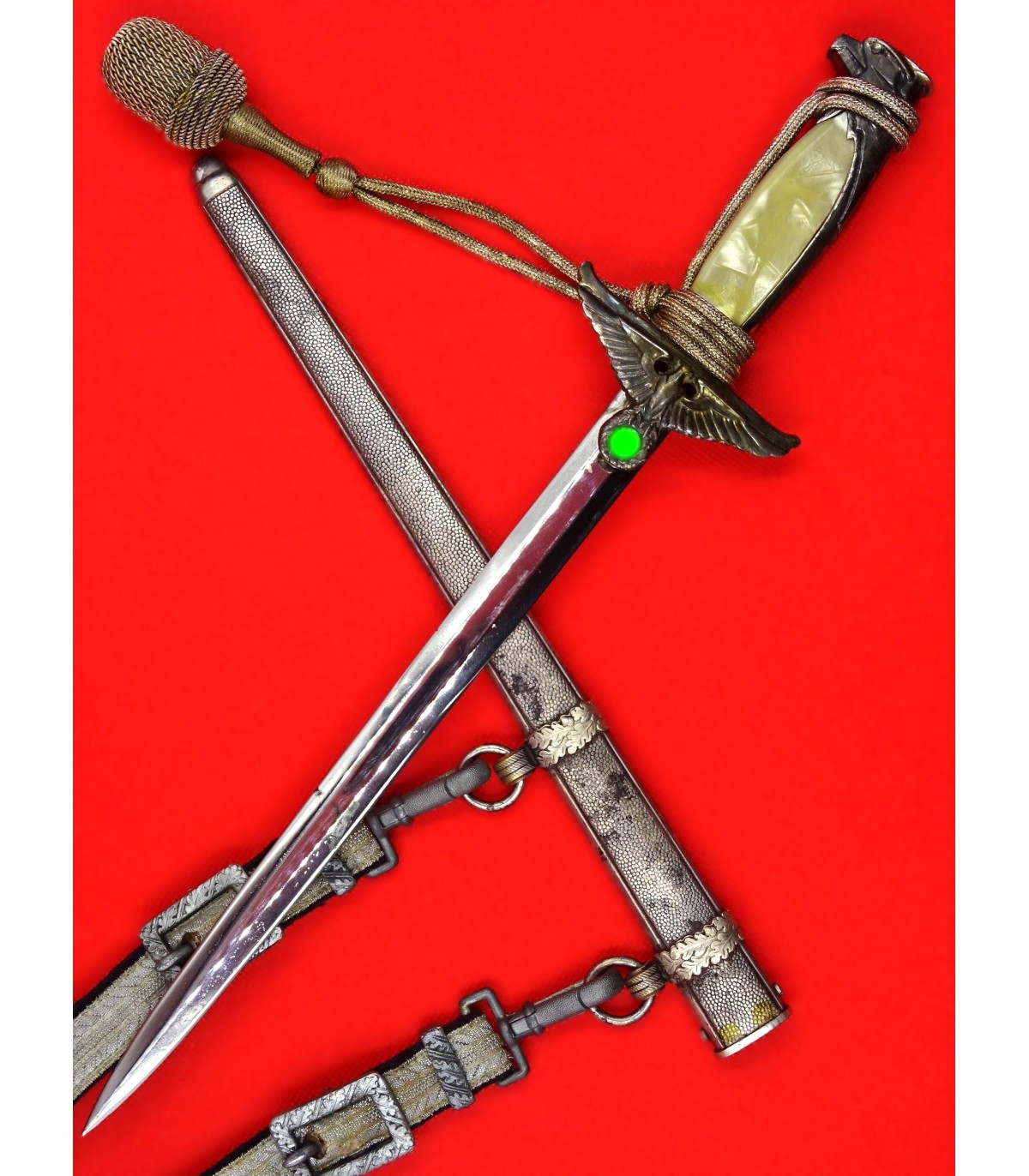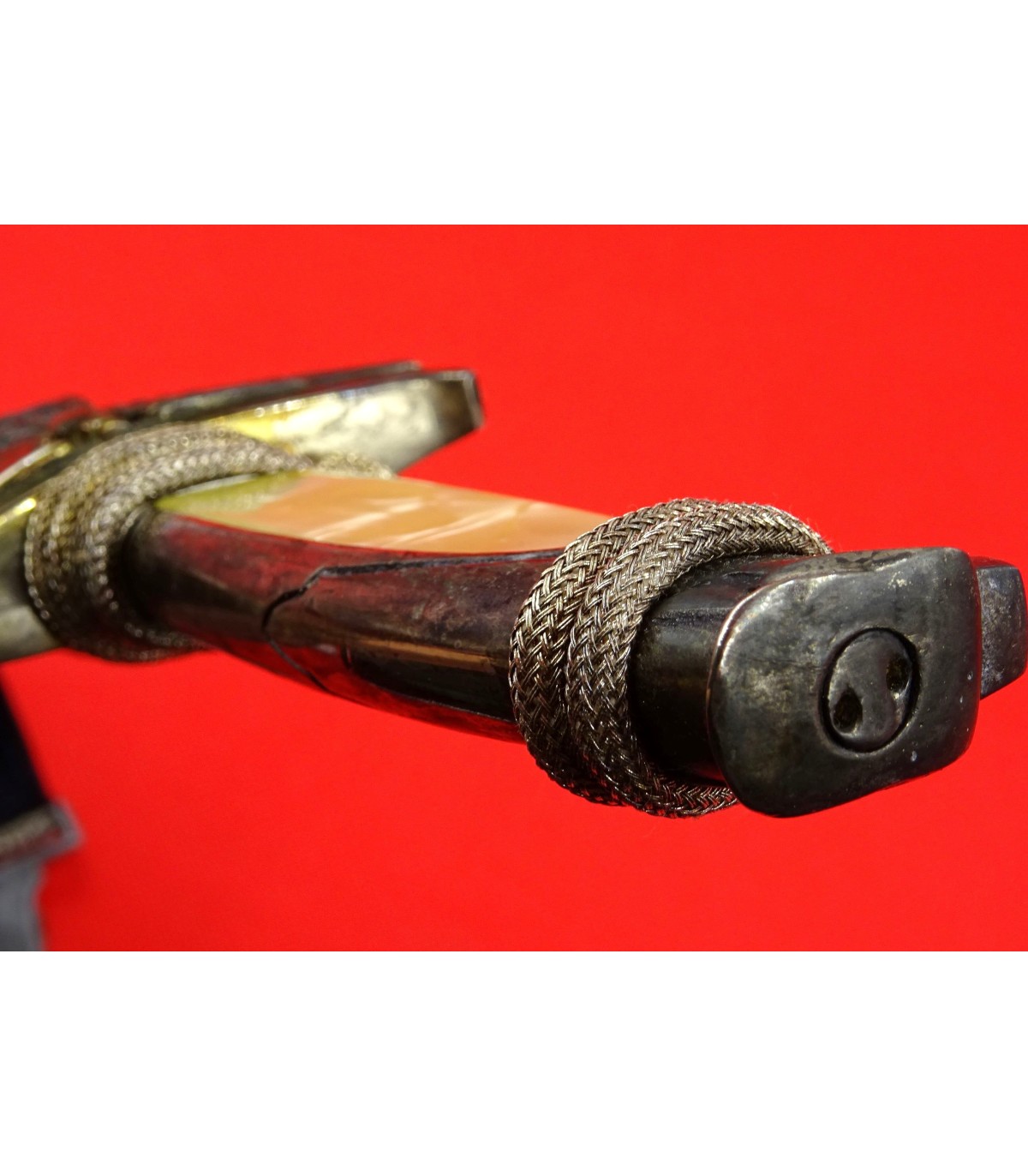 Complète avec bélière en brocard argent sur socle de velours noir et dragonne en fil argent. Plaquettes de poignée en nacre. Fourreau sans choc. Assez bonne lame. Très rare. BE/BE-.