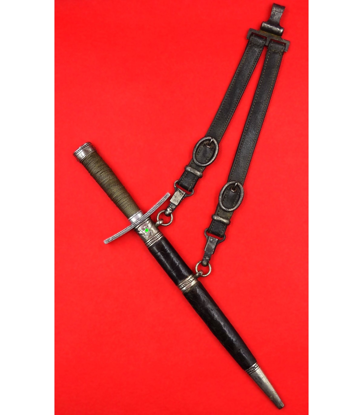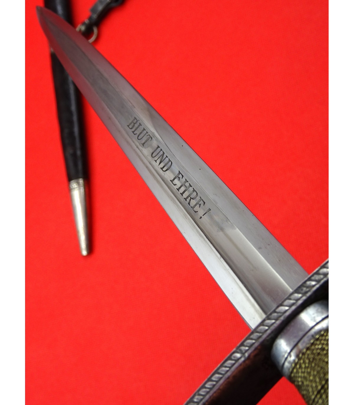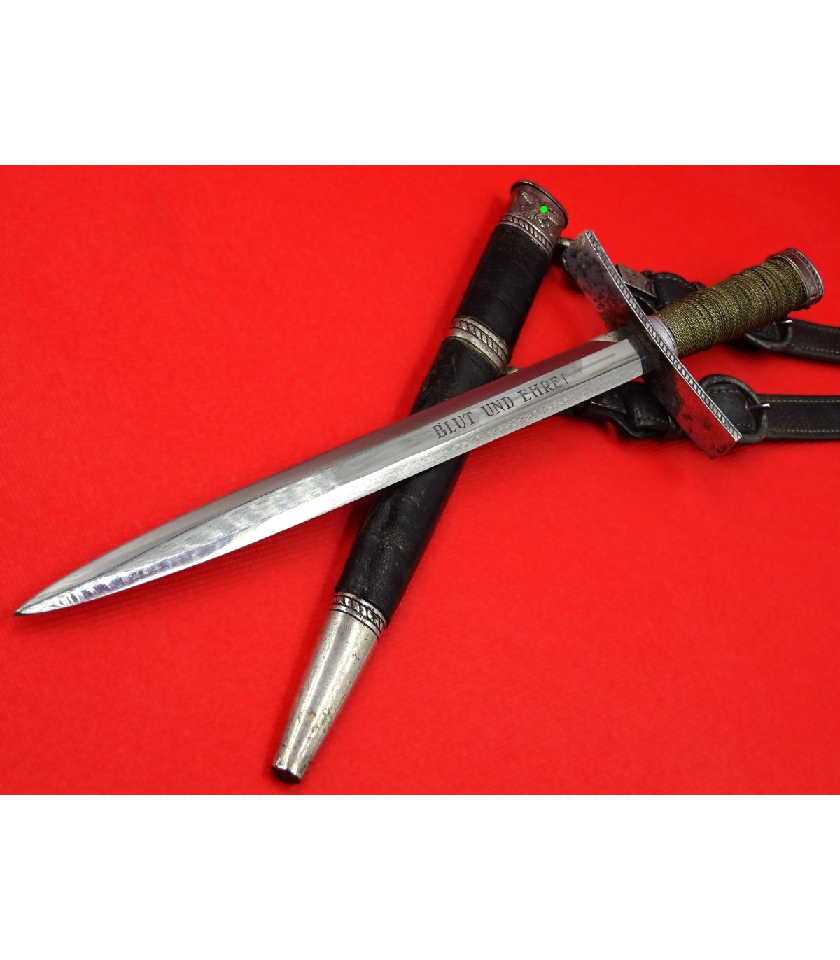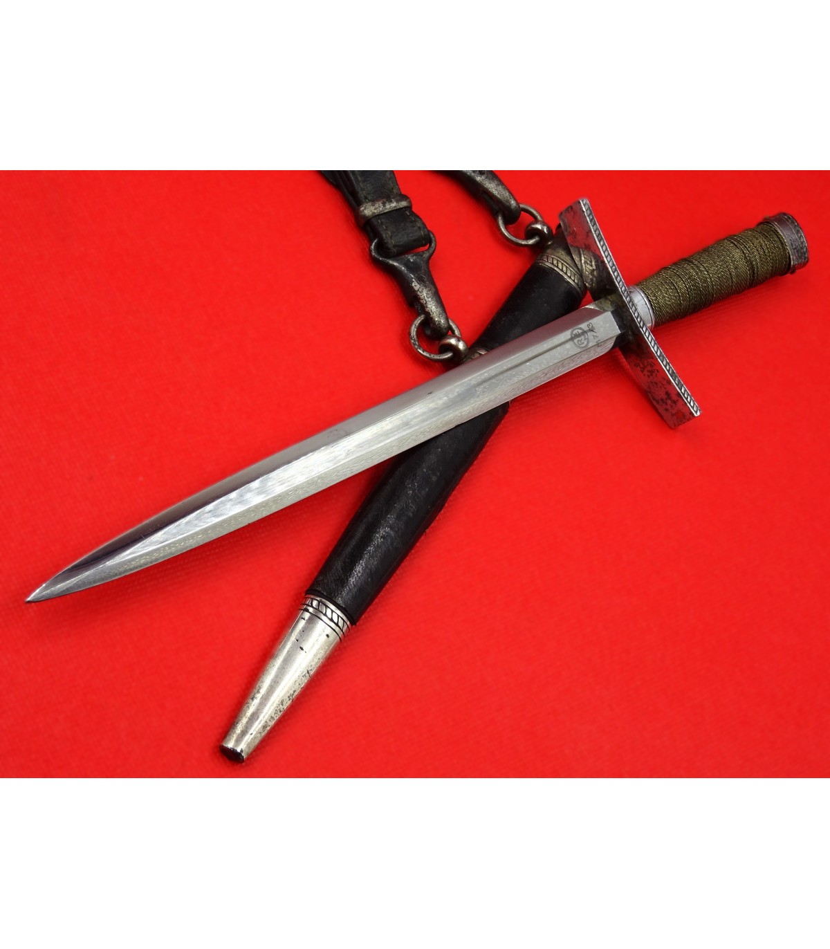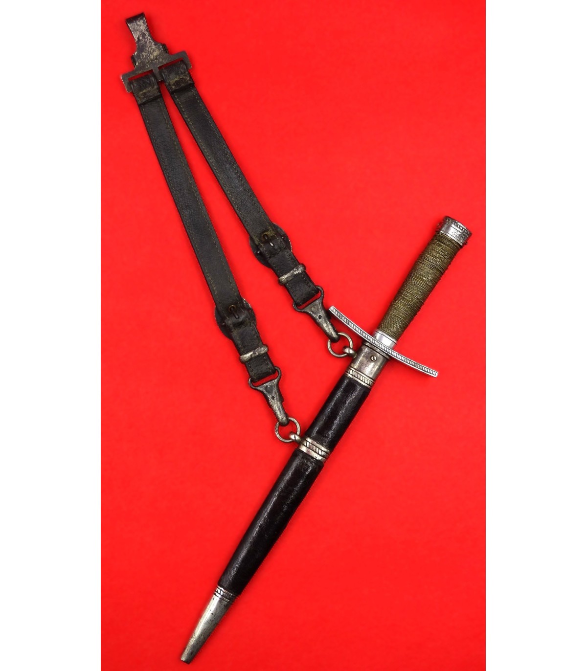 Fabricant Hörster RZM M7/36. Pommeau avec losange HJ en relief. Fourreau sans choc, cuir intact. Bélière cuir noir, Attache haute marquée O.B.10 RZM. Mousquetons Assmann. Une des dagues les plus rares du 3e Reich. BE-TBE.