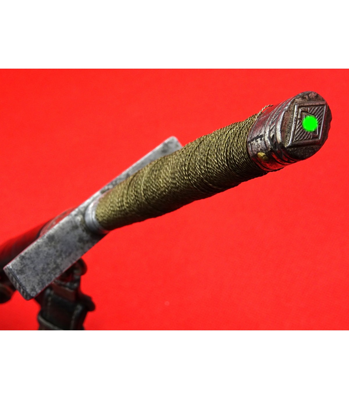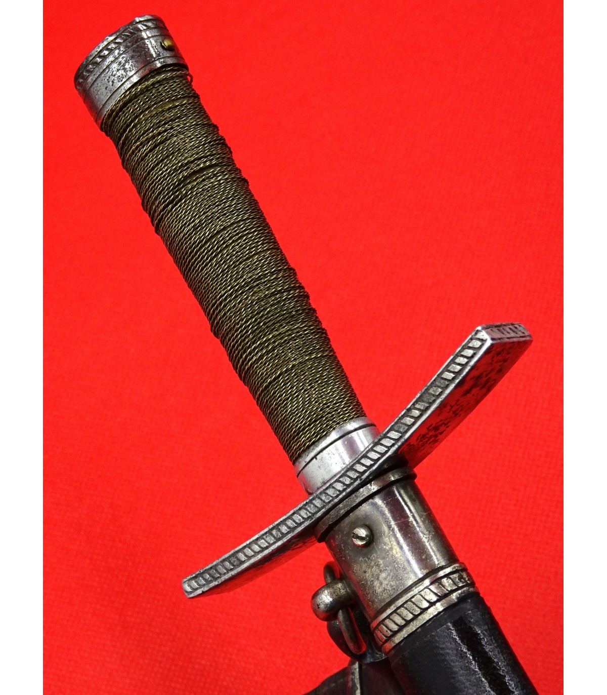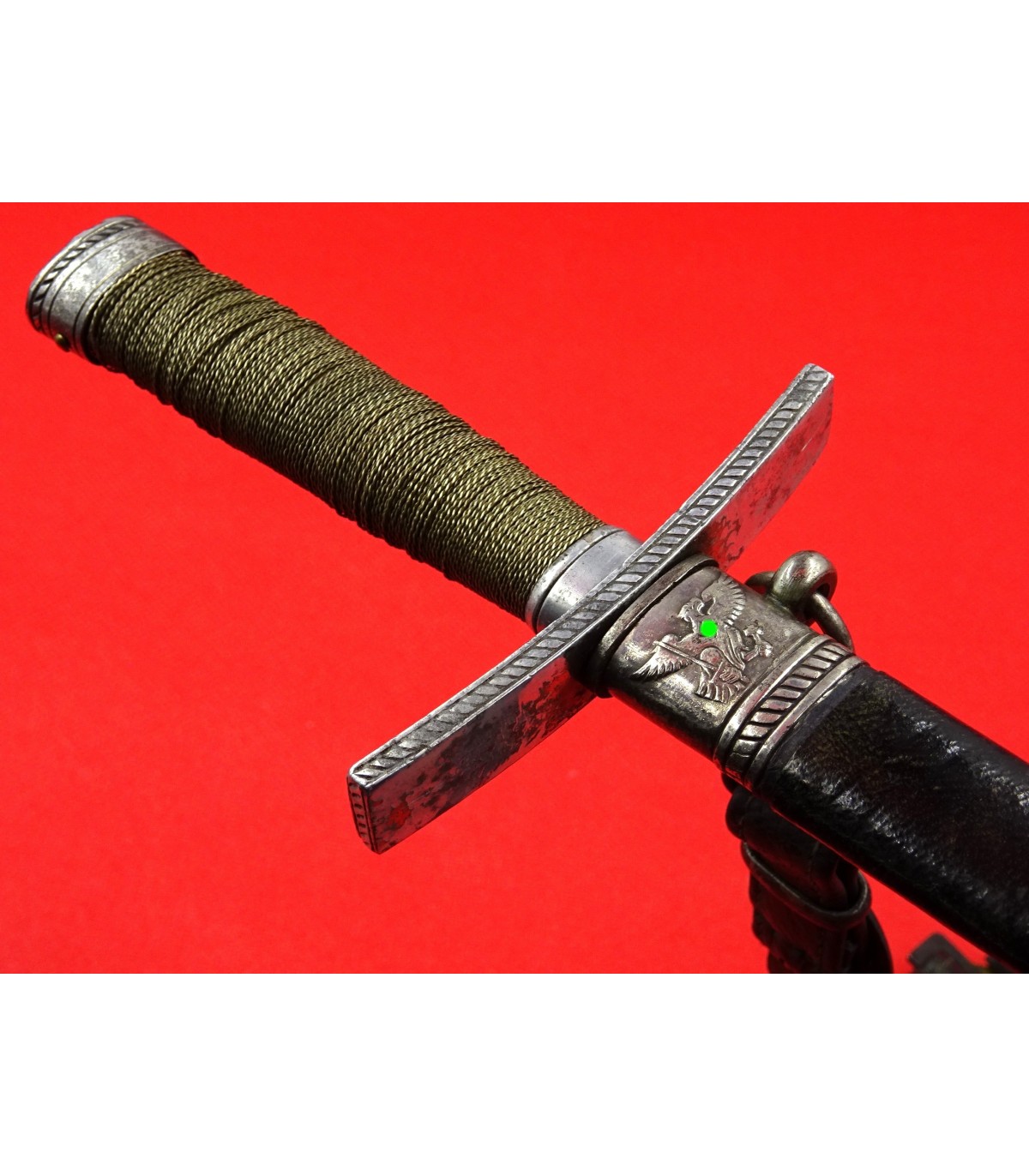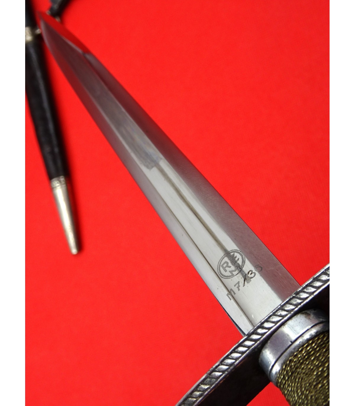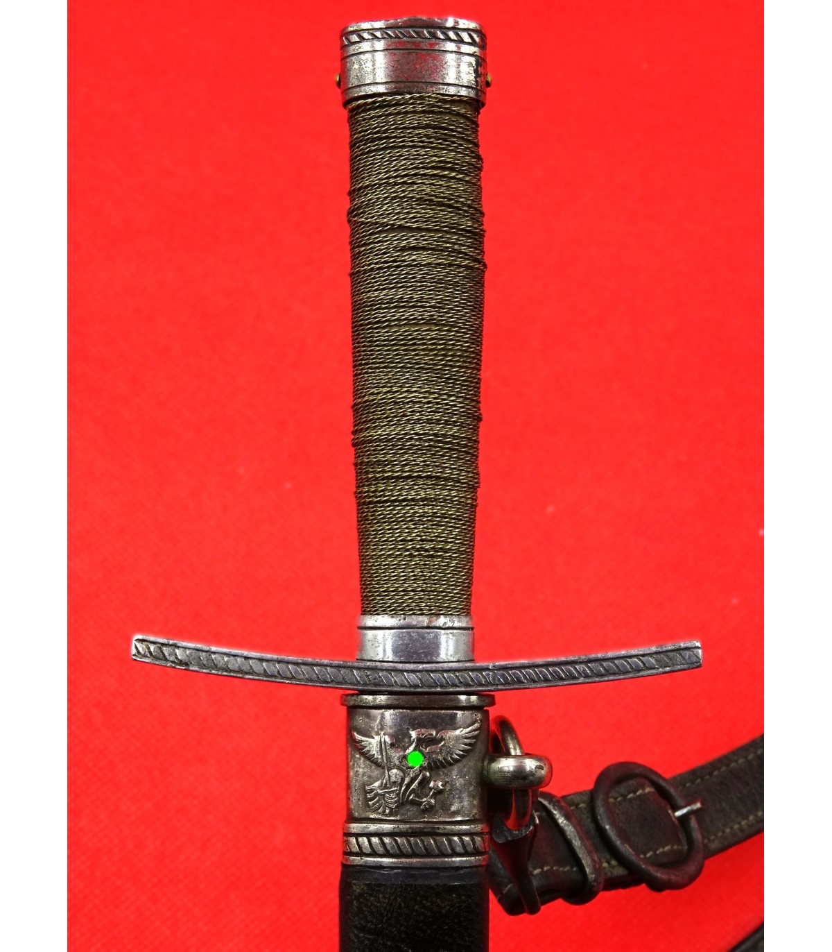 Fabricant Hörster RZM M7/36. Pommeau avec losange HJ en relief. Fourreau sans choc, cuir intact. Bélière cuir noir, Attache haute marquée O.B.10 RZM. Mousquetons Assmann. Une des dagues les plus rares du 3e Reich. BE-TBE.