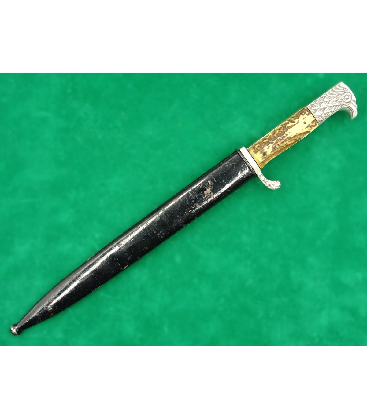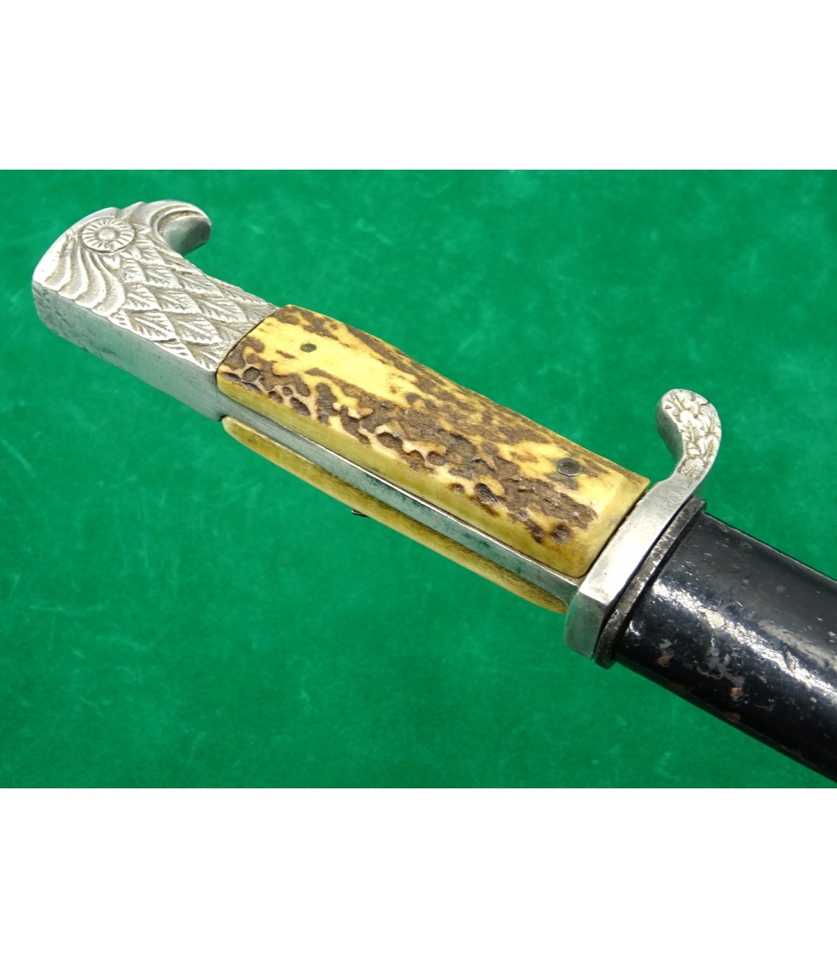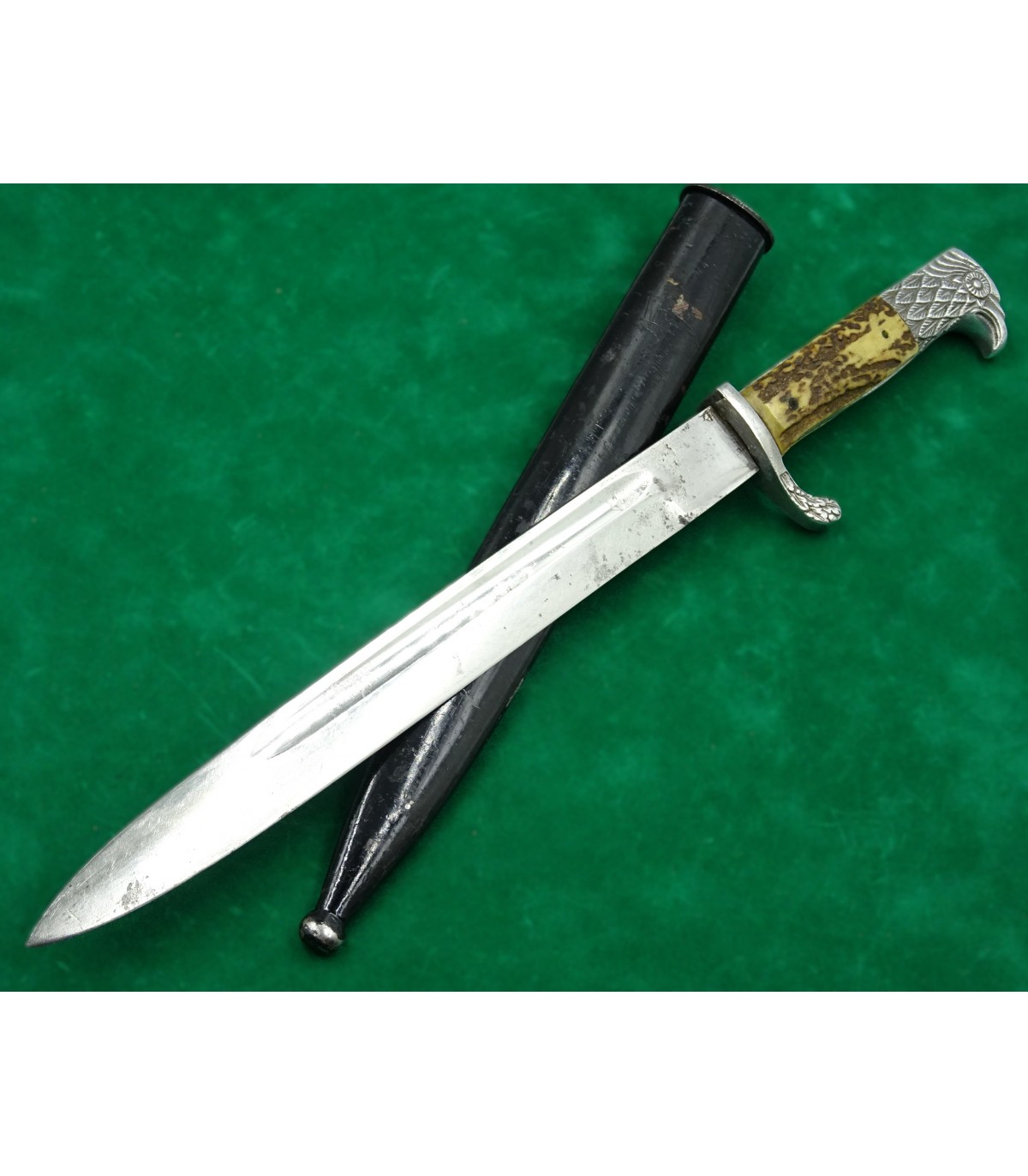 Plaquettes corne, poignée alu, fourreau laqué noir à 90-95%. Pas de logo fabricant. Plus rare que le modèle long à fourreau cuir. BE.