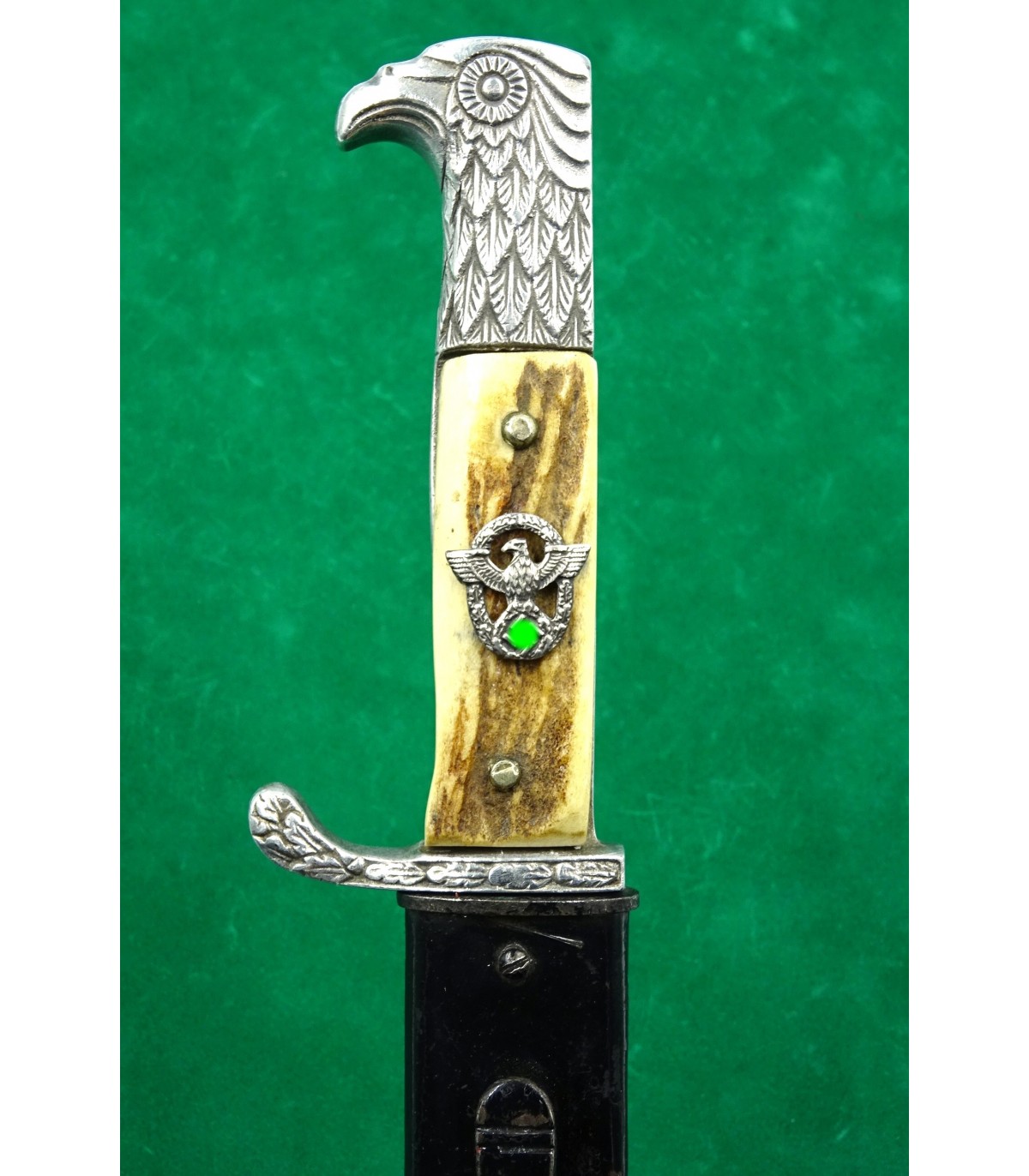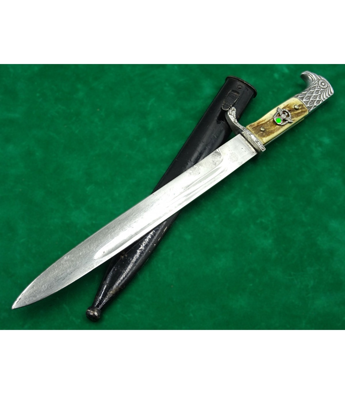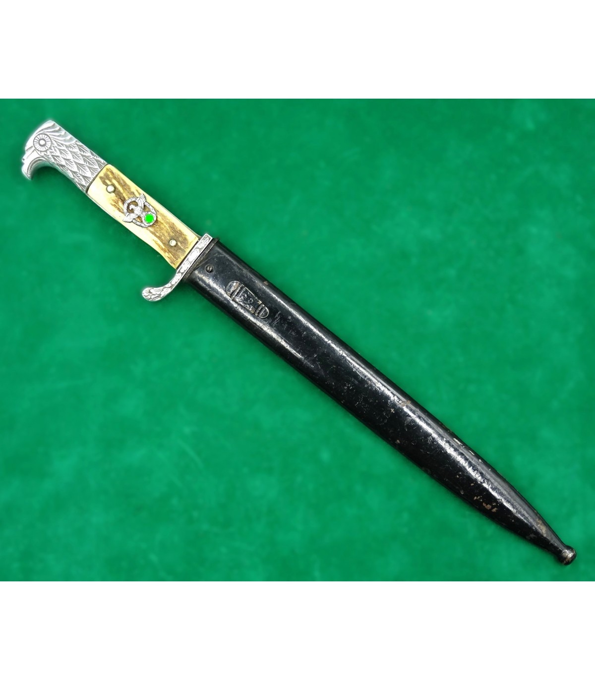 Plaquettes corne, poignée alu, fourreau laqué noir à 90-95%. Pas de logo fabricant. Plus rare que le modèle long à fourreau cuir. BE.