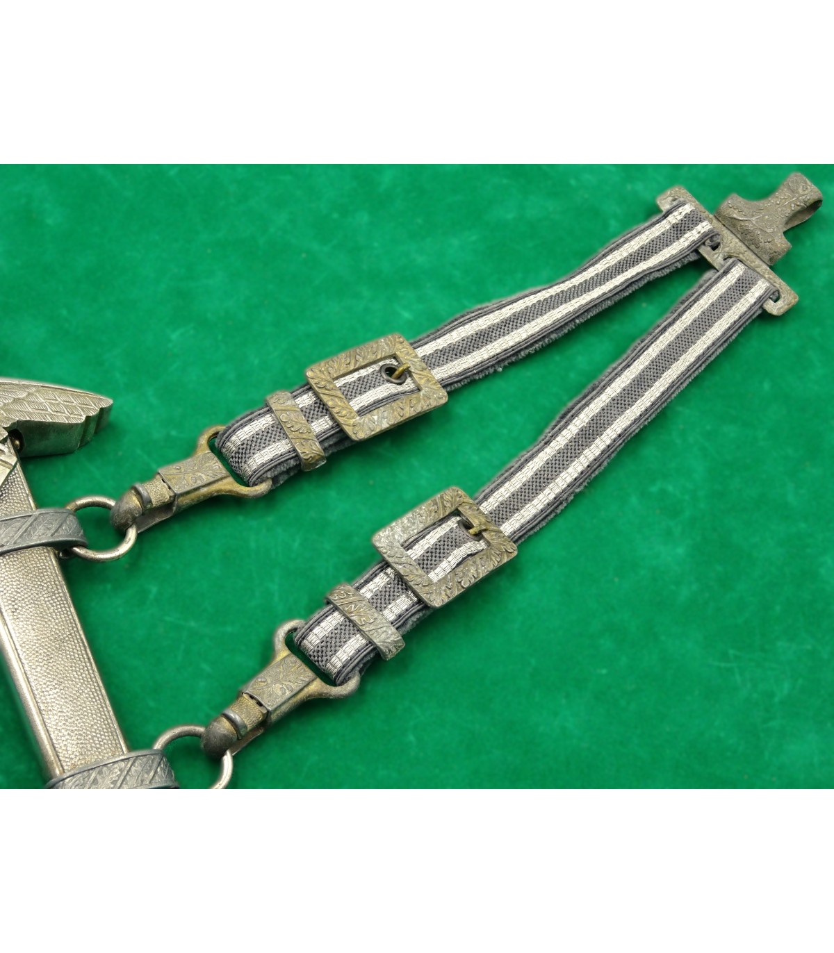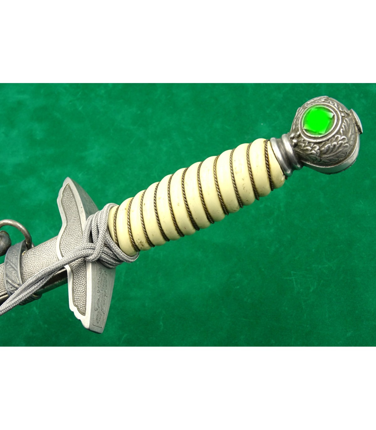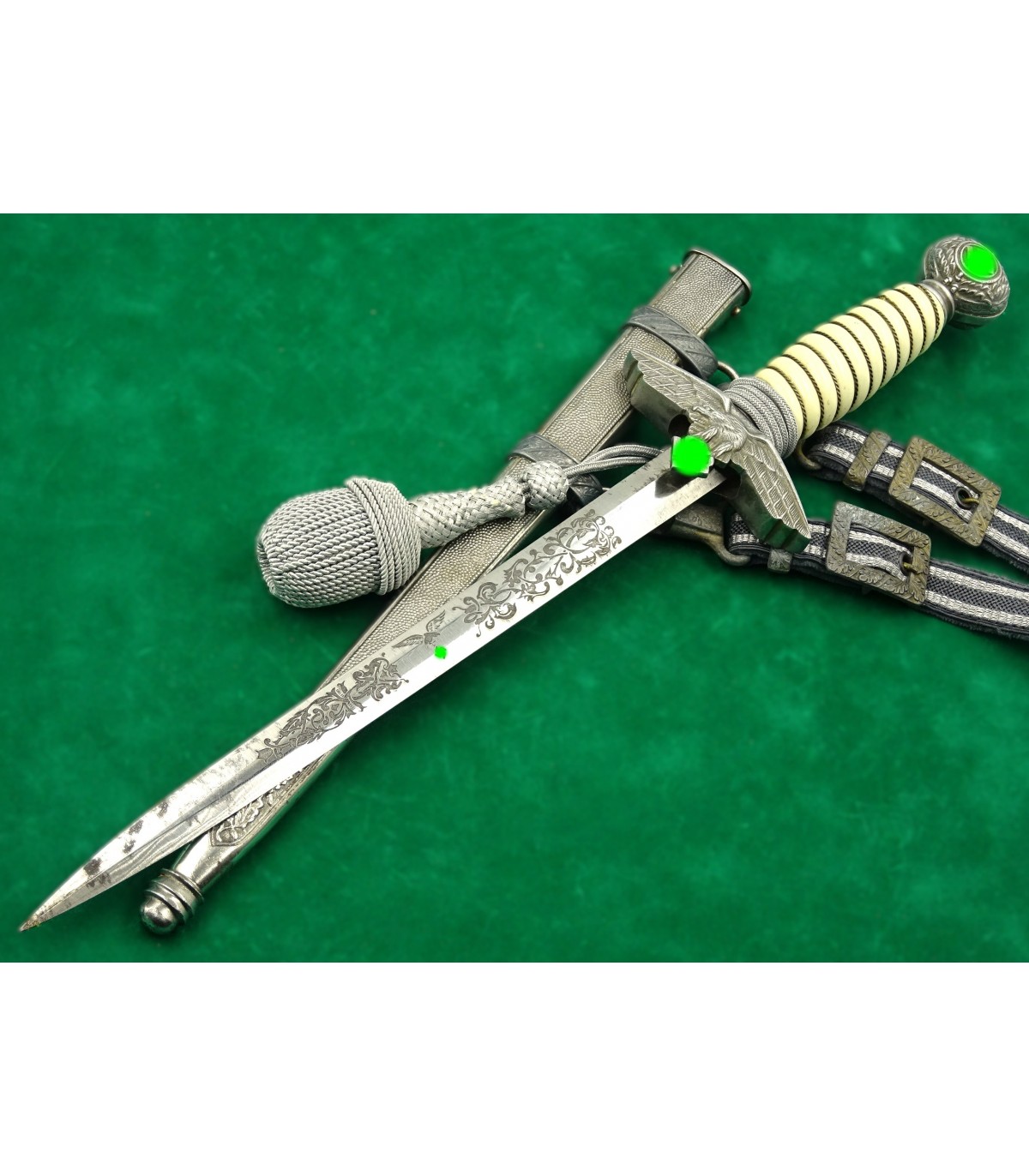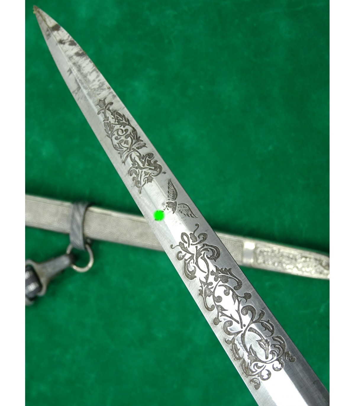 Fusée blanche. Pas de marque de fabrique. Décor de lame à motifs floraux et aigle LW. Avec dragonne et bélière. TBE.