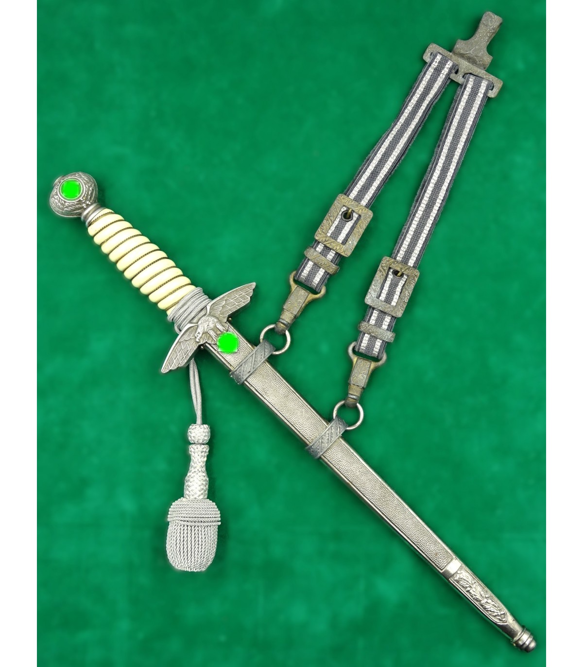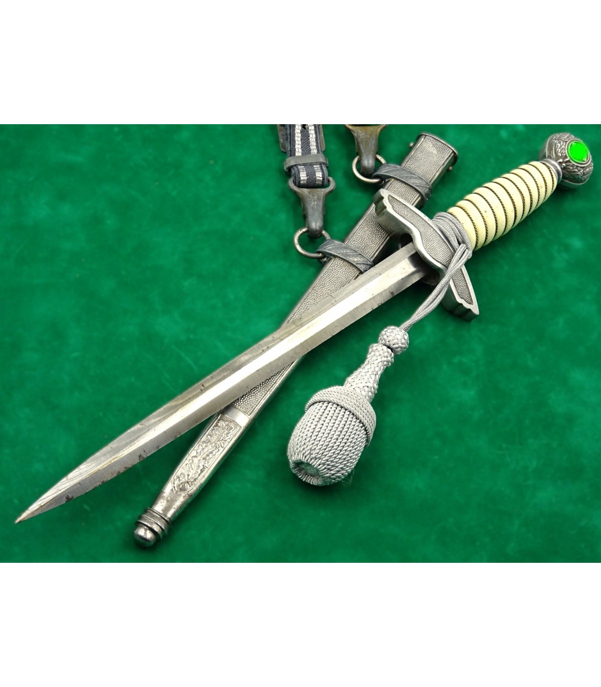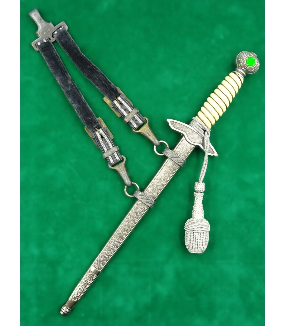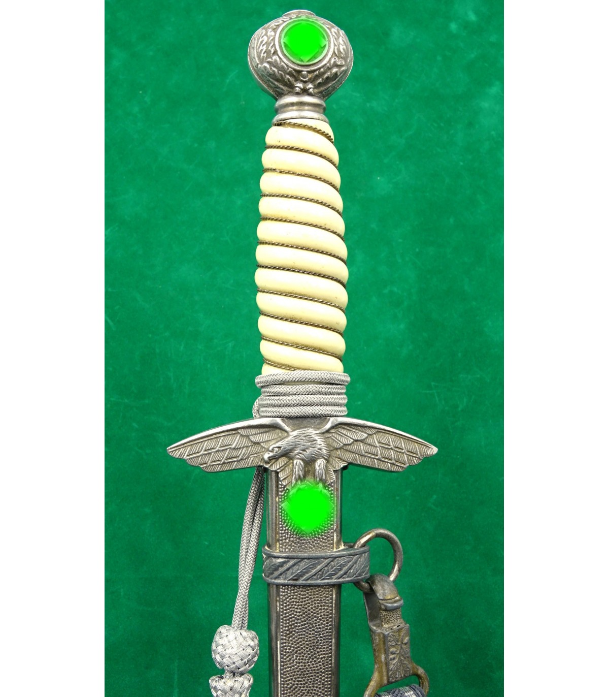 Fusée blanche. Pas de marque de fabrique. Décor de lame à motifs floraux et aigle LW. Avec dragonne et bélière. TBE.