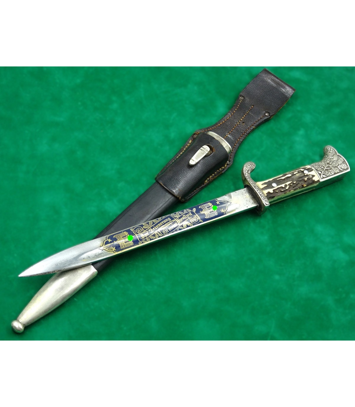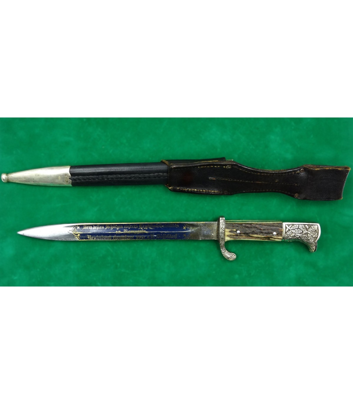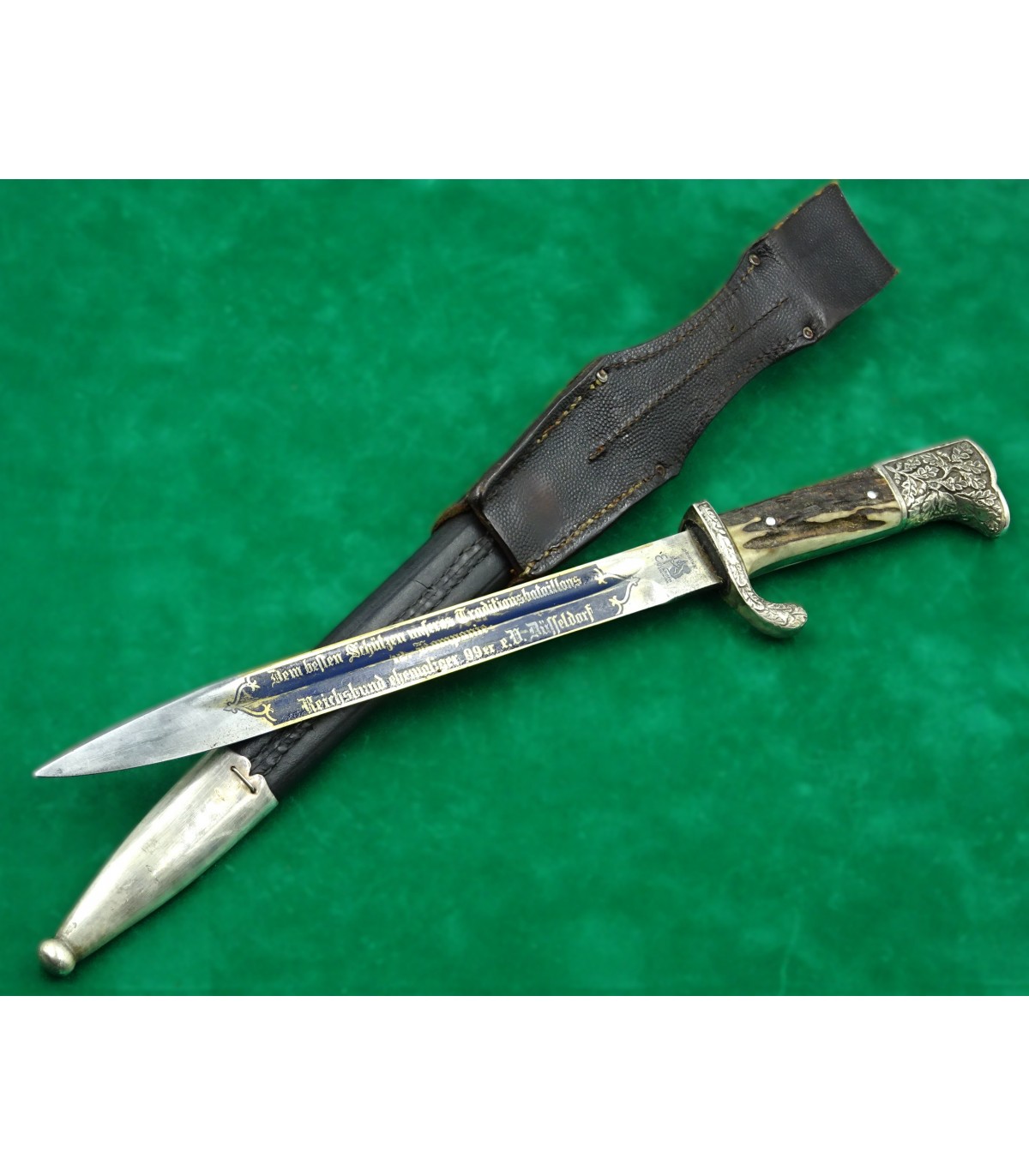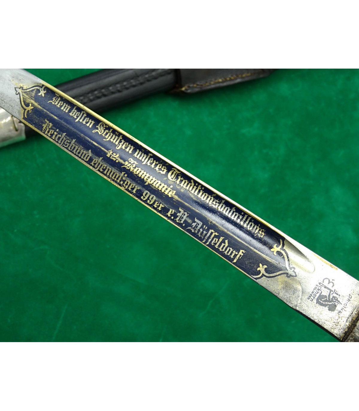 Lame gravée sur les 2 faces, fond bleu, lettres or. Recto: 2 aigles et 'Zur Erinnerung an meine Dienstzeit'. Verso: 'Dem besten Schützen unseres Traditionsbataillons - 12.Kompanie - Reichsbund ehemaliger 99er e.V.Düsseldorf'. Poignée maillechort à décors en relief, plaquettes corne. Fourreau cuir et garnitures maillechort. Avec gousset. Rarissime. BE-TBE.