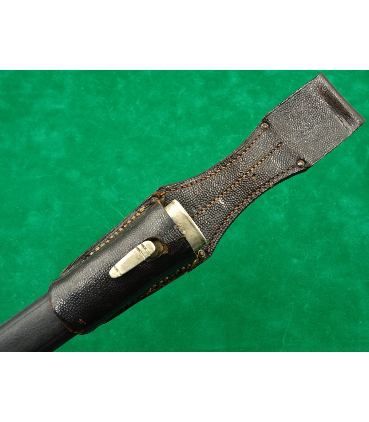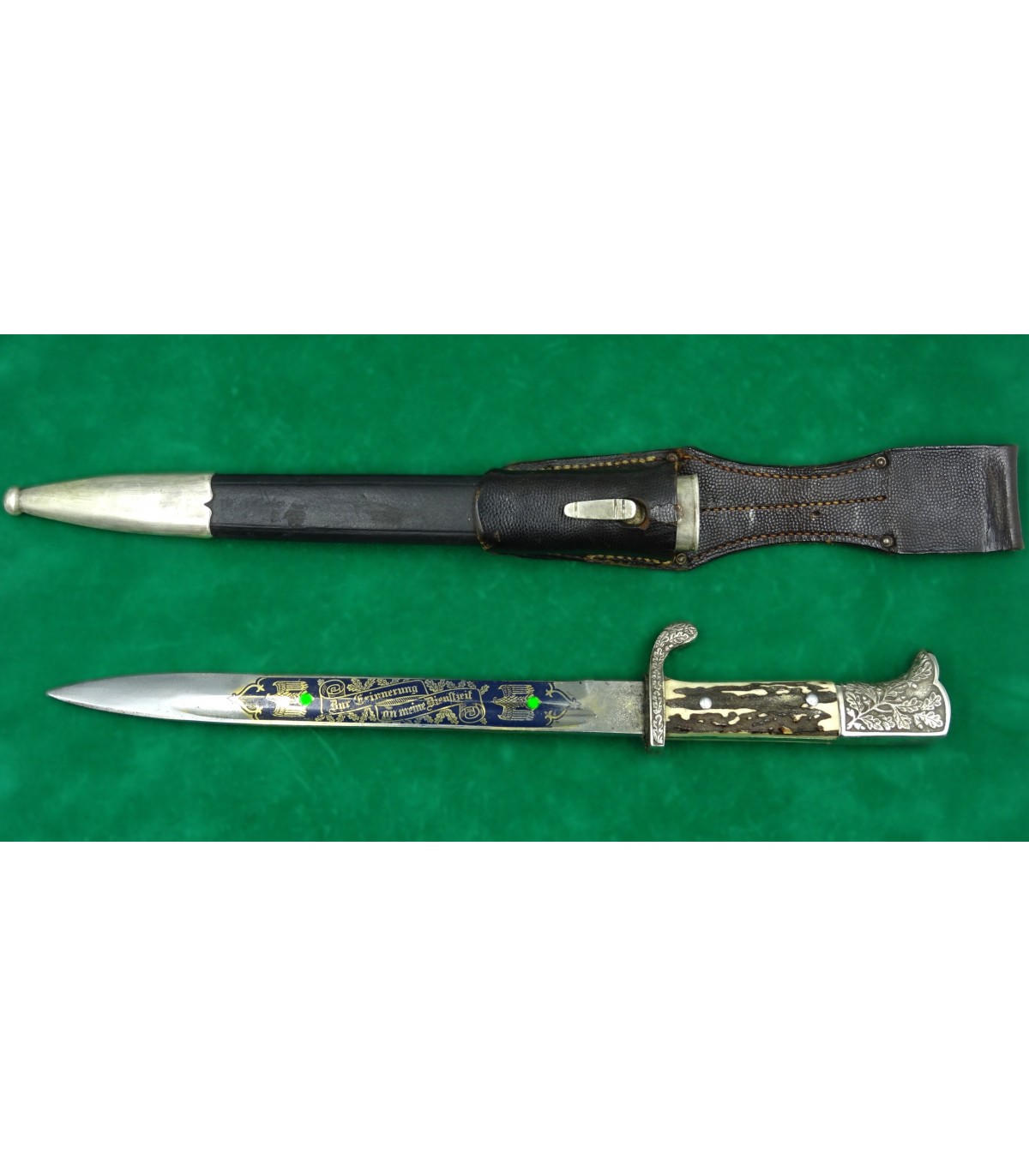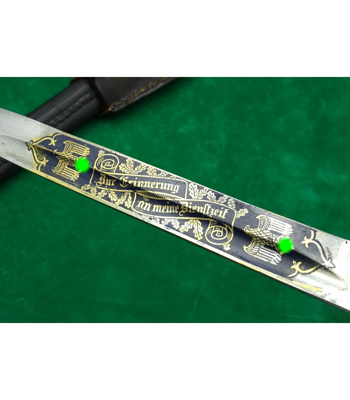 Lame gravée sur les 2 faces, fond bleu, lettres or. Recto: 2 aigles et 'Zur Erinnerung an meine Dienstzeit'. Verso: 'Dem besten Schützen unseres Traditionsbataillons - 12.Kompanie - Reichsbund ehemaliger 99er e.V.Düsseldorf'. Poignée maillechort à décors en relief, plaquettes corne. Fourreau cuir et garnitures maillechort. Avec gousset. Rarissime. BE-TBE.