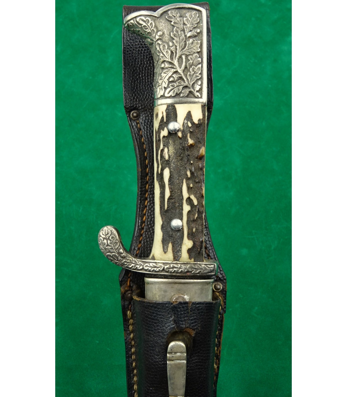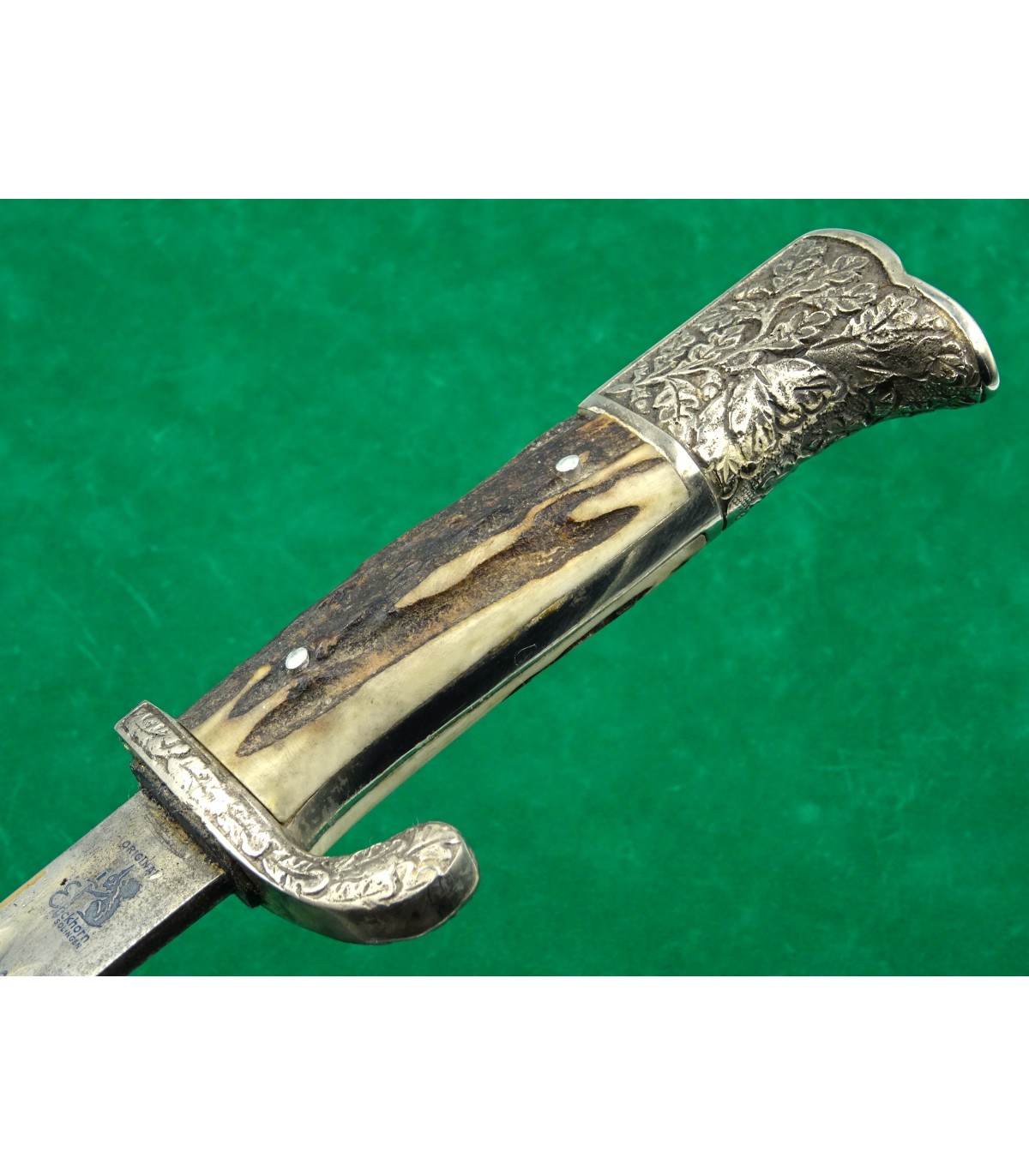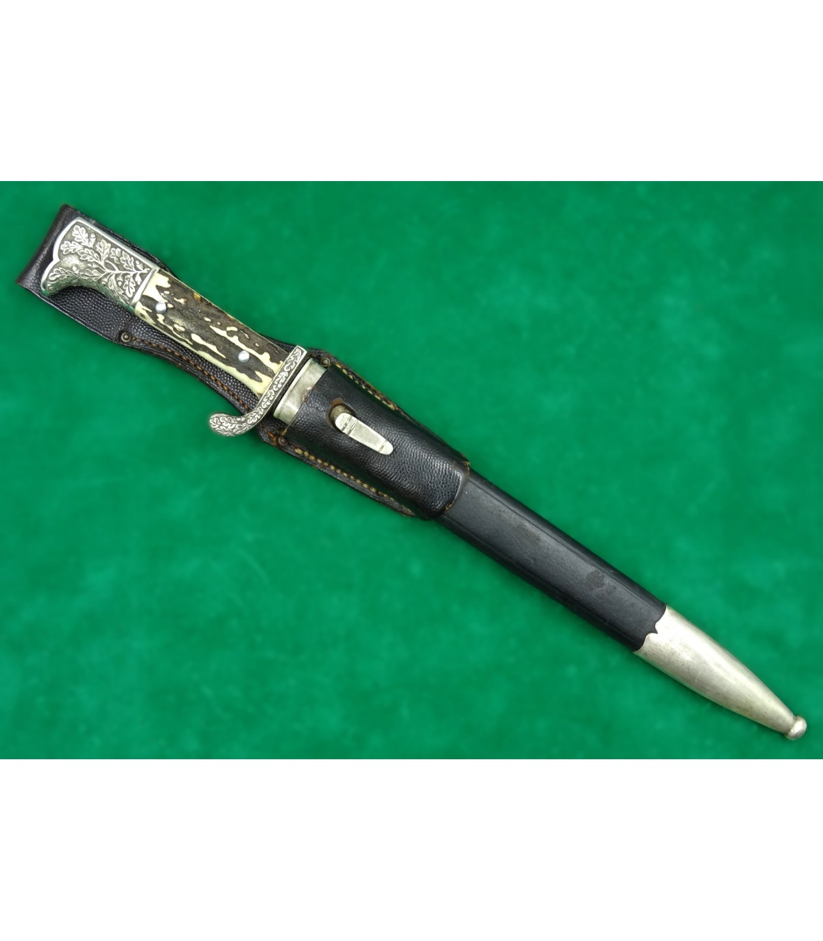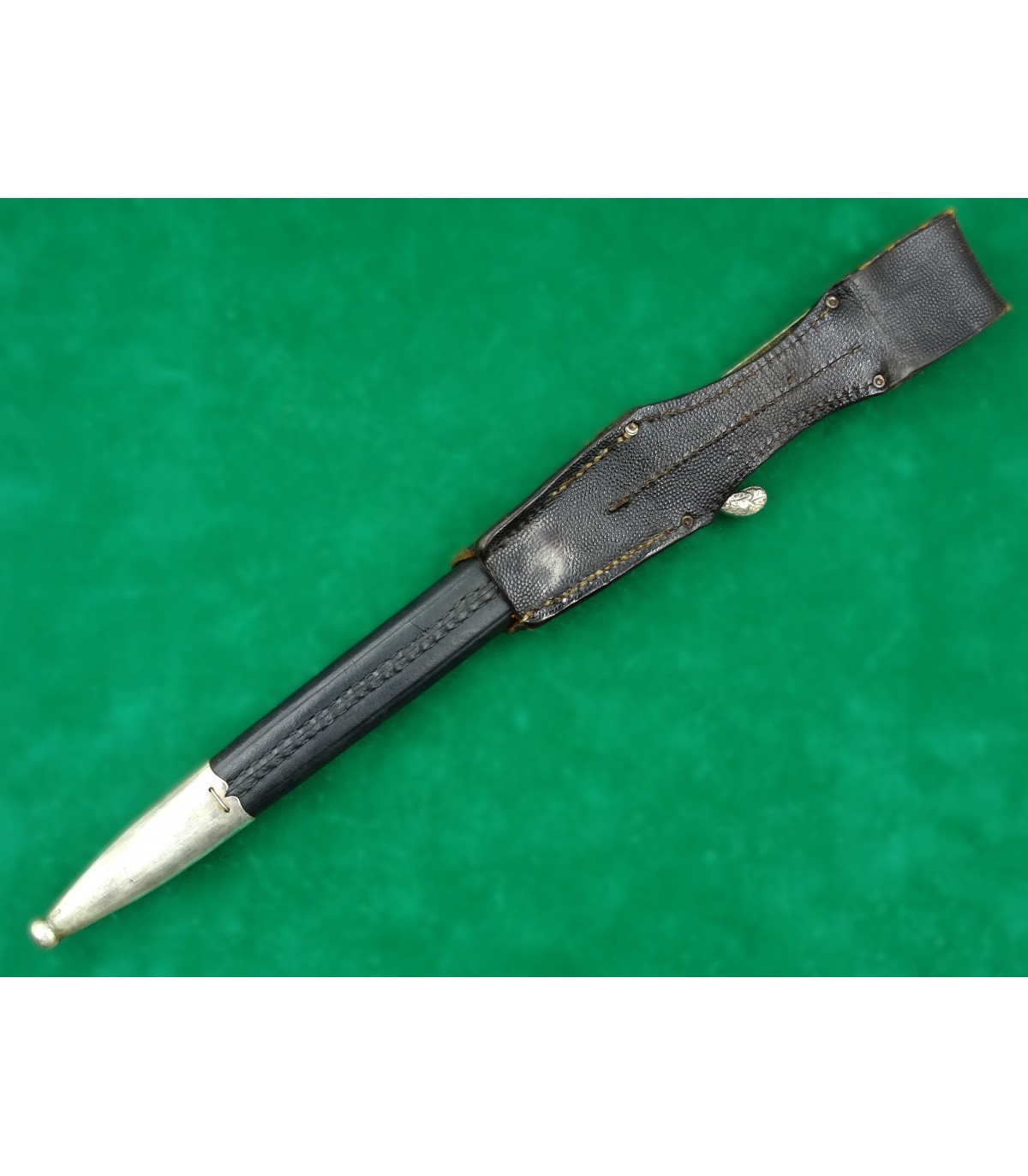Lame gravée sur les 2 faces, fond bleu, lettres or. Recto: 2 aigles et 'Zur Erinnerung an meine Dienstzeit'. Verso: 'Dem besten Schützen unseres Traditionsbataillons - 12.Kompanie - Reichsbund ehemaliger 99er e.V.Düsseldorf'. Poignée maillechort à décors en relief, plaquettes corne. Fourreau cuir et garnitures maillechort. Avec gousset. Rarissime. BE-TBE.