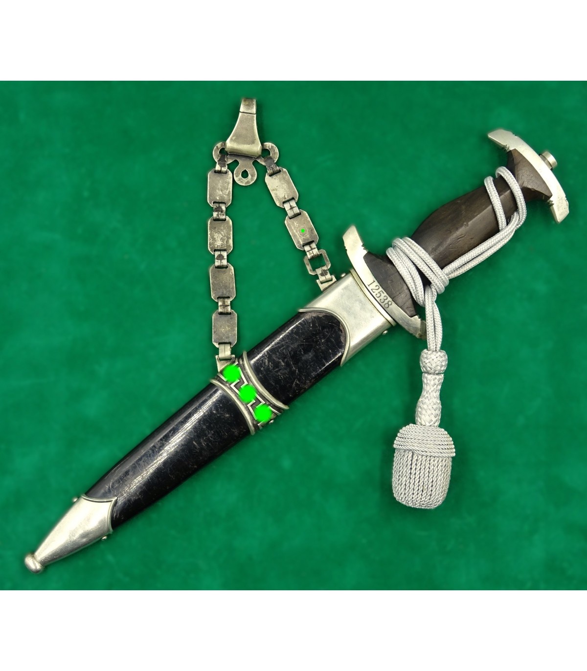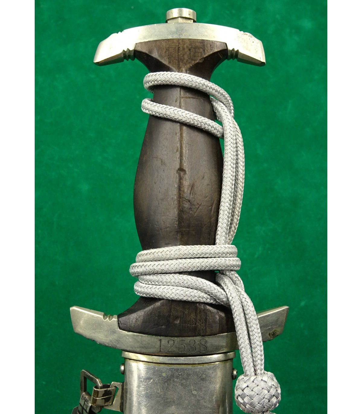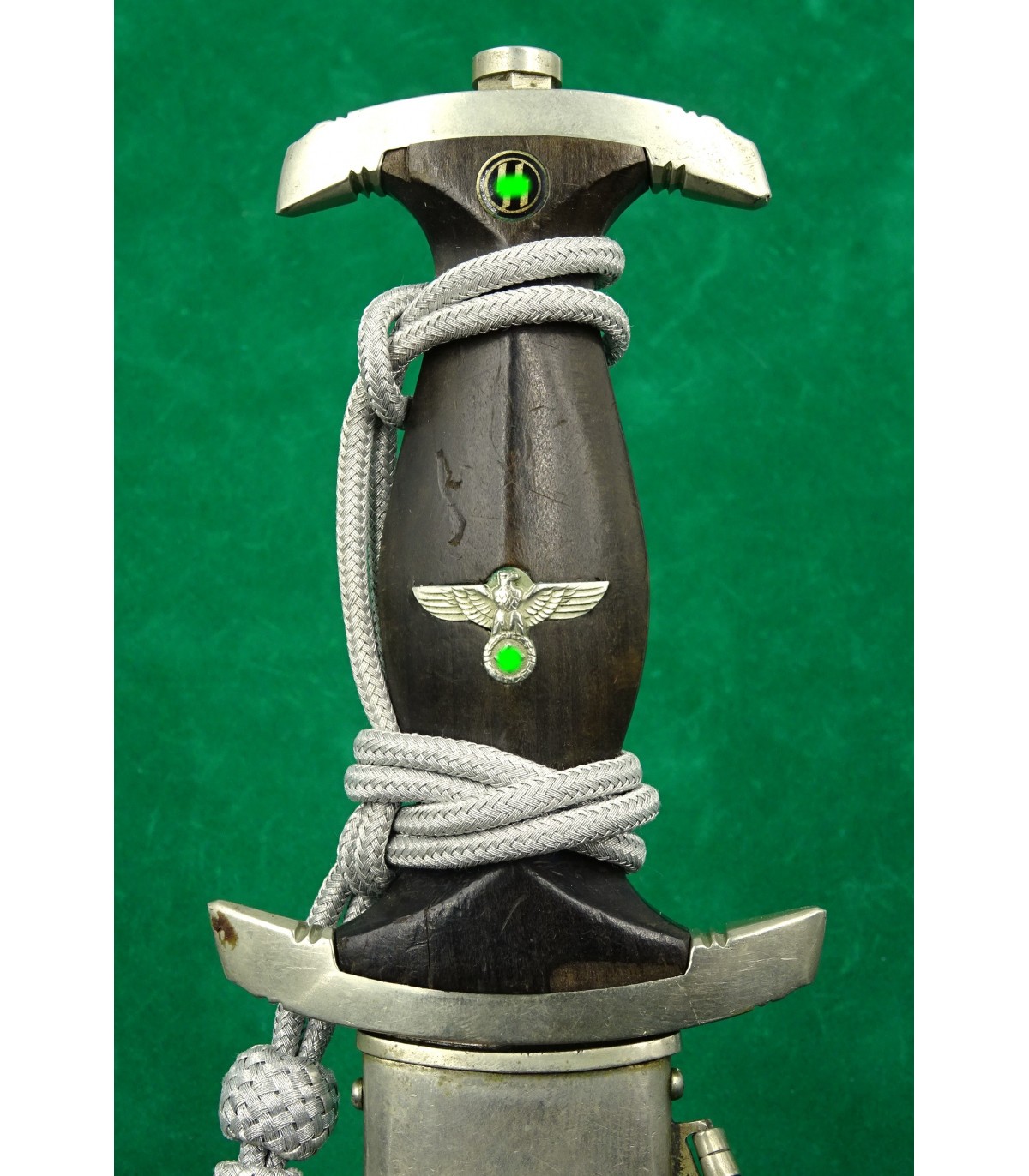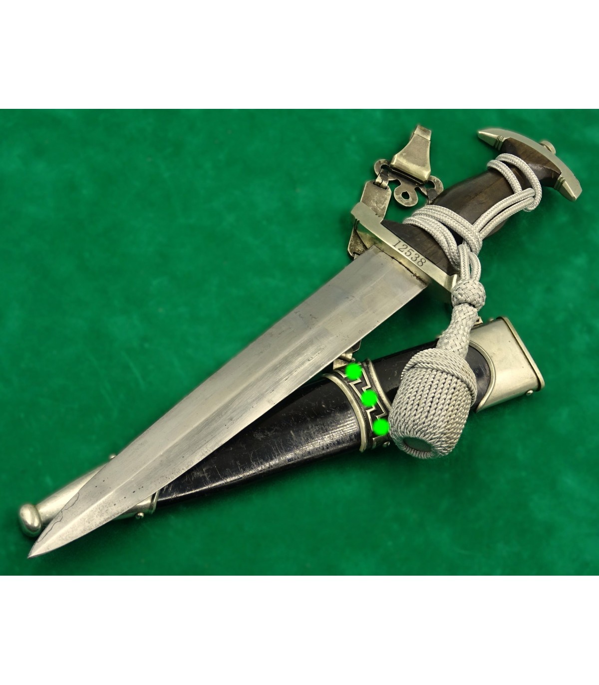 Dague précoce en maillechort. 2 éclats dans la poignée. Email des runes parfait. Aigle maillechort. Laque de fourreau à 90-95%. Bonne lame. Talon de chape de type Eickhorn. Garde basse numérotée 12538, n° SS de M.Kleinschmidt. Dragonne alu. BE-TBE. Rare.