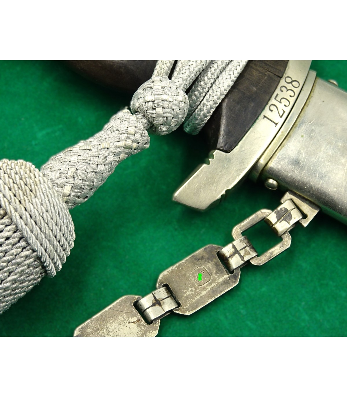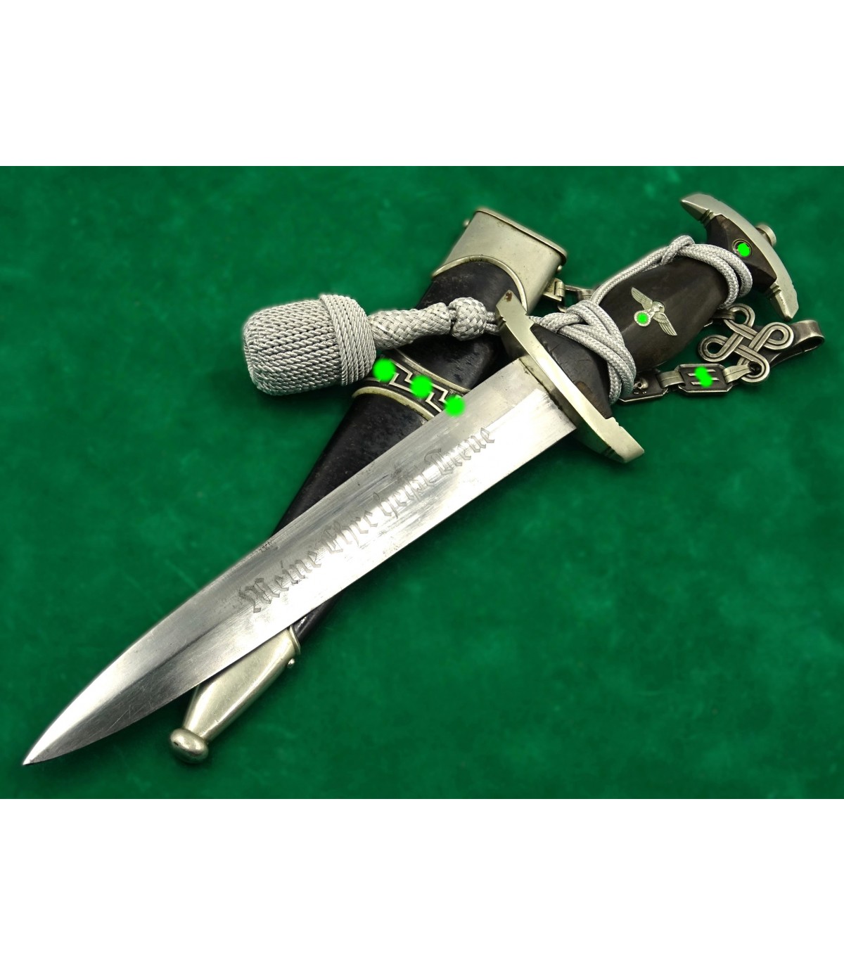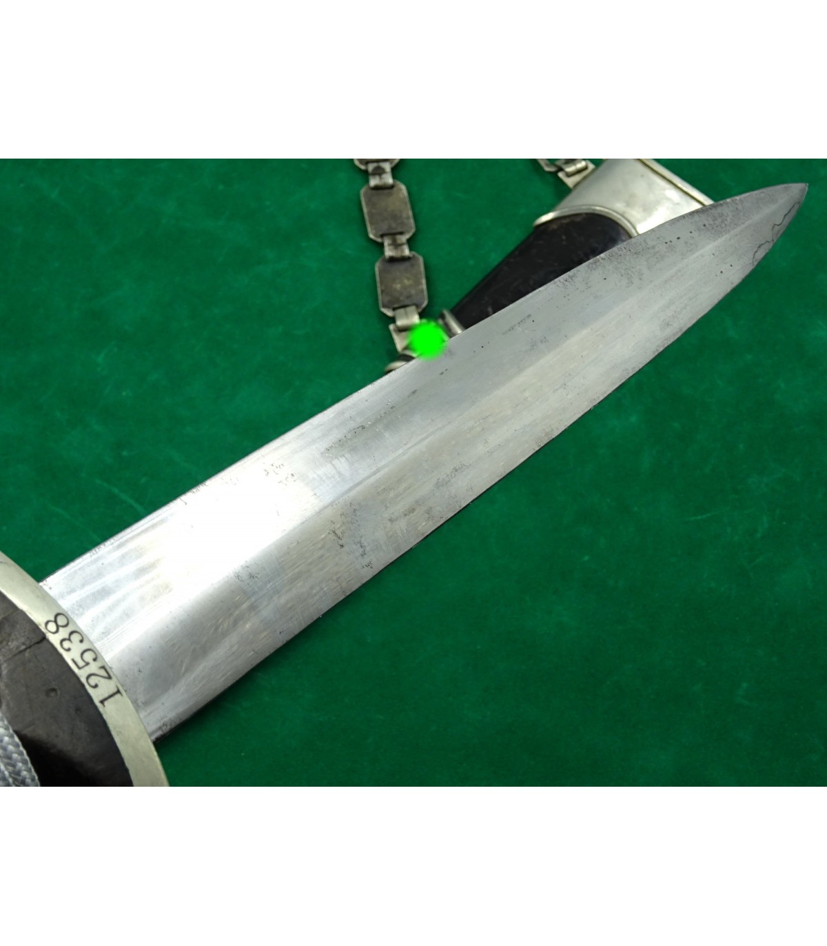 Dague précoce en maillechort. 2 éclats dans la poignée. Email des runes parfait. Aigle maillechort. Laque de fourreau à 90-95%. Bonne lame. Talon de chape de type Eickhorn. Garde basse numérotée 12538, n° SS de M.Kleinschmidt. Dragonne alu. BE-TBE. Rare.