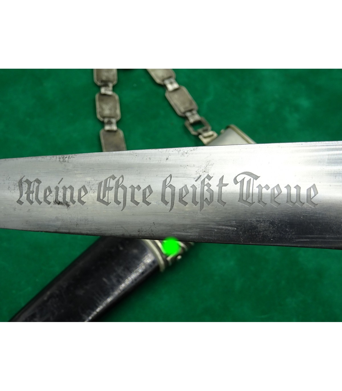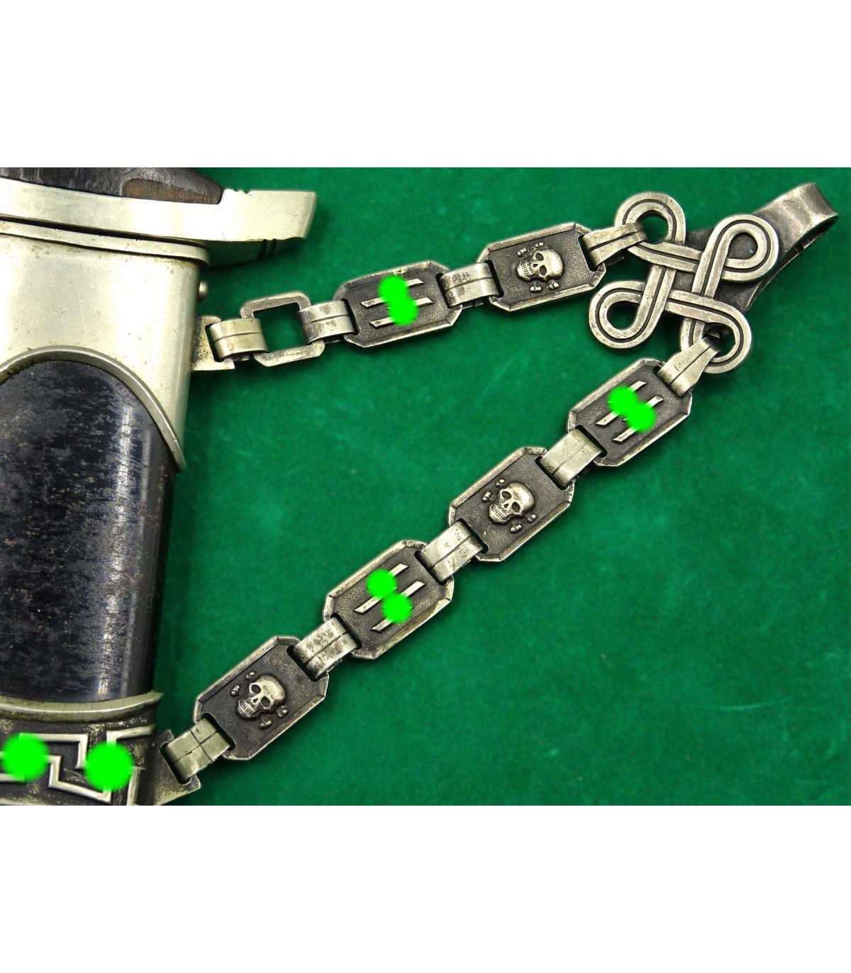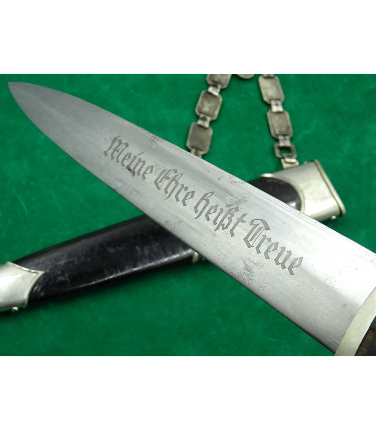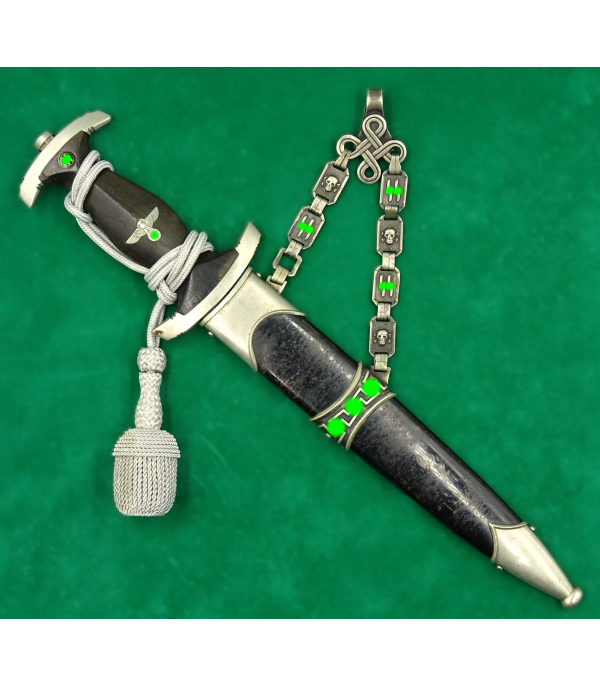 Dague précoce en maillechort. 2 éclats dans la poignée. Email des runes parfait. Aigle maillechort. Laque de fourreau à 90-95%. Bonne lame. Talon de chape de type Eickhorn. Garde basse numérotée 12538, n° SS de M.Kleinschmidt. Dragonne alu. BE-TBE. Rare.