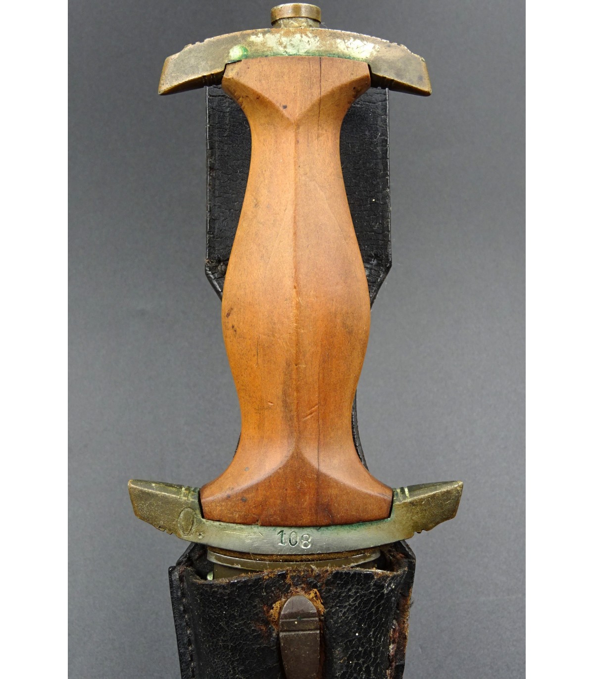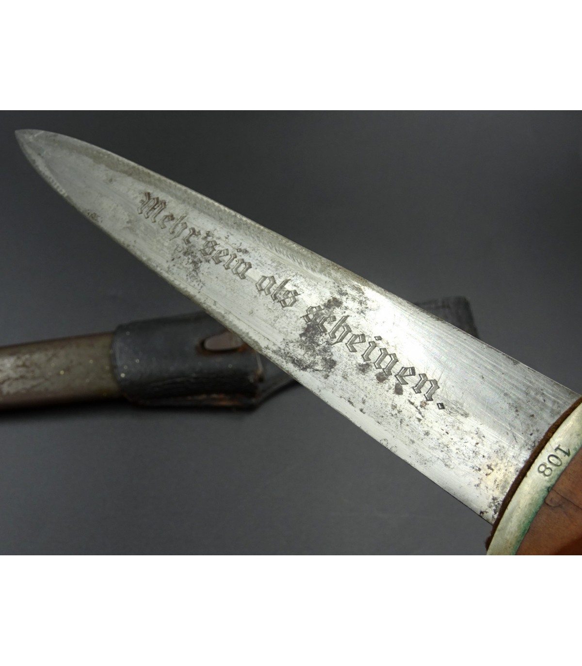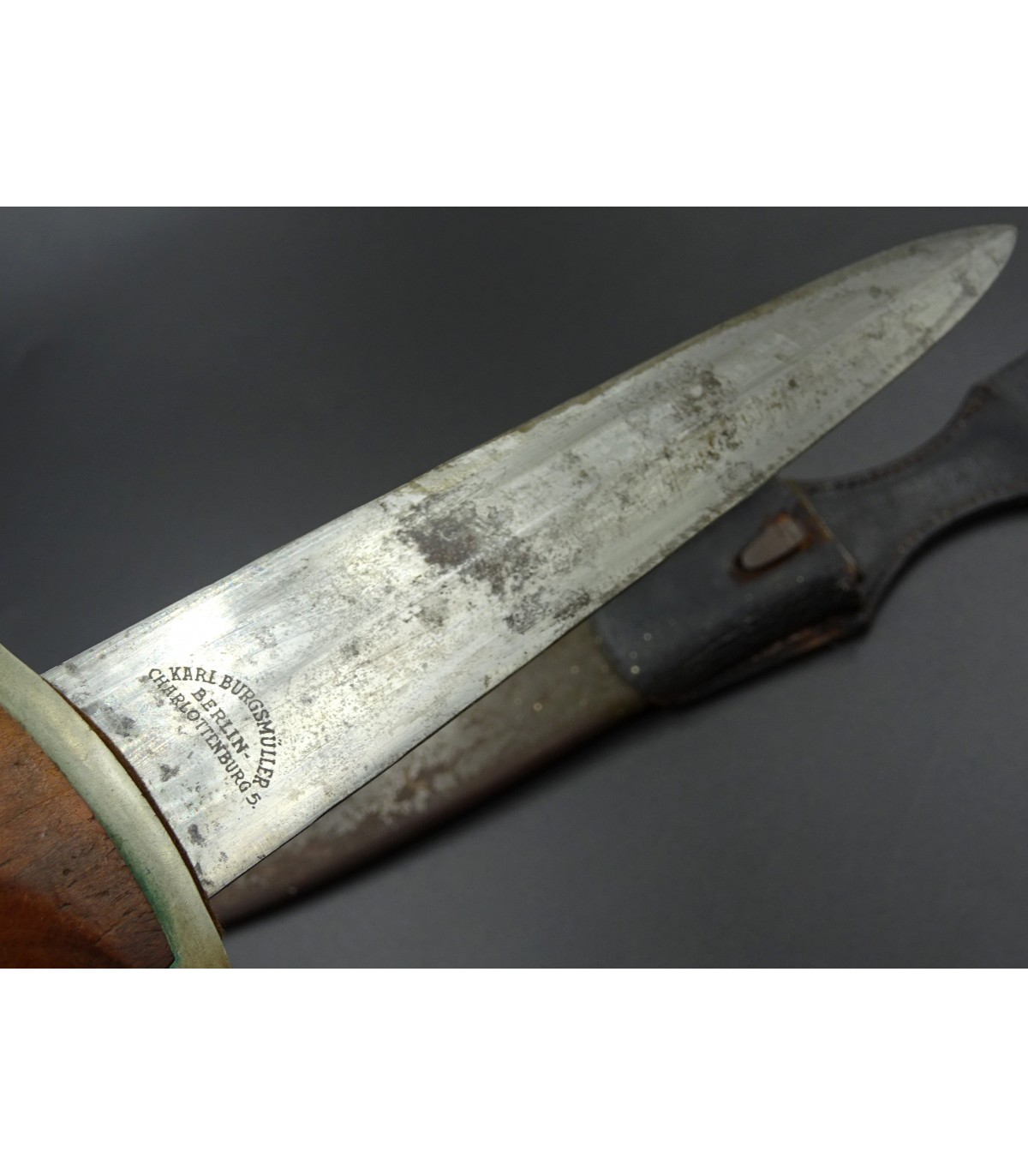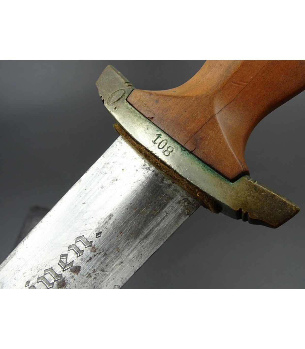 Devise 'Mehr sein als scheinen' (Mieux être que paraitre). Fabricant Karl Burgsmüller Berlin Charlottenburg 5. Peinture du fourreau à 50%. Marquage sur garde O 108. Gousset cuir verni noir. 'Dans son jus'. ABE-.