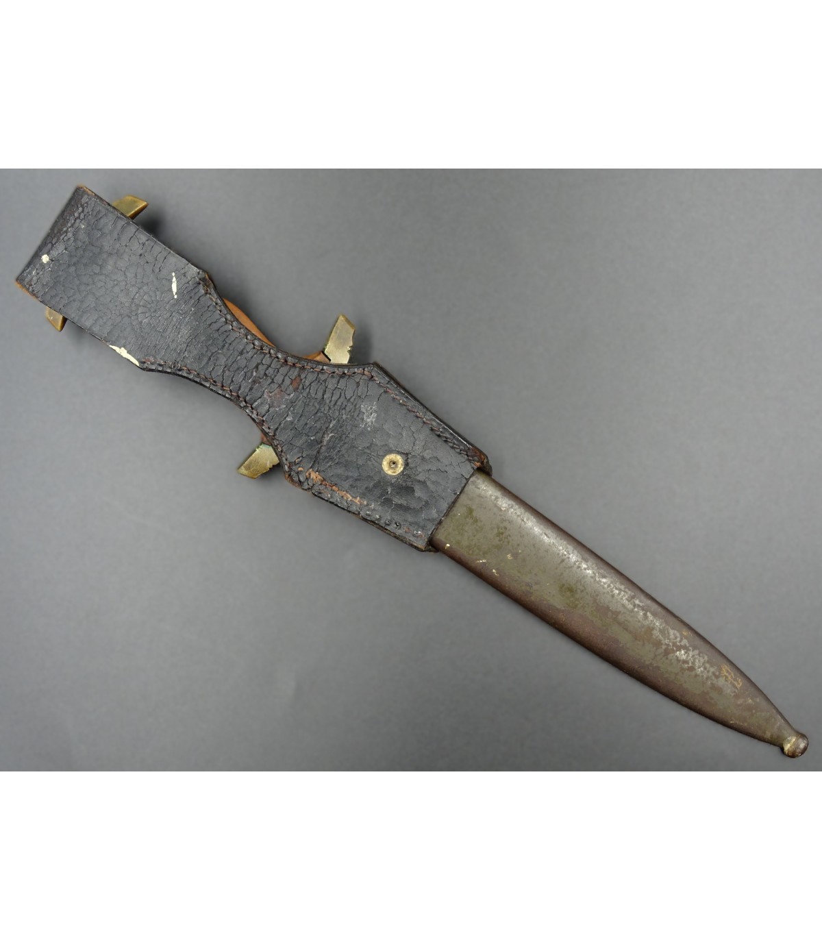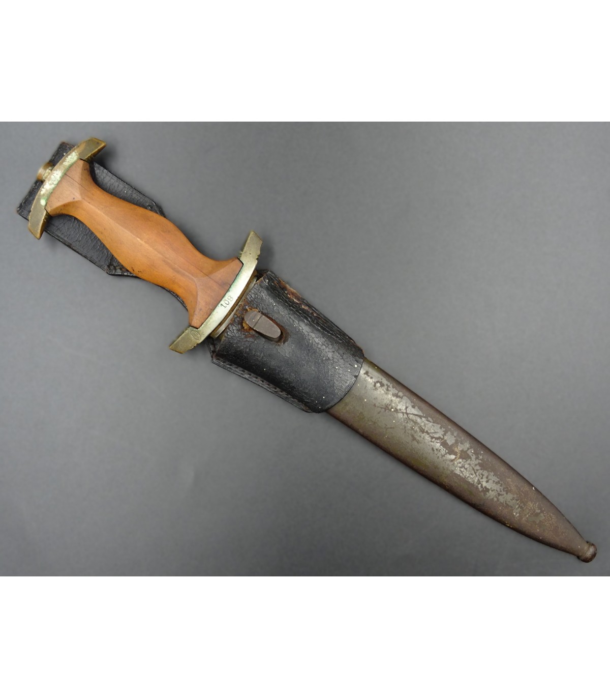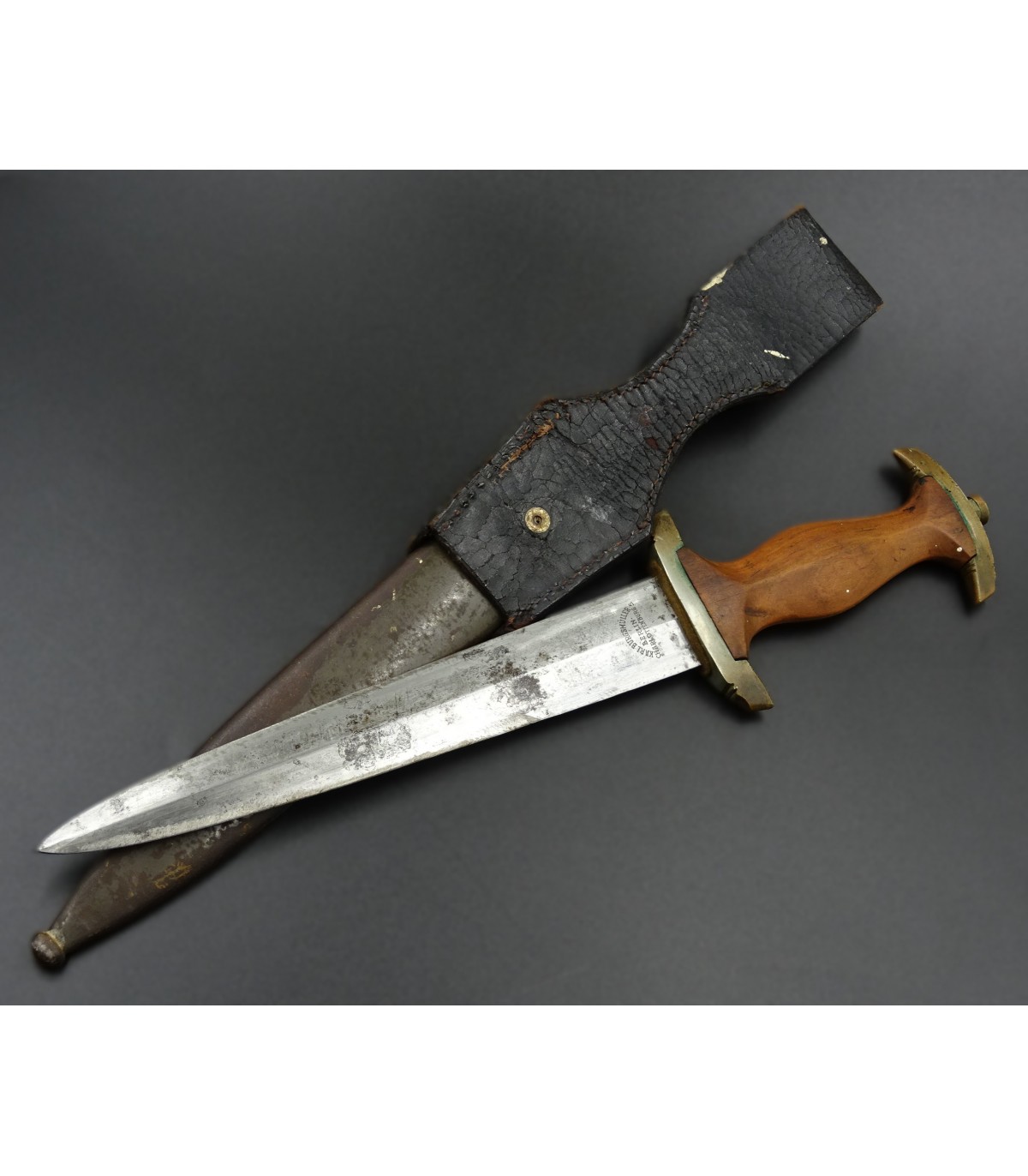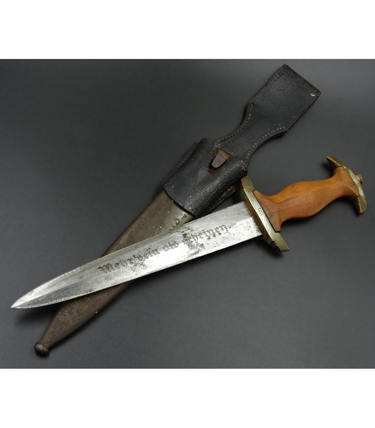 Devise 'Mehr sein als scheinen' (Mieux être que paraitre). Fabricant Karl Burgsmüller Berlin Charlottenburg 5. Peinture du fourreau à 50%. Marquage sur garde O 108. Gousset cuir verni noir. 'Dans son jus'. ABE-.