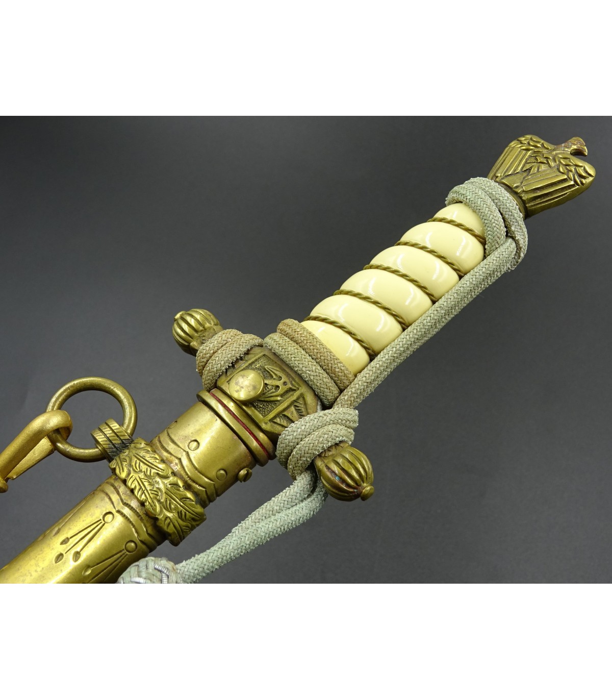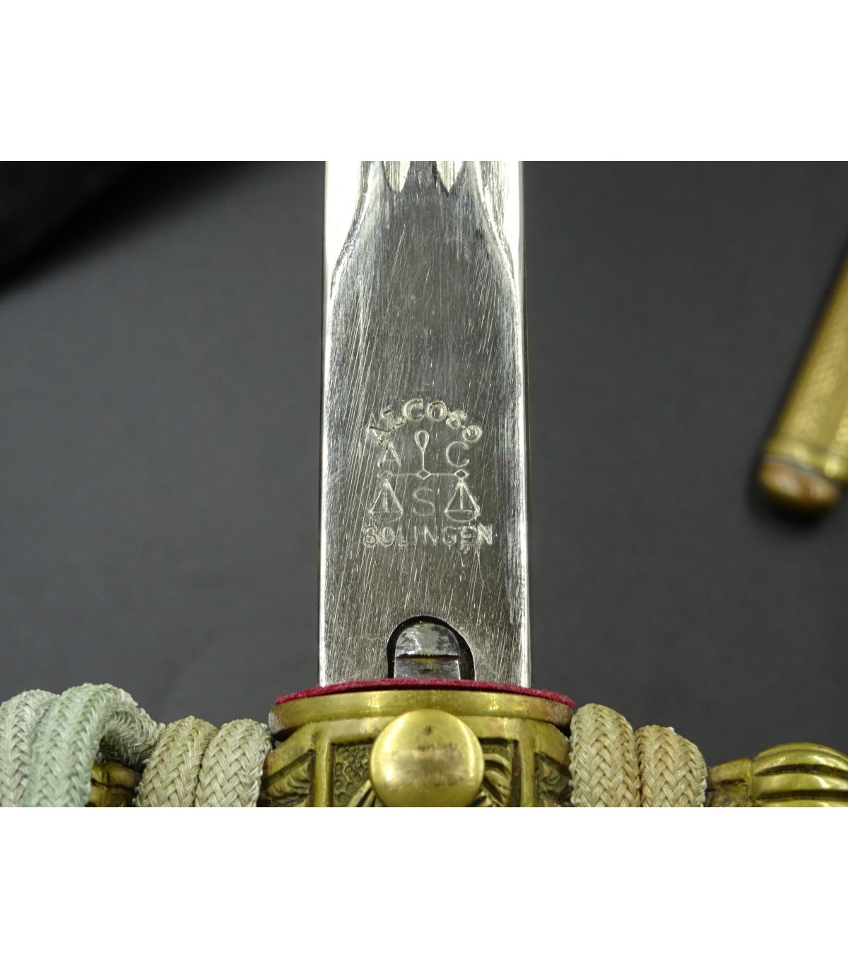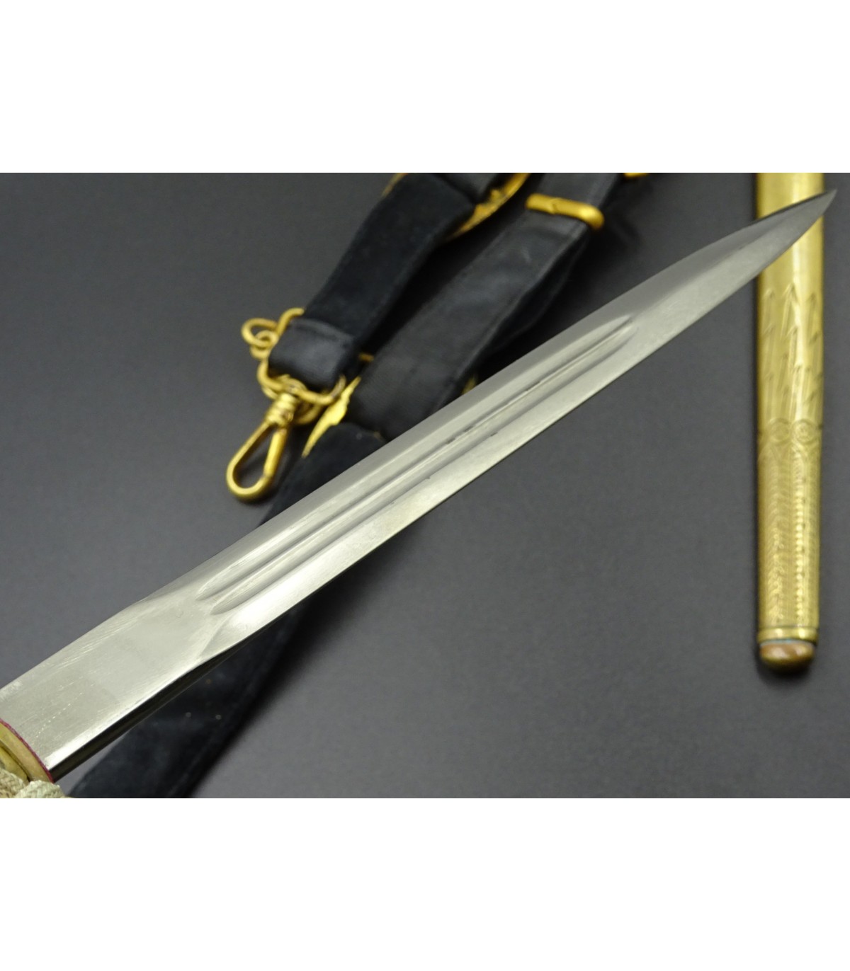 Très belle lame à double gorge, sans décor. Fusée blanche. Fourreau sans choc (manque une vis). Dragonne cellon et aluminium. Avec bélière, ferrures en alu doré. TBE.