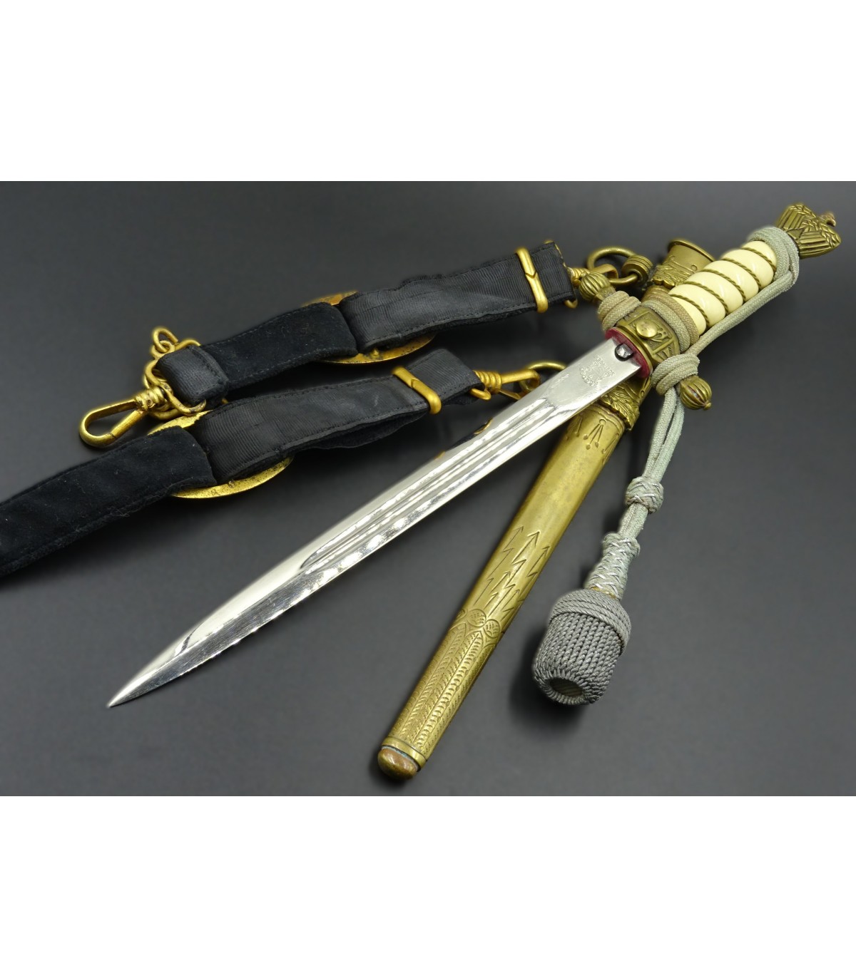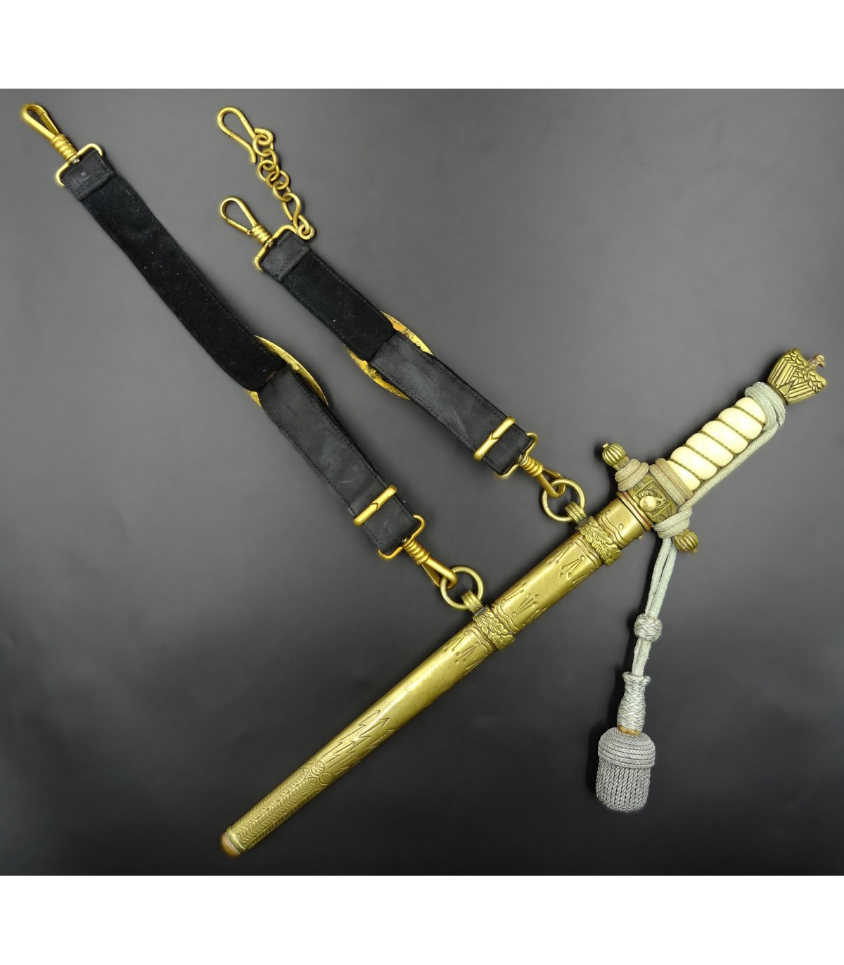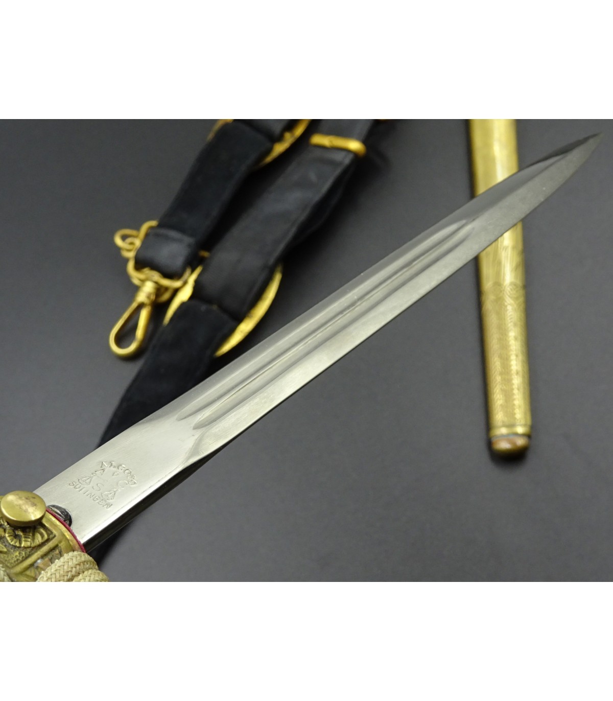 Très belle lame à double gorge, sans décor. Fusée blanche. Fourreau sans choc (manque une vis). Dragonne cellon et aluminium. Avec bélière, ferrures en alu doré. TBE.