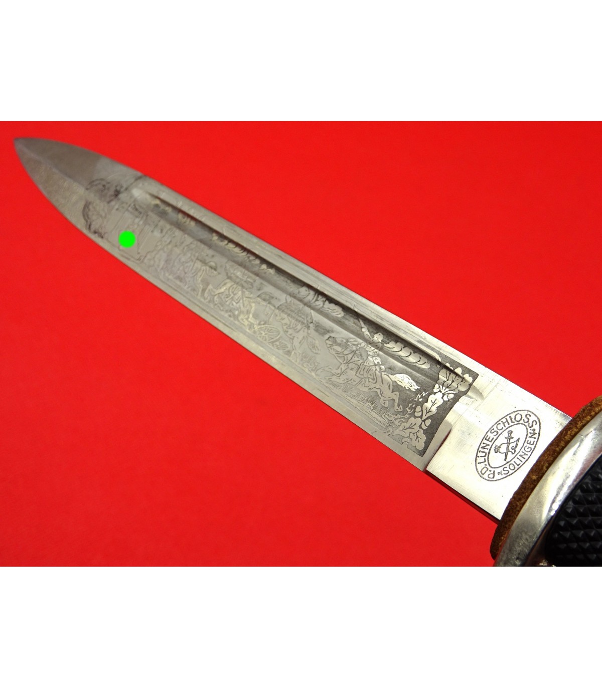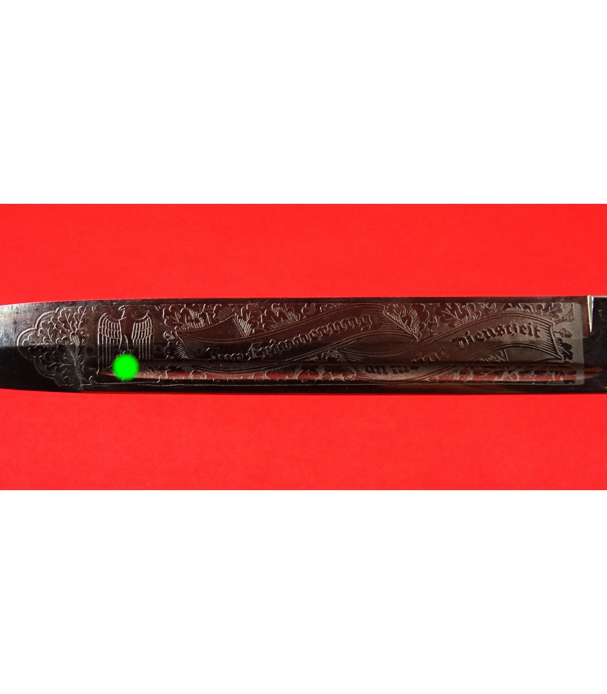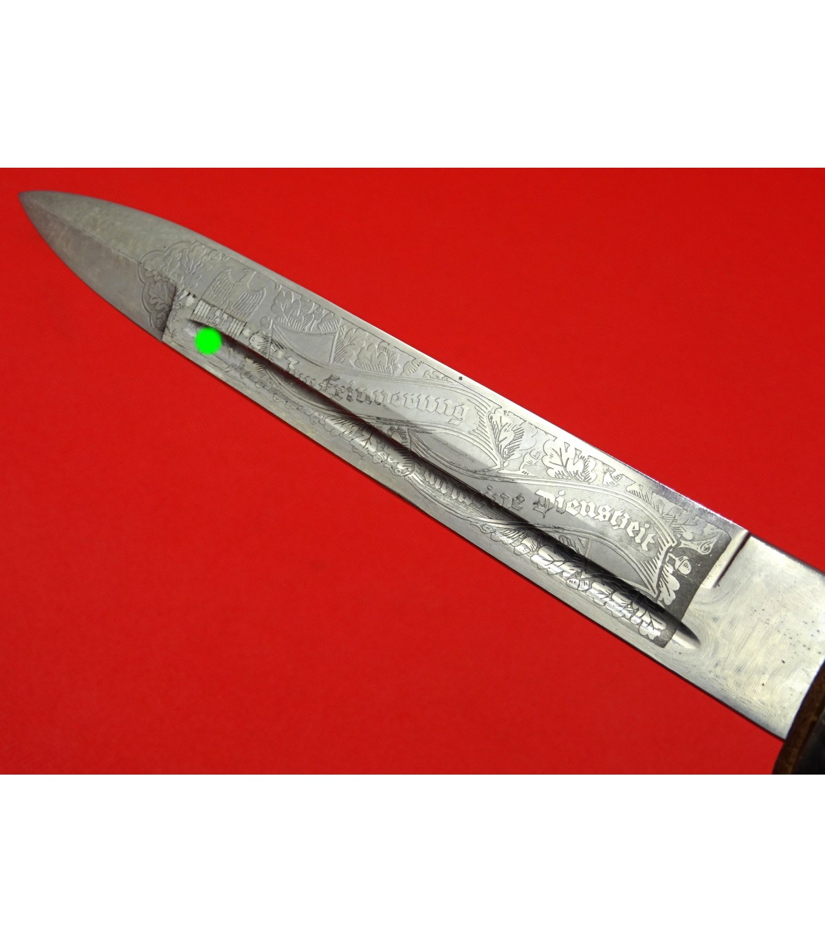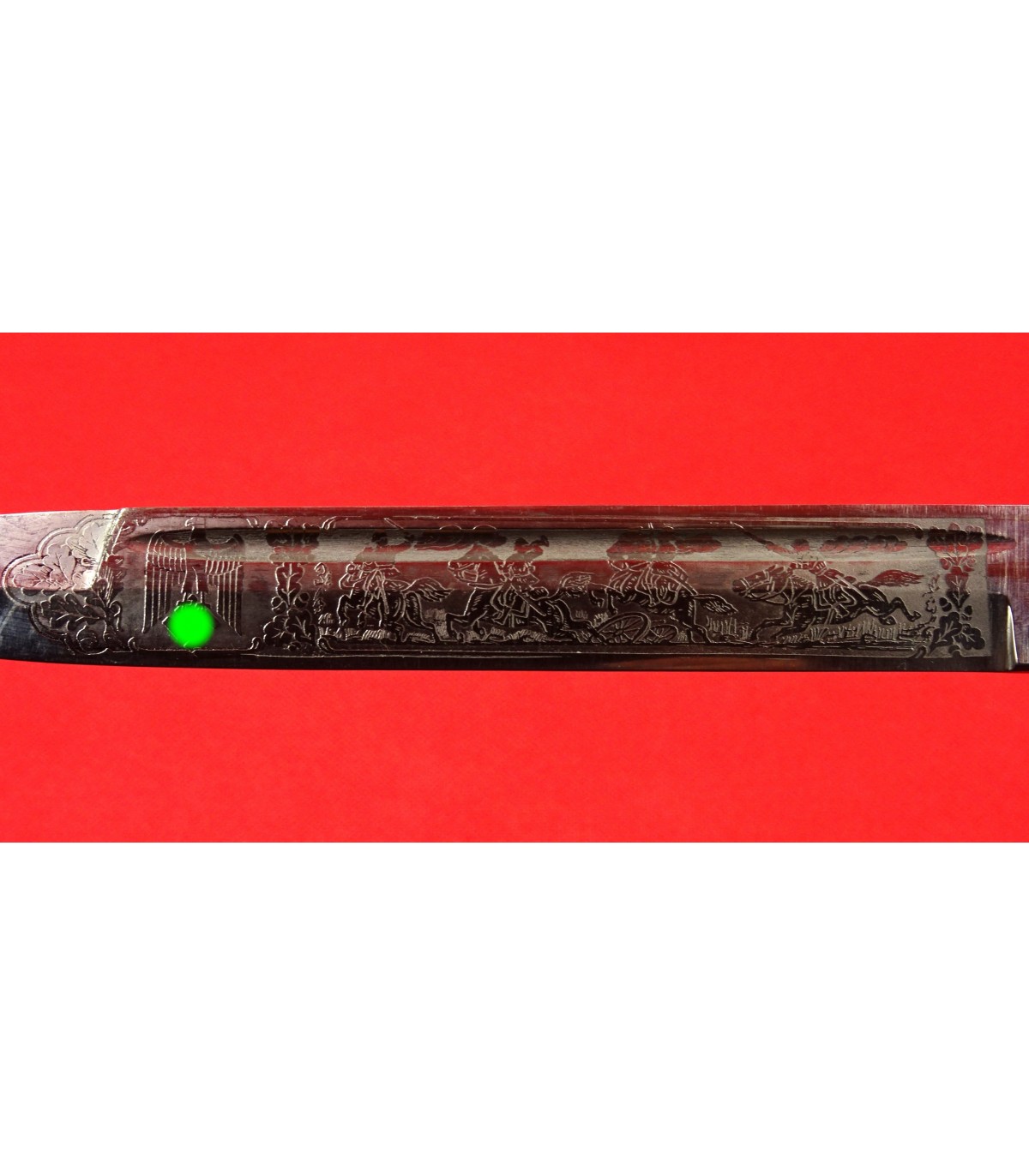 Lame gravée sur les 2 faces, Zur Erinnerung an meine Dienstzeit et décor de charge de cavalerie. Laque de fourreau à 100%. Superbe !