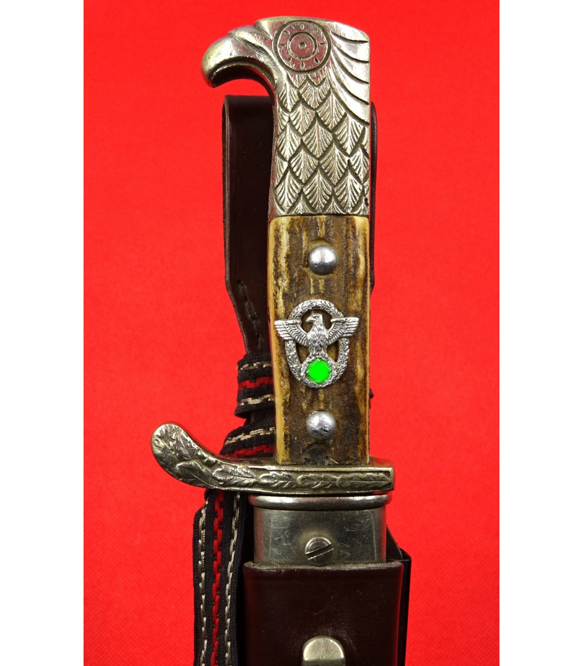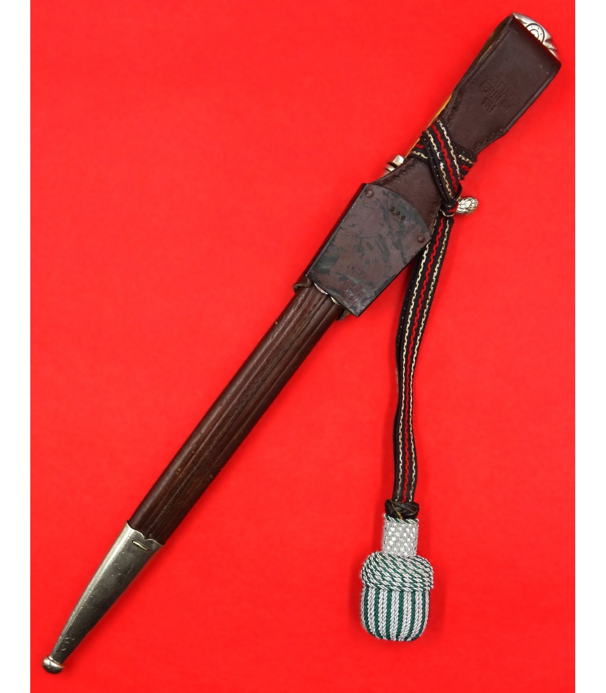 Complète avec gousset et dragonne. Cuir de gousset et de fourreau marron. Garnitures maillechort. Plaquettes corne, aigle alu. Différents numéros de garde et de fourreau. TBE.