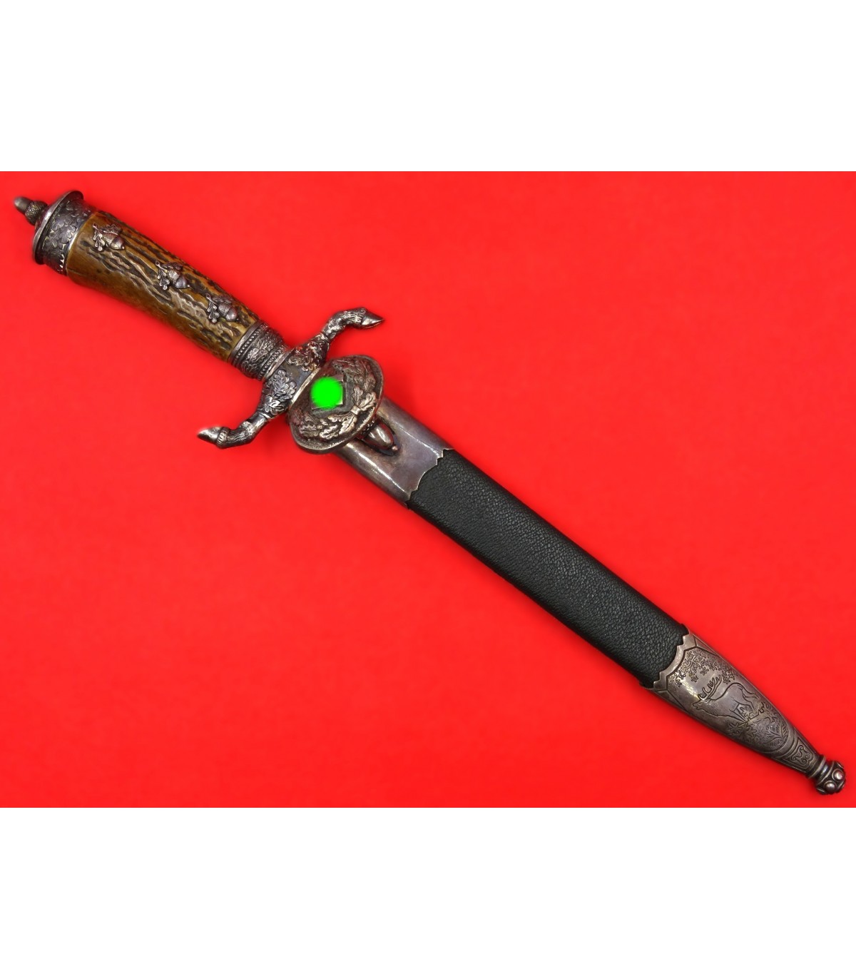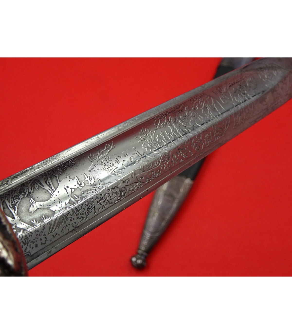 Poignée corne, garnitures argentées, belle lame à décors de chasse sur les 2 face. Fourreau gainé de cuir vert. Longueur 44cm. Superbe !