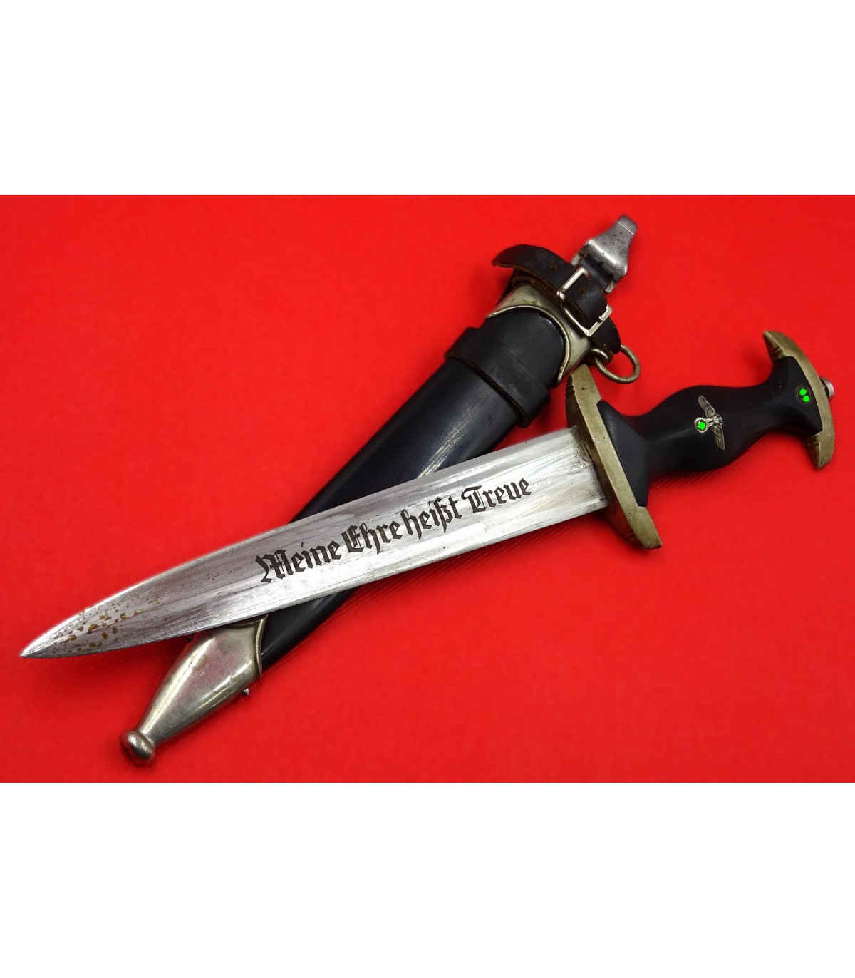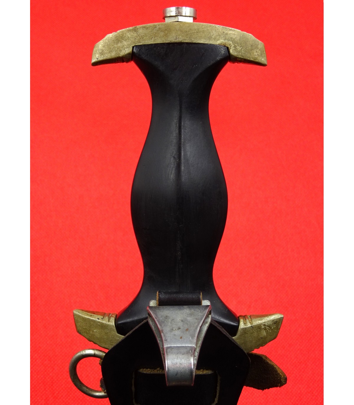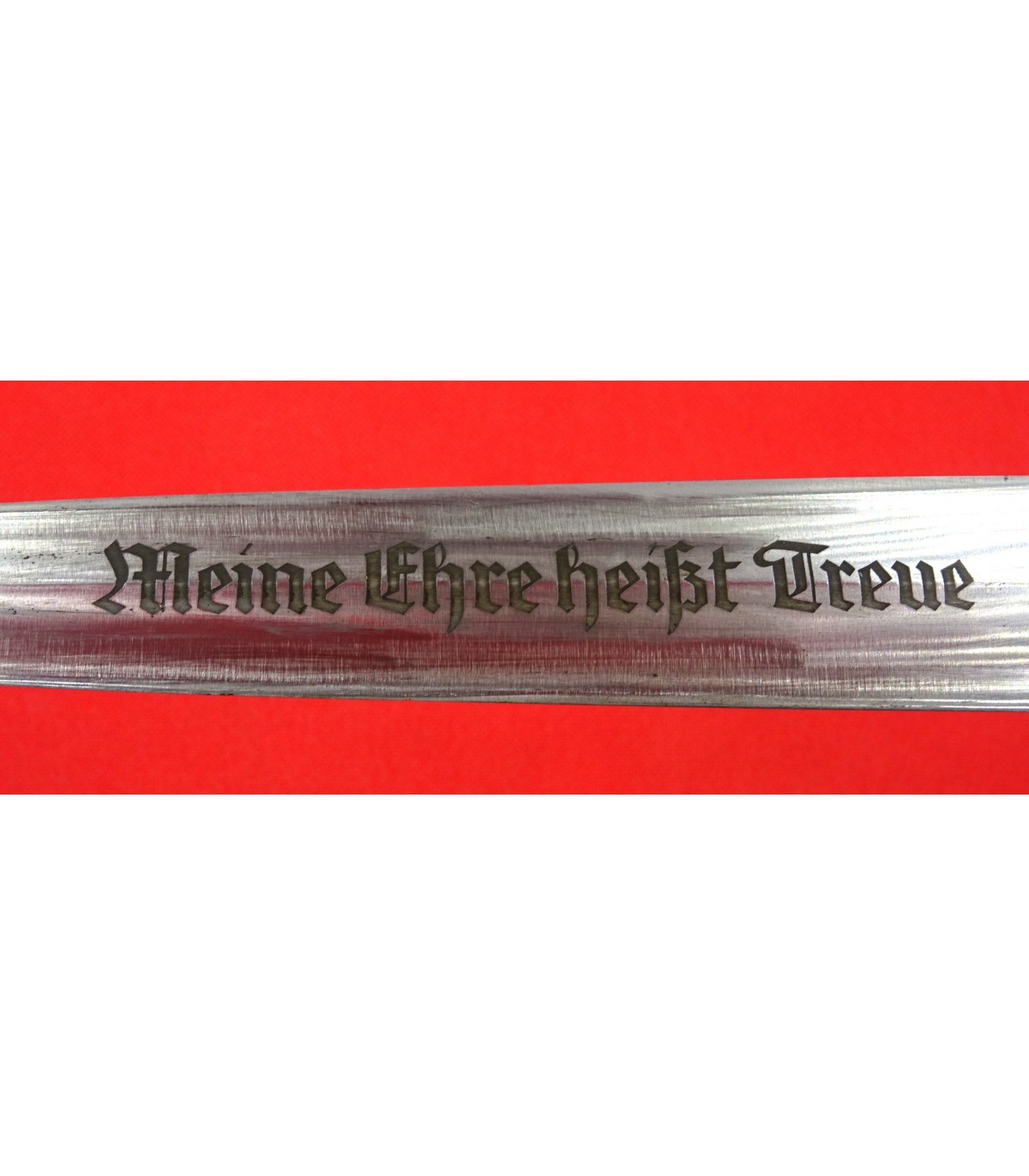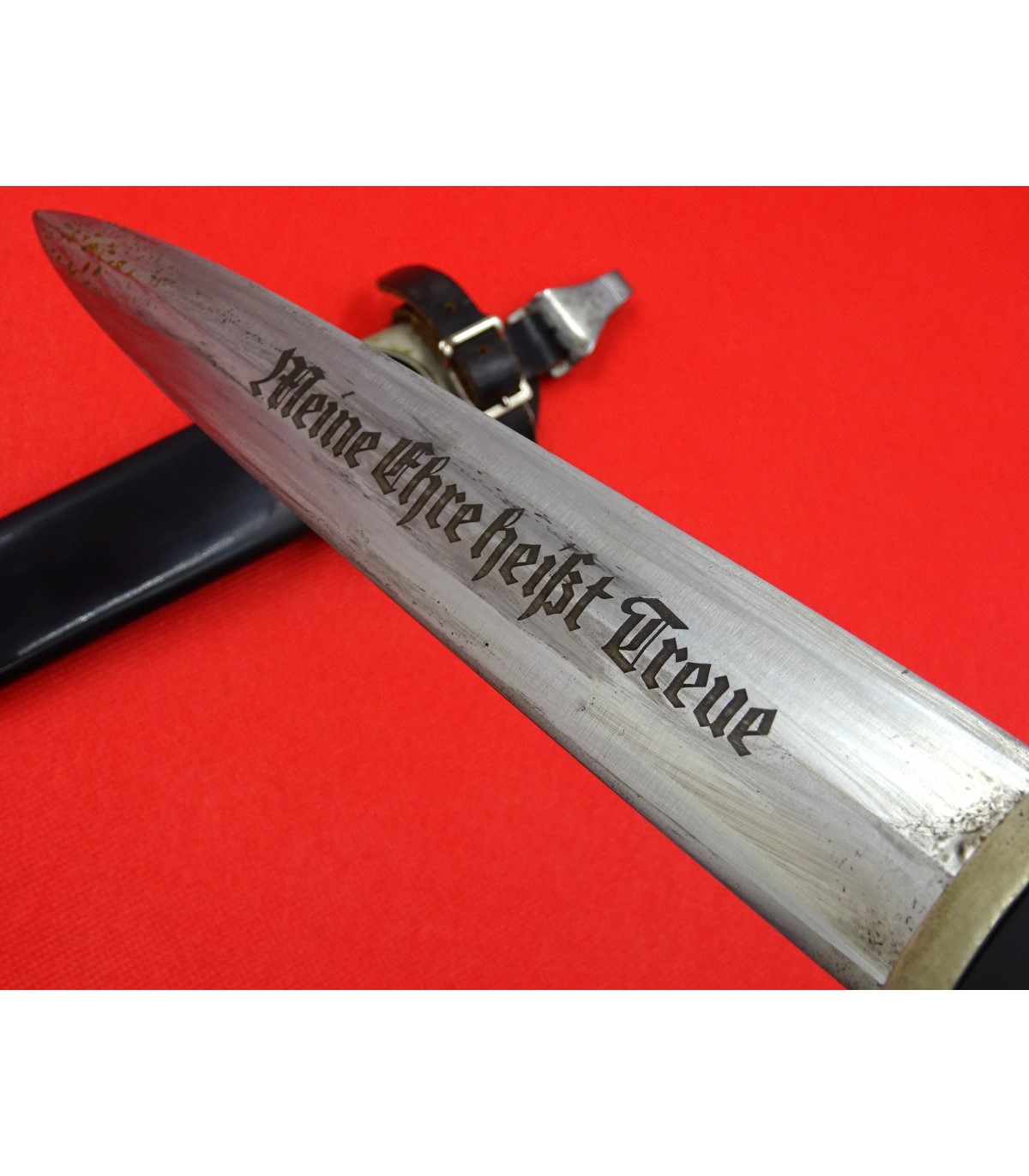 Garnitures maillechort. SS Gruppe II sur garde. Belle poignée sans choc, aigle maillechort. Très belle lame. Laque de fourreau à 100%. Avec attache verticale, mousqueton OLC M5/71. TBE.