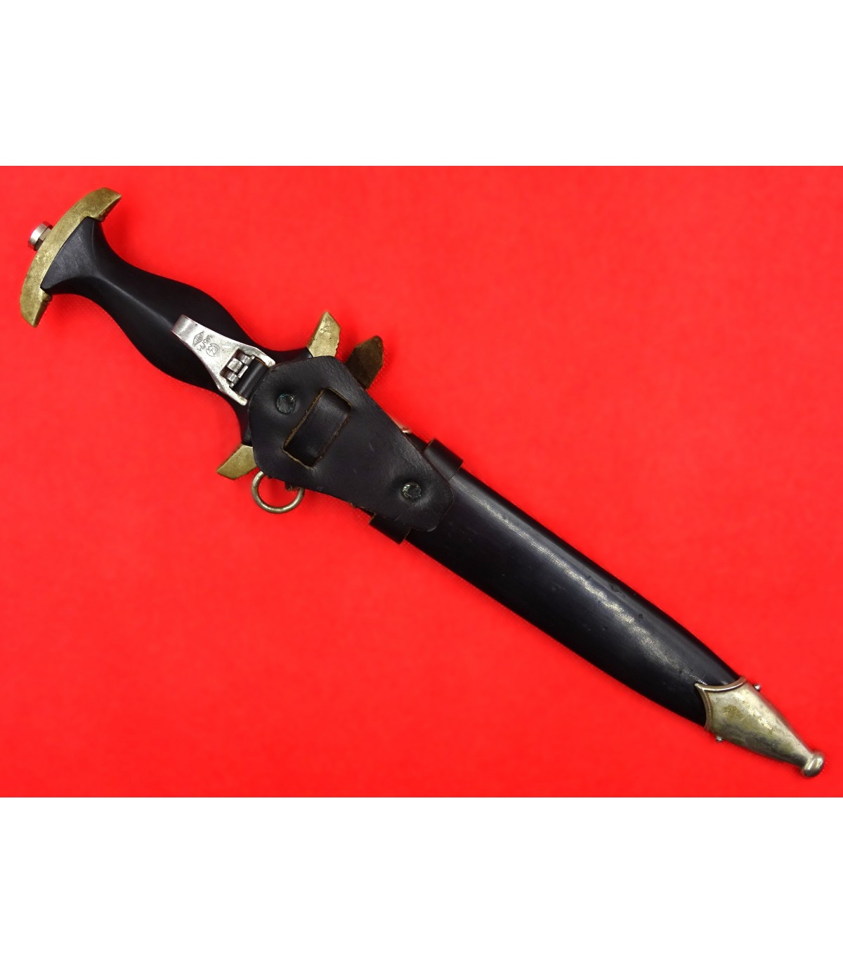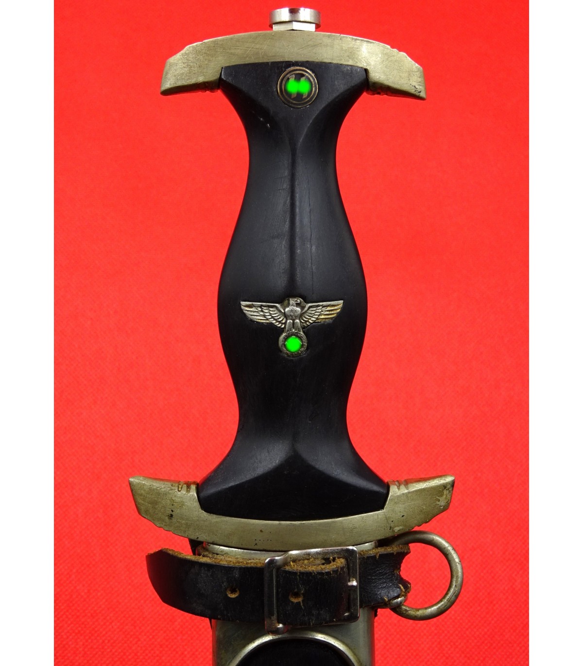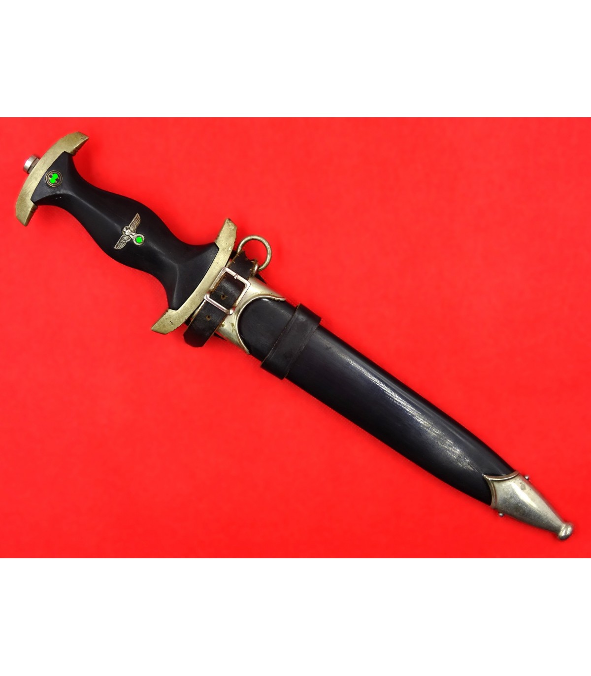 Garnitures maillechort. SS Gruppe II sur garde. Belle poignée sans choc, aigle maillechort. Très belle lame. Laque de fourreau à 100%. Avec attache verticale, mousqueton OLC M5/71. TBE.