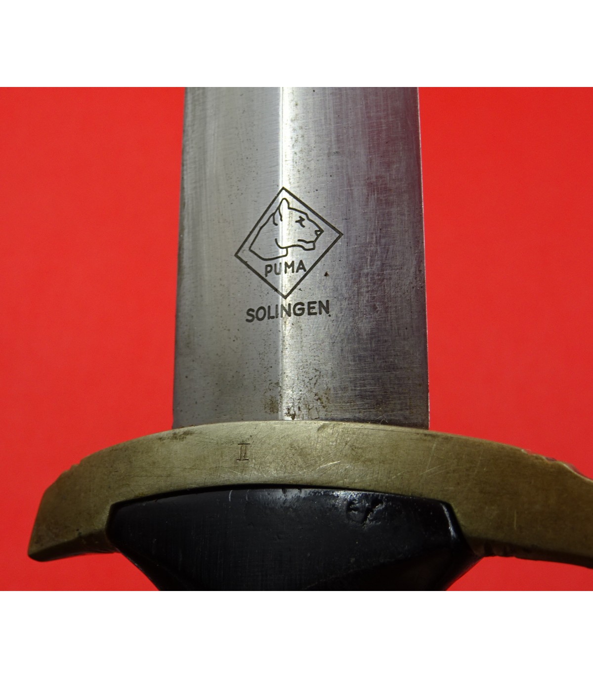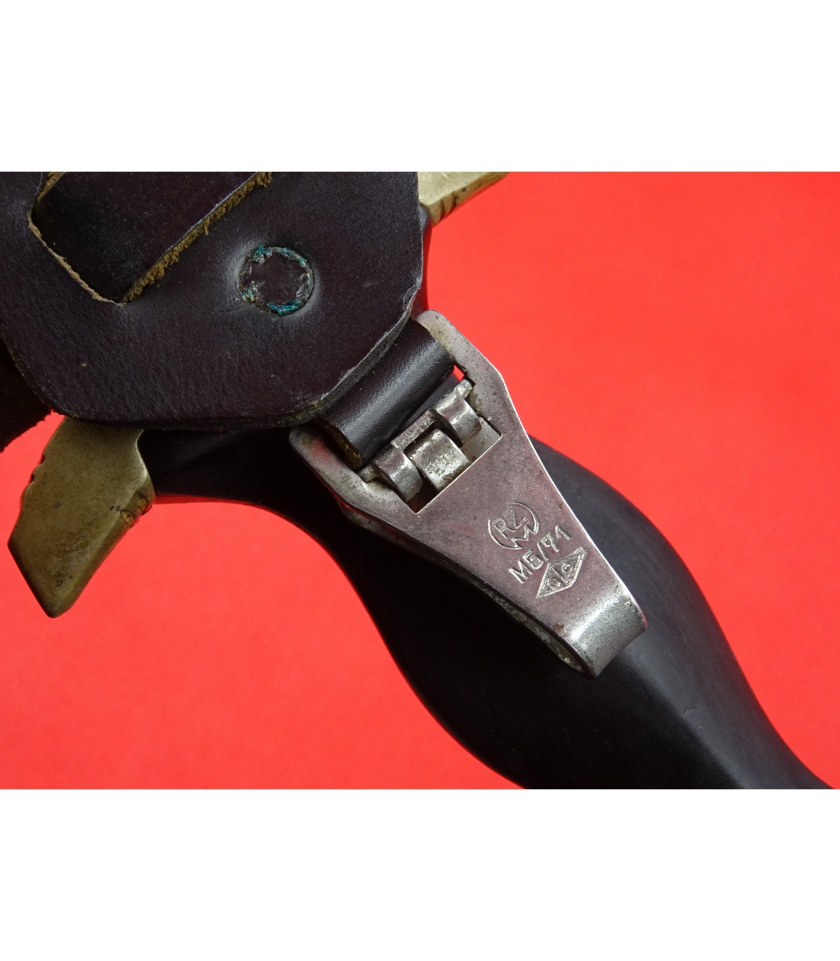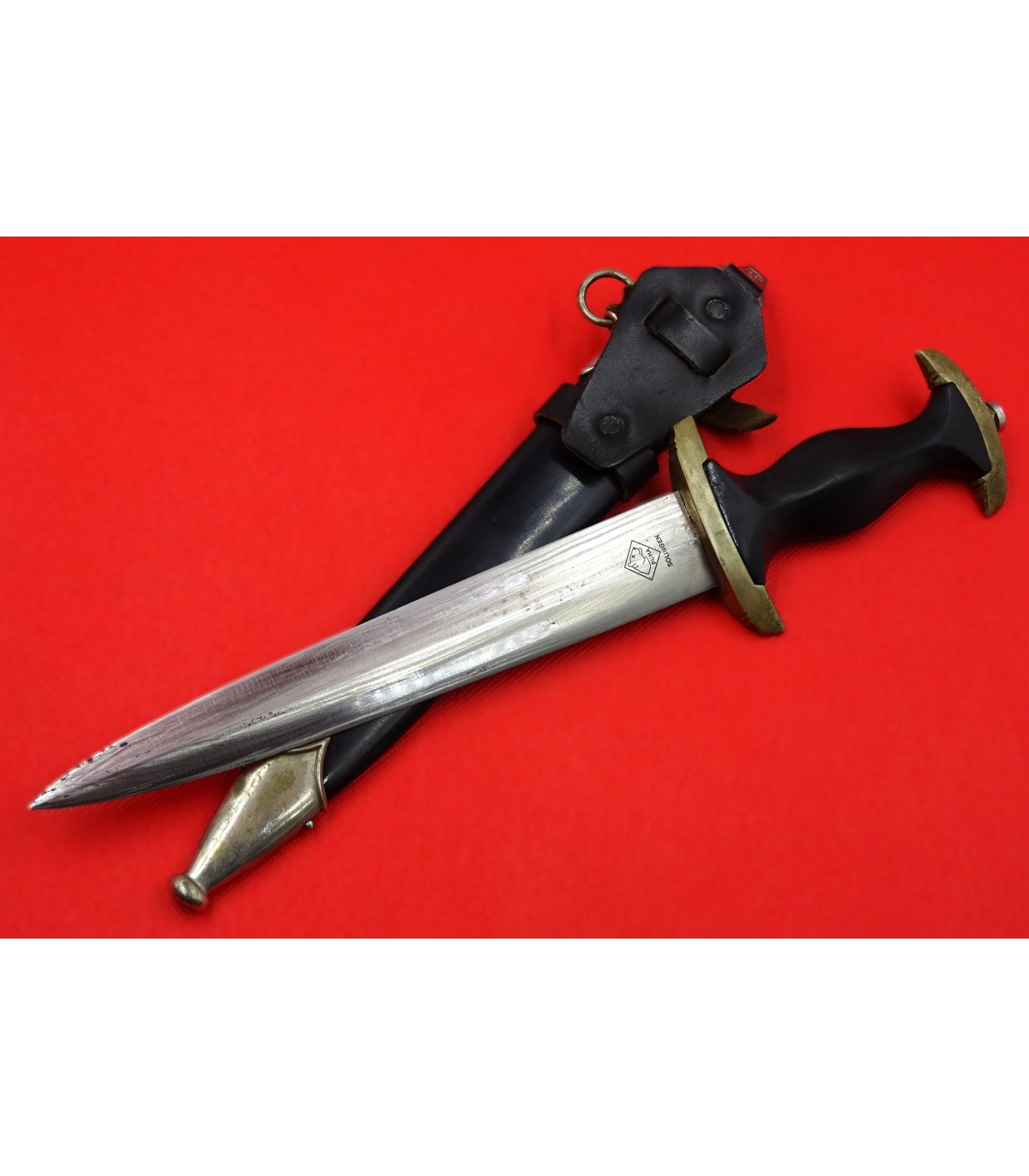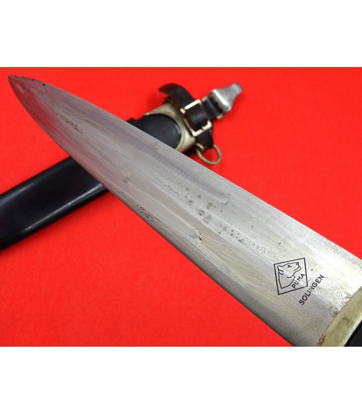 Garnitures maillechort. SS Gruppe II sur garde. Belle poignée sans choc, aigle maillechort. Très belle lame. Laque de fourreau à 100%. Avec attache verticale, mousqueton OLC M5/71. TBE.