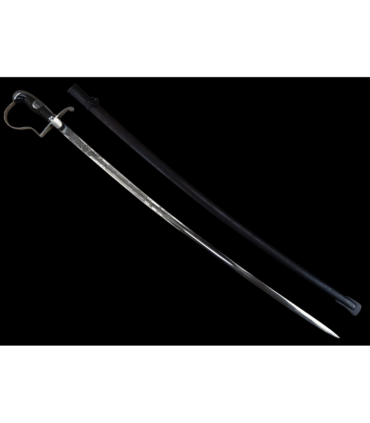 Superbe décor de lame double face. Recto: cavalier sabre au clair et 'Reiter Rgt. N°18'. Verso: charge de cavalerie. La tranche de la lame est également décorée. BE-TBE.