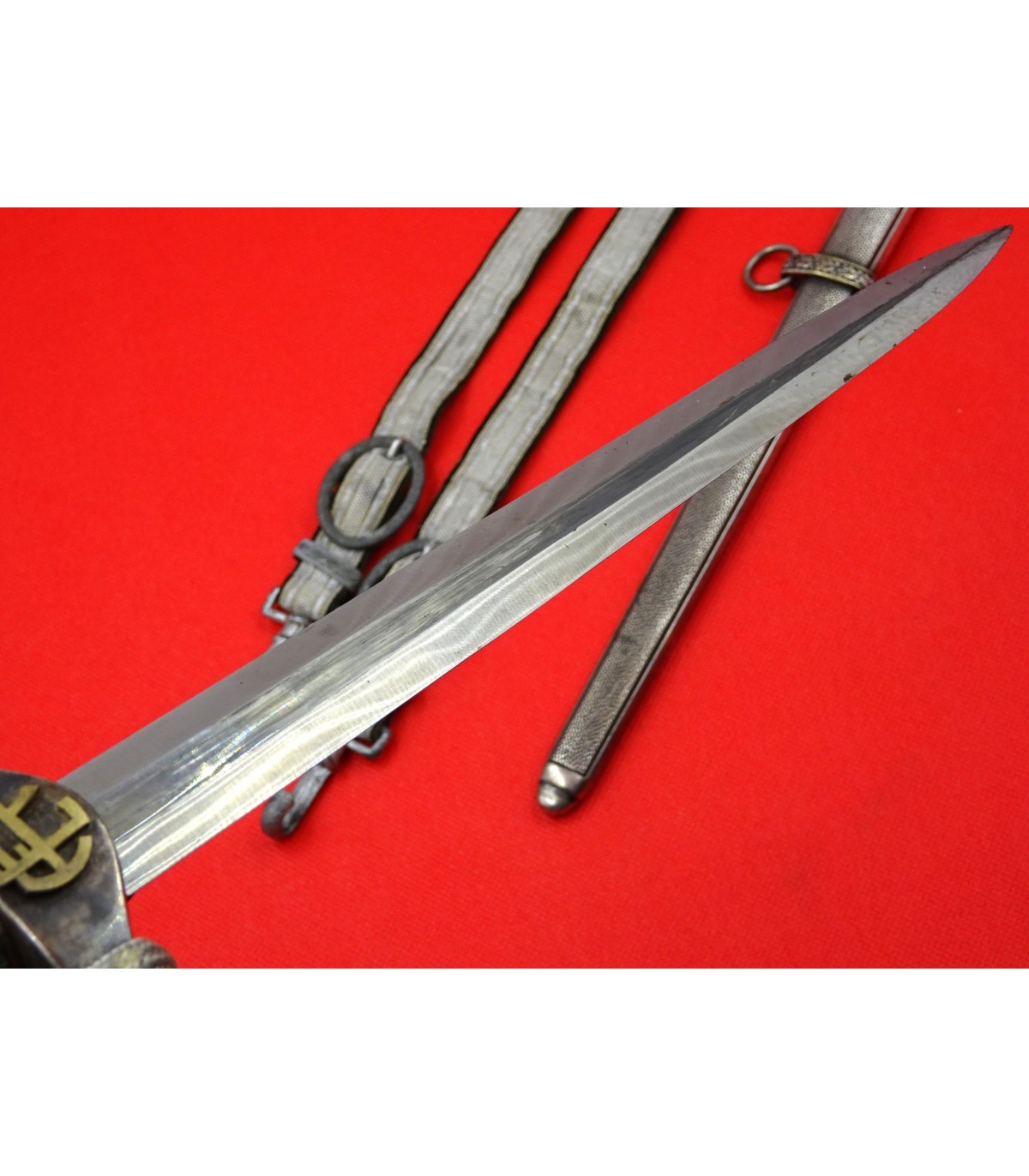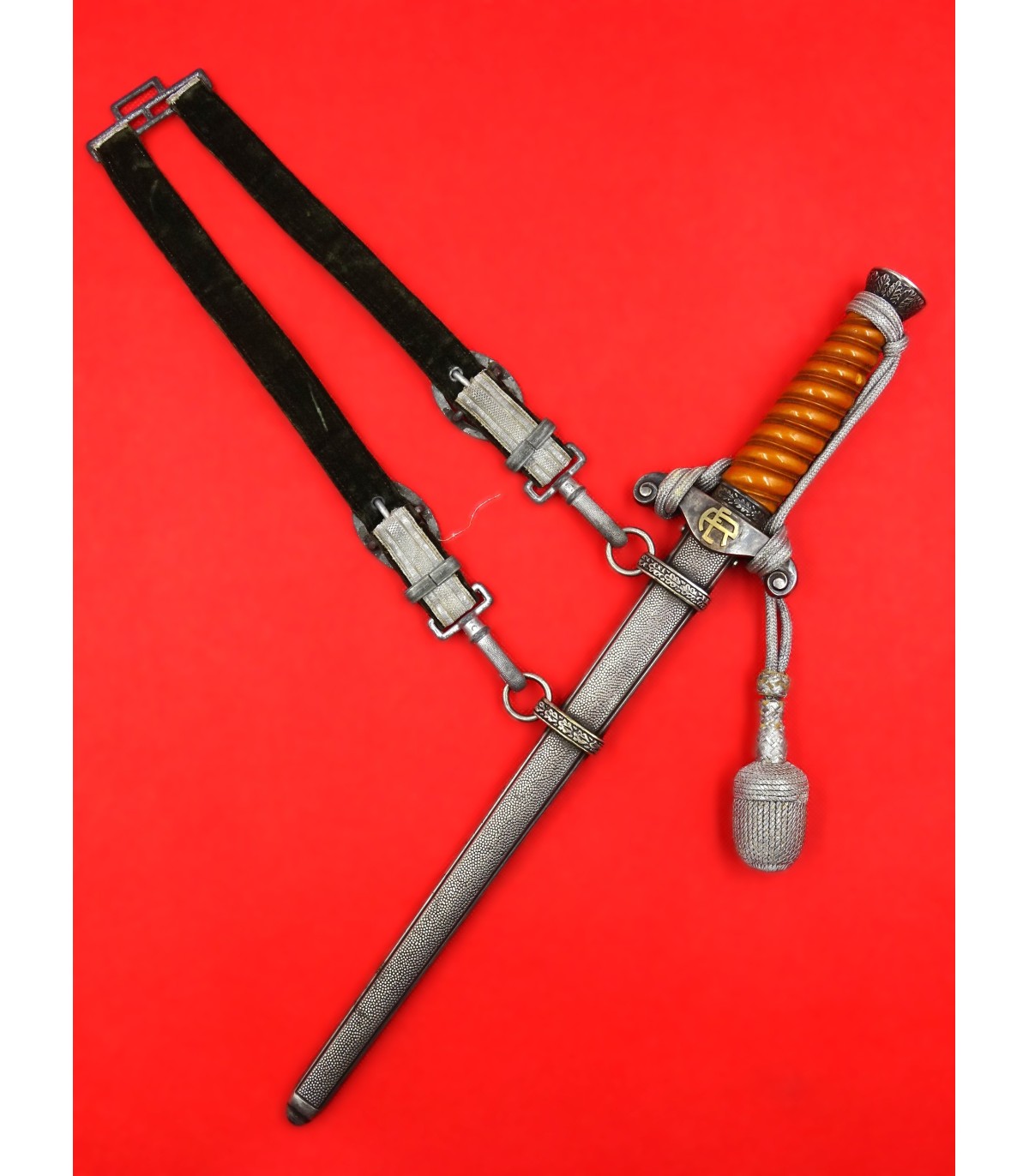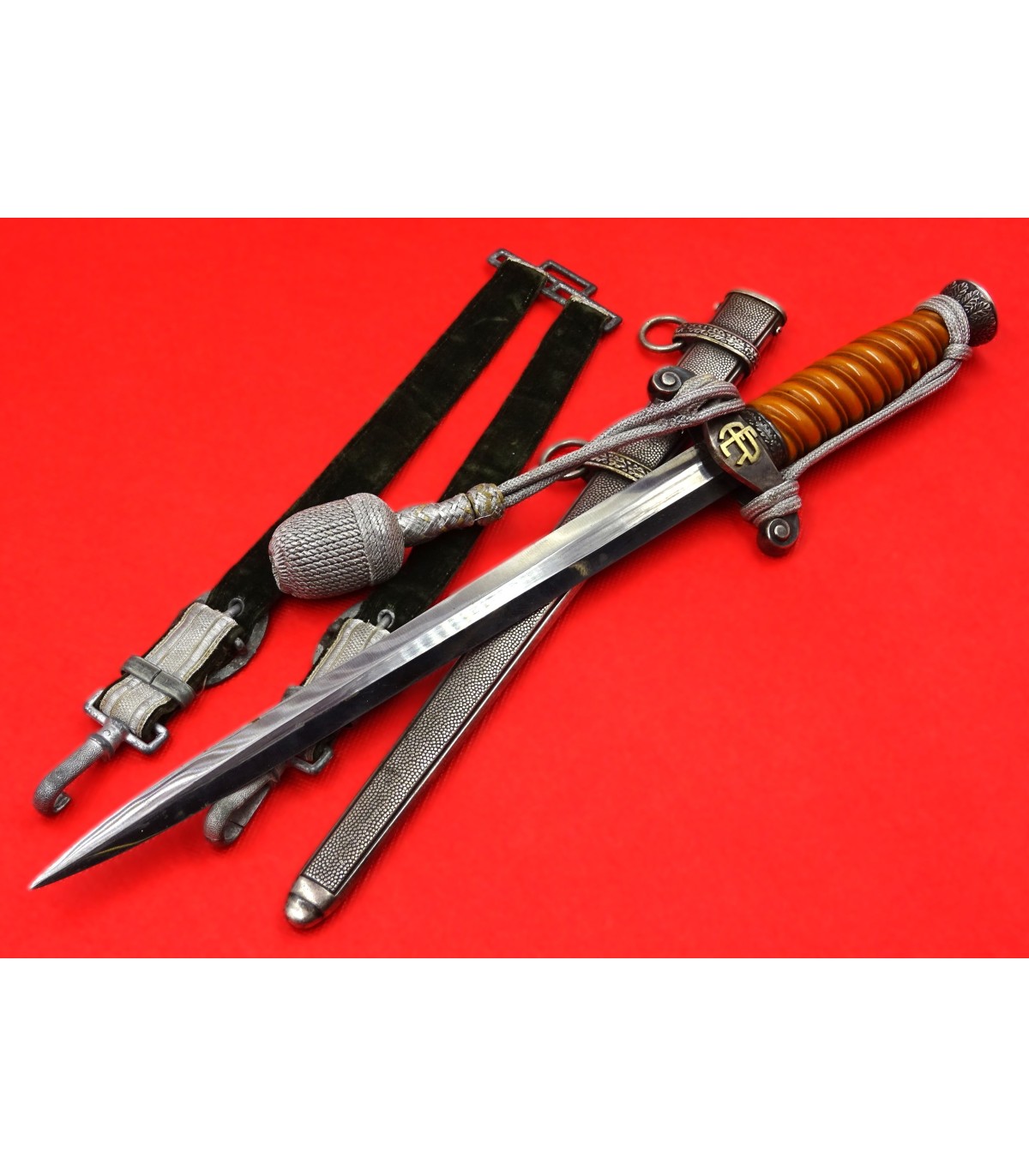 Dague ayant appartenu au général des Panzers Erhard Raus, titulaire de la Croix de chevalier avec feuilles de chêne et de la Croix allemande en or (dont l'uniforme et la casquette sont vendus sous les références HJ001 et HB001). Cette dague avec l'ensemble de la tenue étaient présentés au AAF Tank Museum de Danville VA. USA jusqu'à la fermeture du musée en 2022. Pour la biographie du Generaloberst E.Raus, voir: https://fr.wikipedia.org/wiki/Erhard_Raus