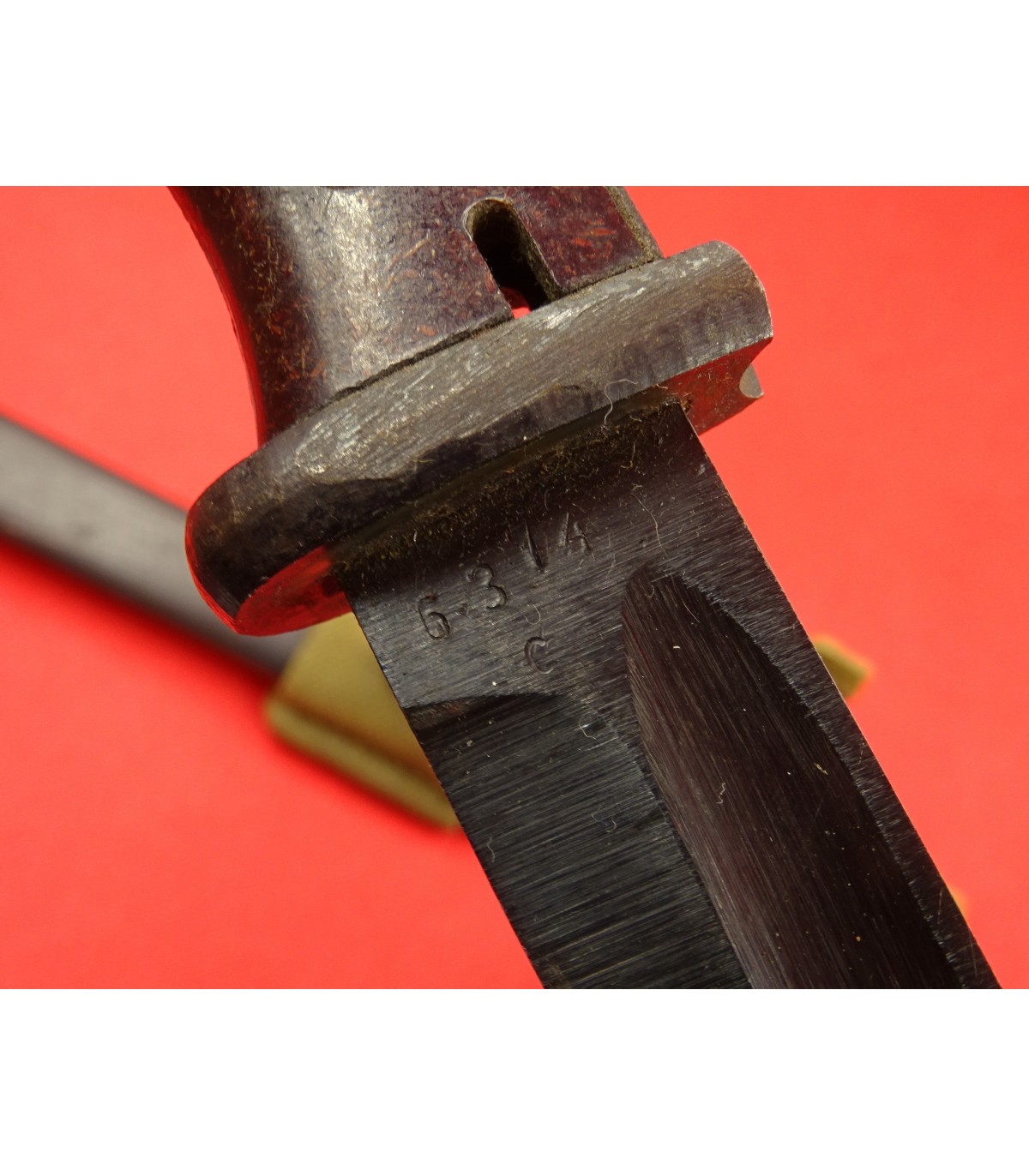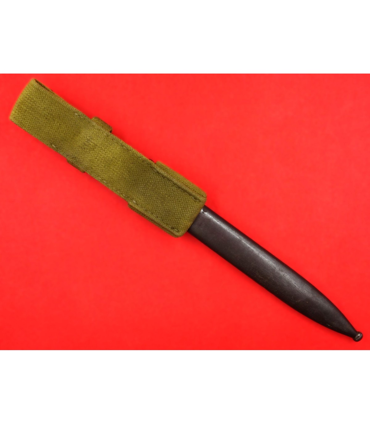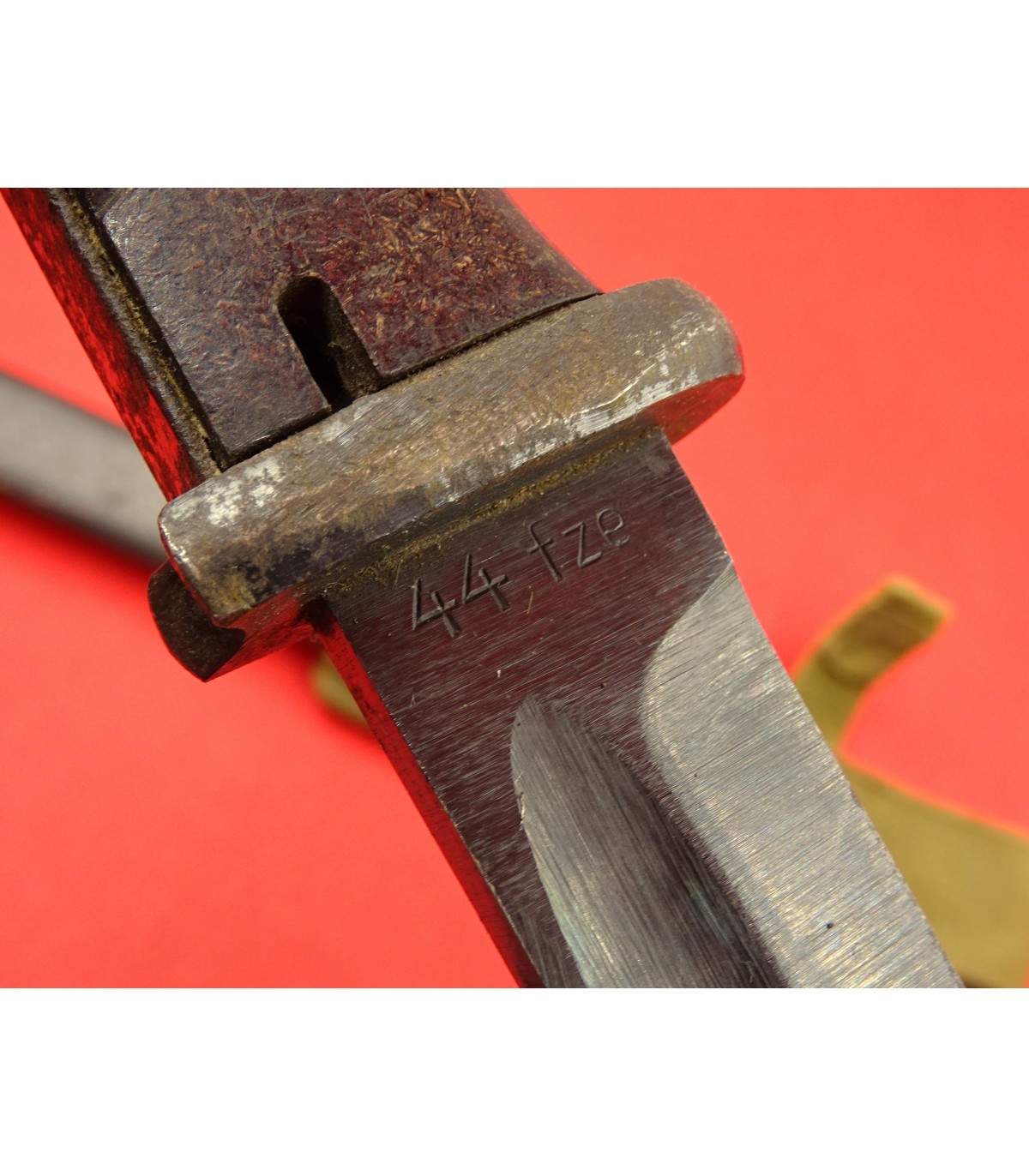 Belle baïonnette à plaquettes bakélite, fabricant FZE44, duo matricule, superbe lame, avec gousset en toile vert-olive. TBE.