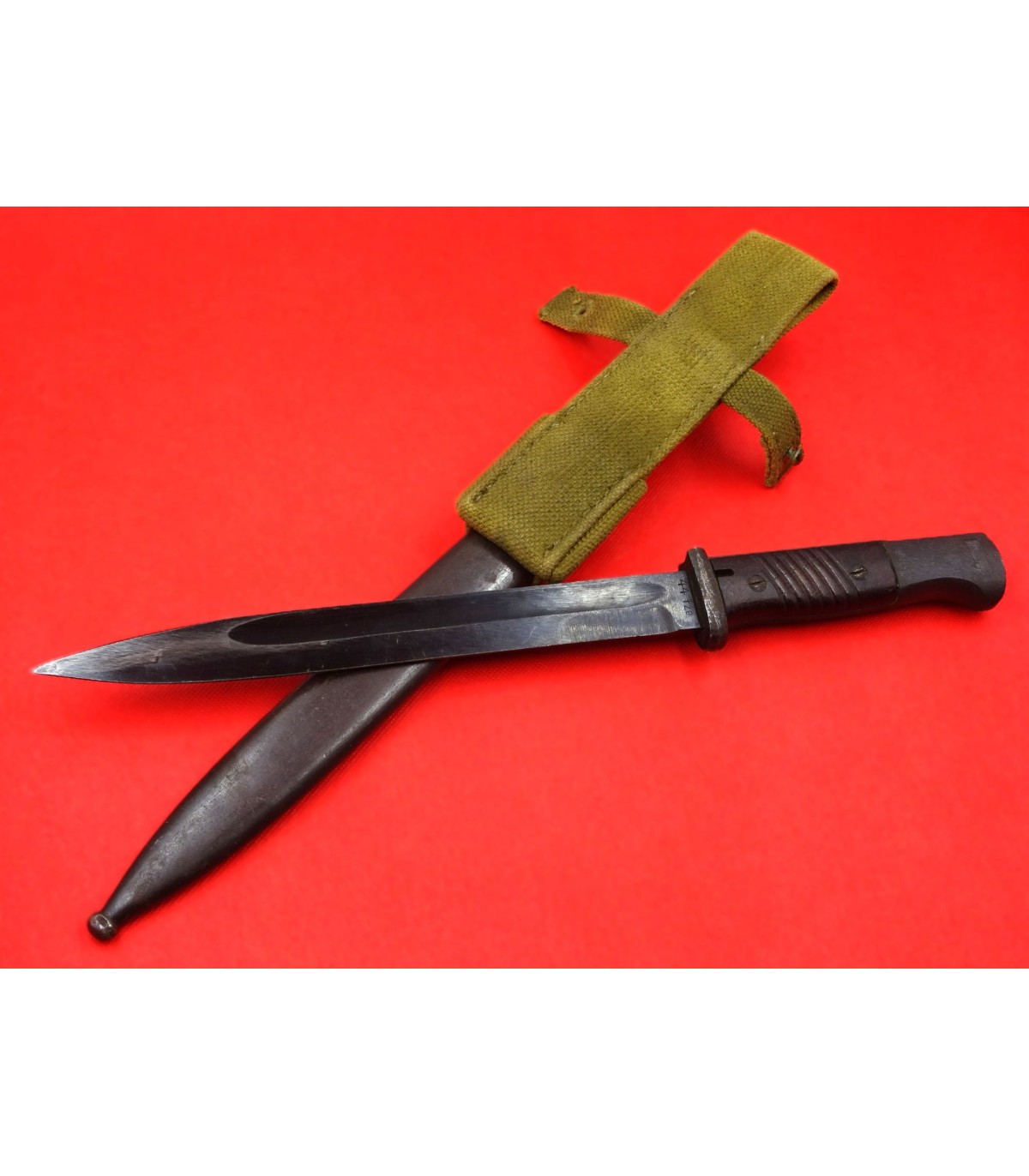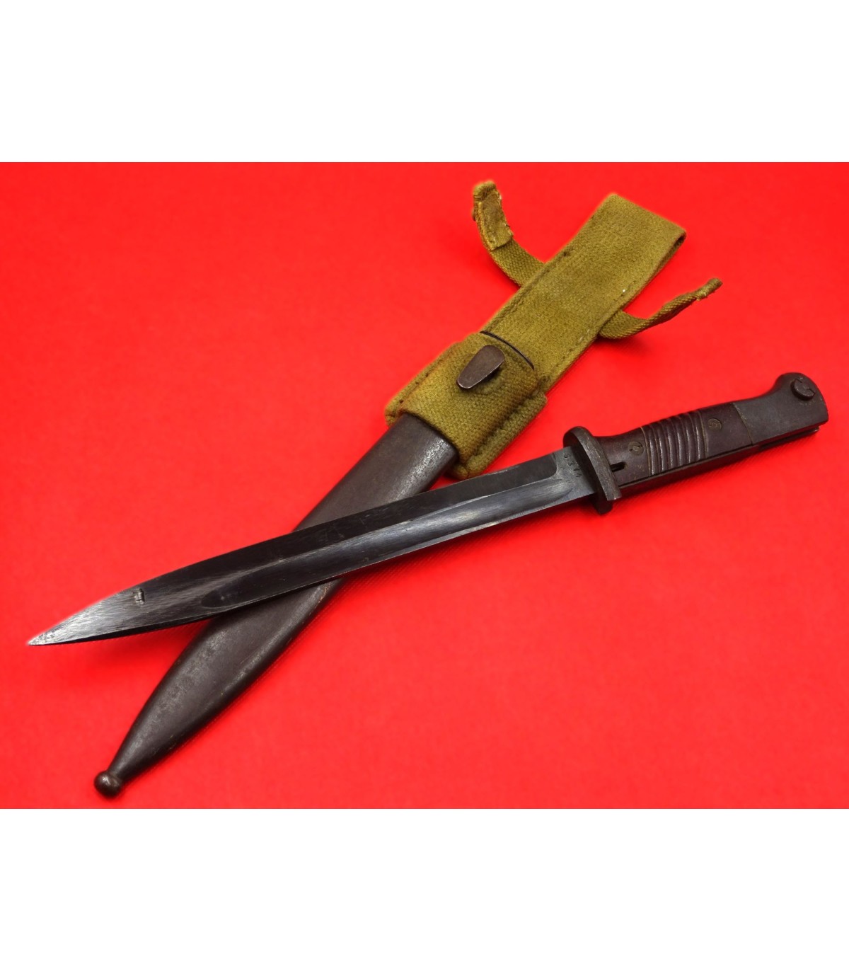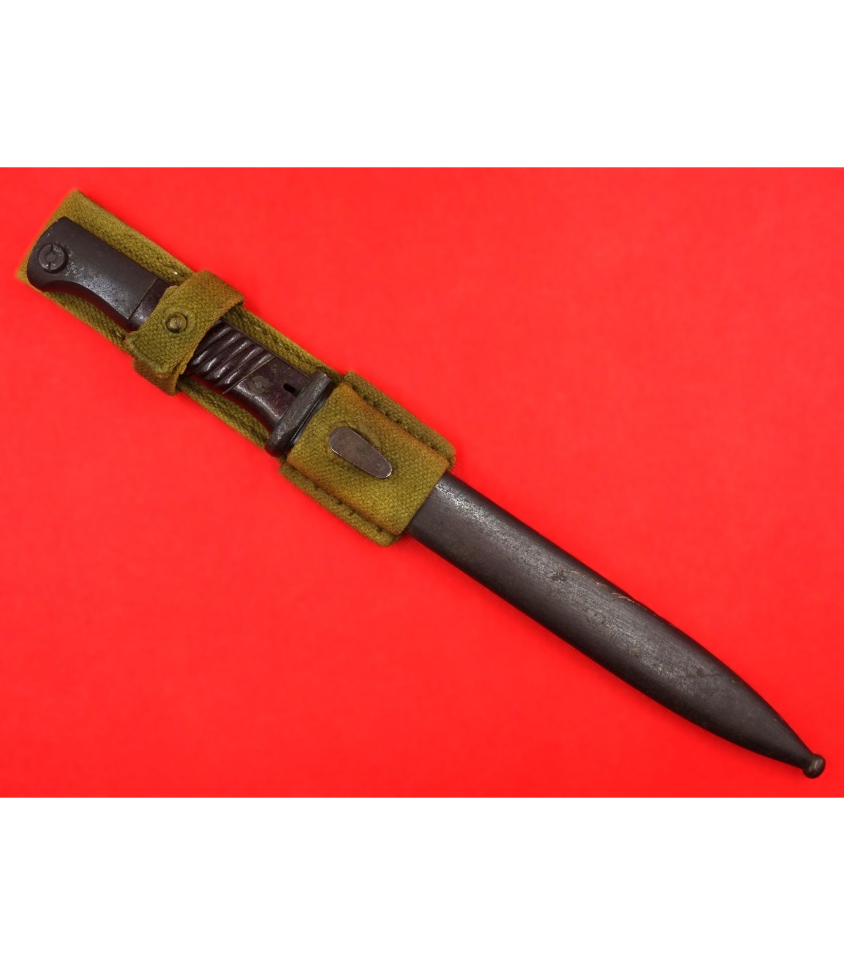 Belle baïonnette à plaquettes bakélite, fabricant FZE44, duo matricule, superbe lame, avec gousset en toile vert-olive. TBE.