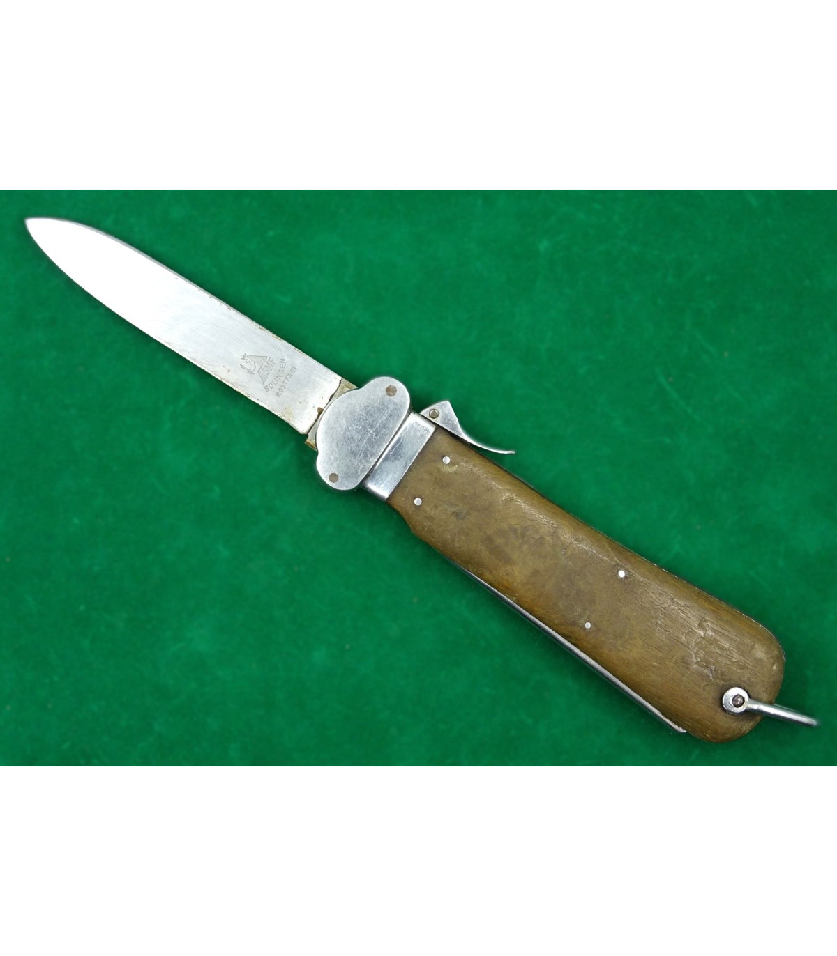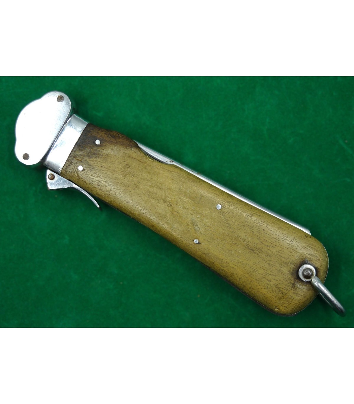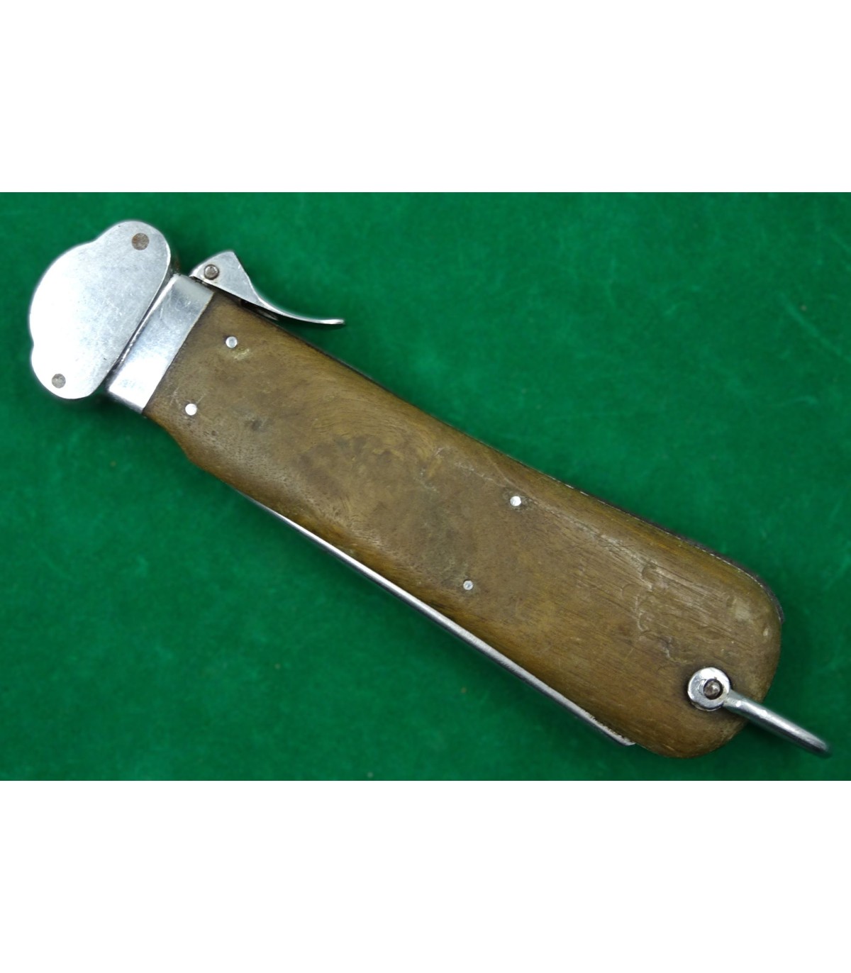 1er modèle. Marquage de réception sur le talon du poinçon et n°122 sur le côté du verrou. Lame affûtée. Faiblesse dans le ressort de poinçon. A manipuler avec une certaine précaution. BE.