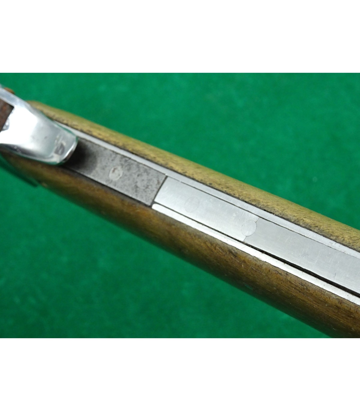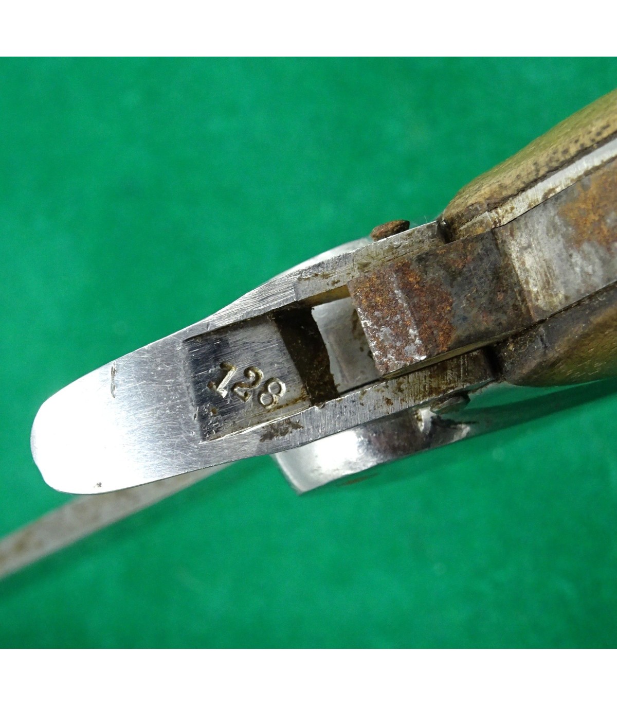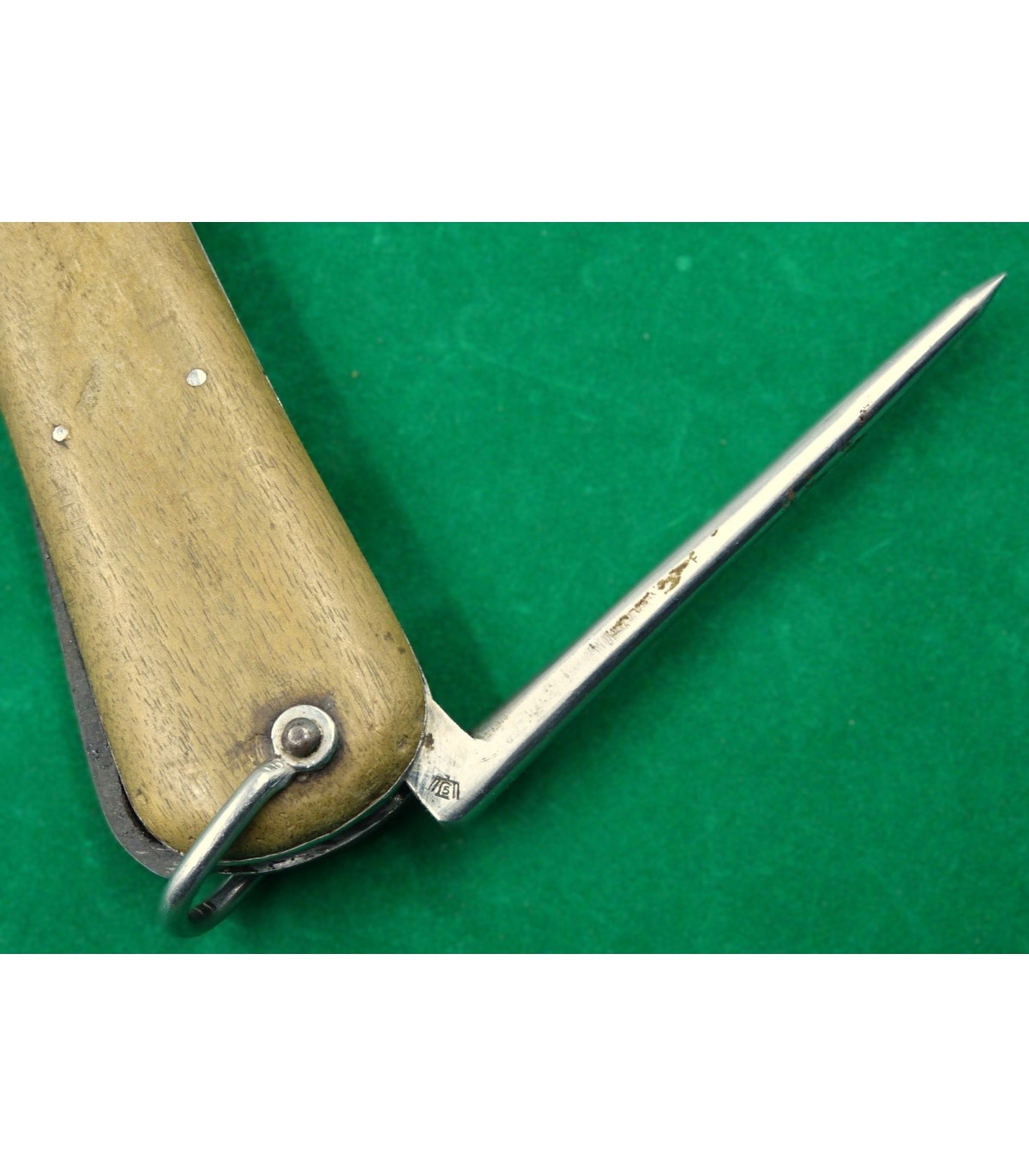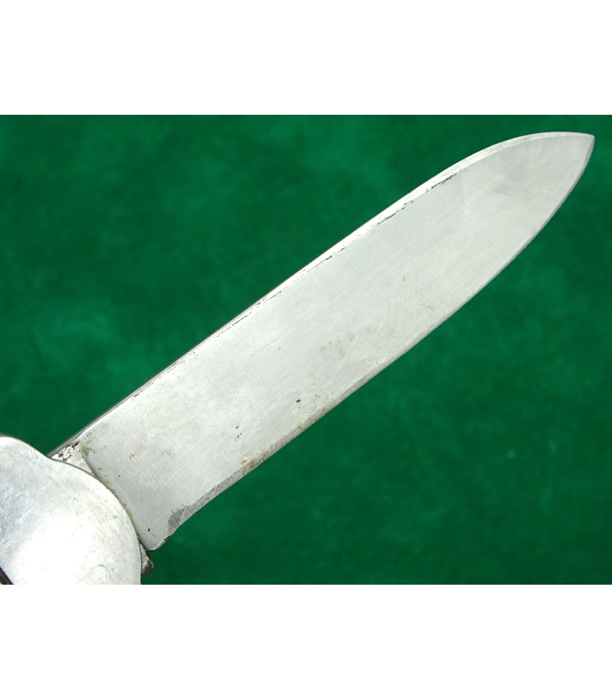 1er modèle. Marquage de réception sur le talon du poinçon et n°122 sur le côté du verrou. Lame affûtée. Faiblesse dans le ressort de poinçon. A manipuler avec une certaine précaution. BE.