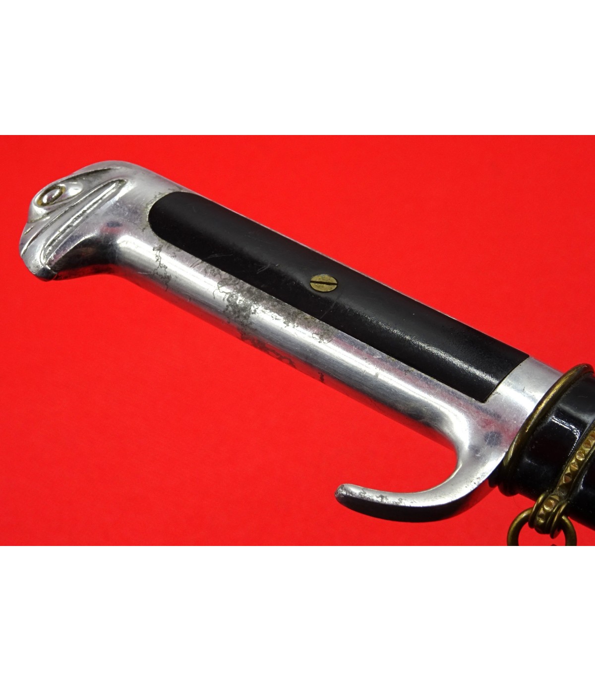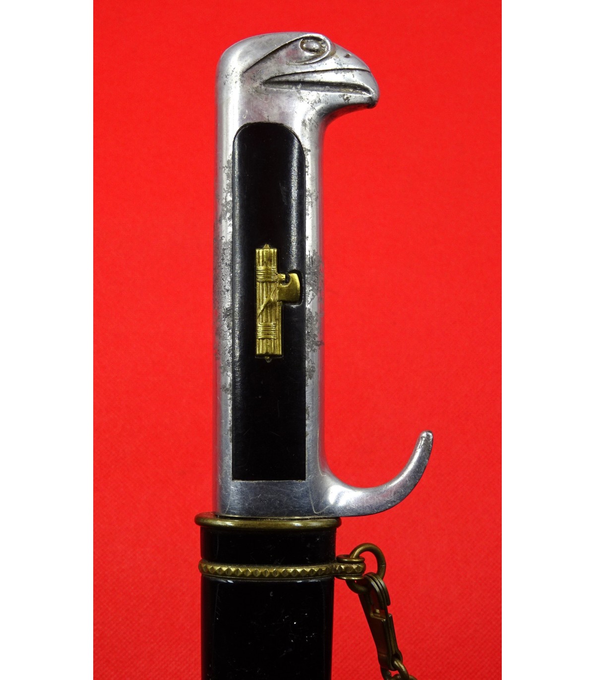 Bel exemplaire avec bracelets de bélière ouvragés et boule de boutterole séparée, signe des cadres de haut rang. Superbe lame, laque de fourreau à près de 100%. Plaquettes ébonite noire avec faisceau or, poignée alu. Chainette avec mousqueton SPQR à l'aigle. TBE.