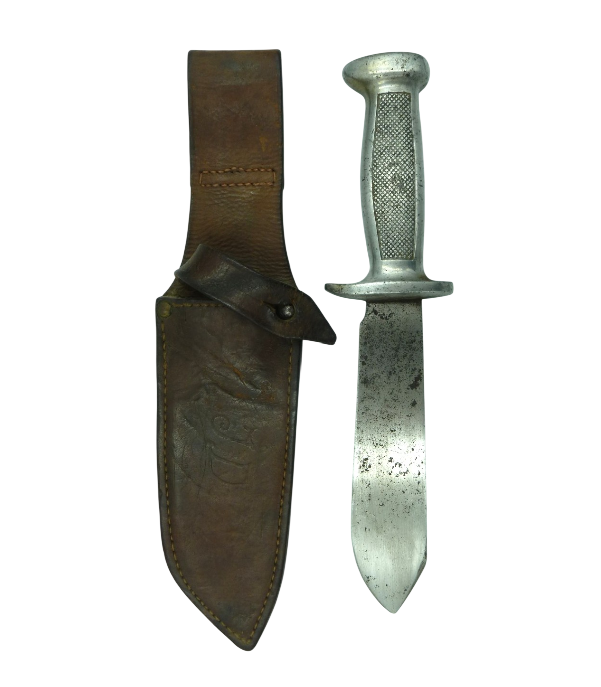 Poignée alu, fourreau cuir. Lame oxydée à nettoyer. Initiales JD gravées sur le fourreau. BE.